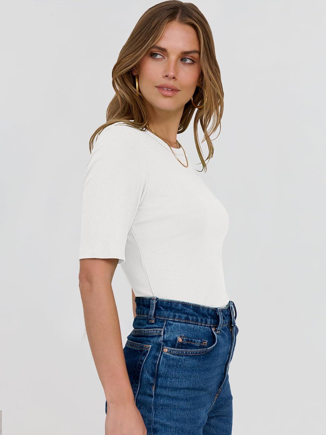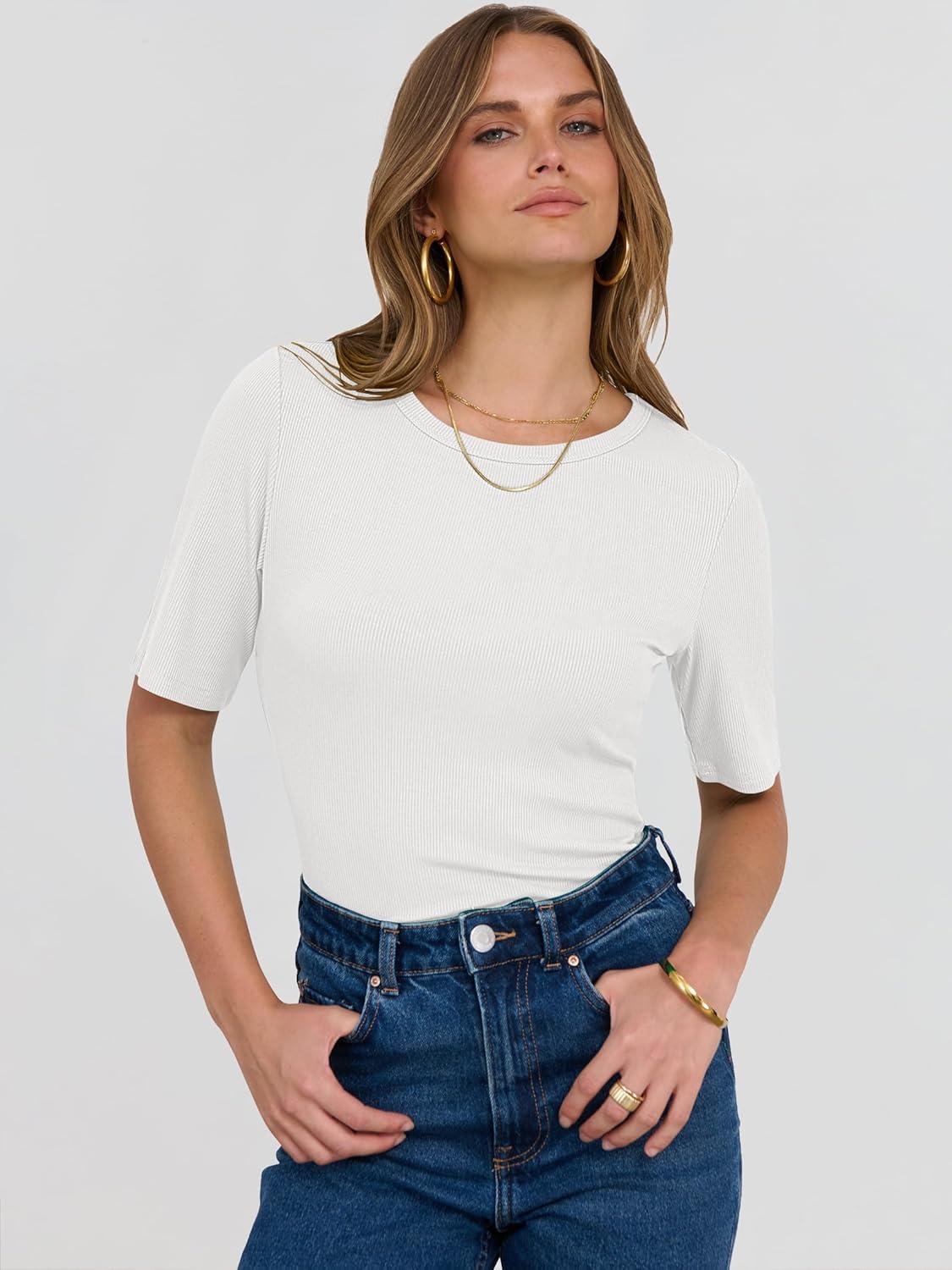 ANRABESS Womens Half Sleeve Crewneck Tops Ribbed Knit Slim Fit Shirts Basic Tee 2025 Spring Summer Dressy Casual T-Shirts(White)
