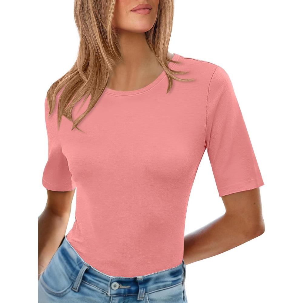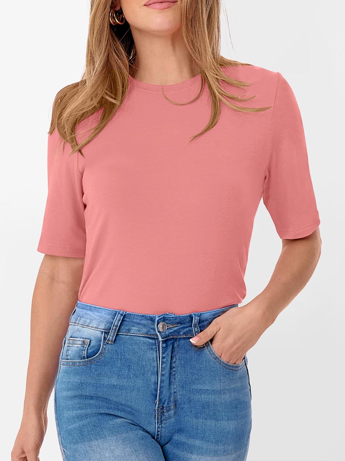 Womens Summer Basic Tees Made of 68%Polyester 27%Rayon 5%Elastane Soft Material. These Tops Have 1/2 Sleeve, Basics Feature. Perfect for Daily Wear, School, Office, Dating, Travelling, Family Gatherings, Going Out, Etc. basic tees for women/casual tops for women/womens business casual tops/womens casual tops/tee shirts womens.