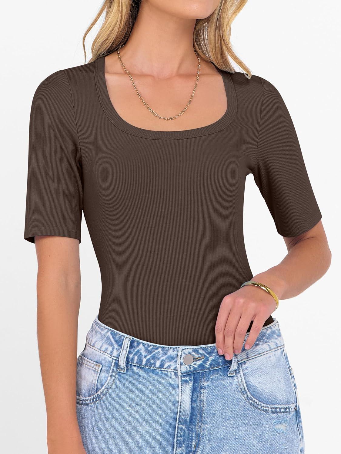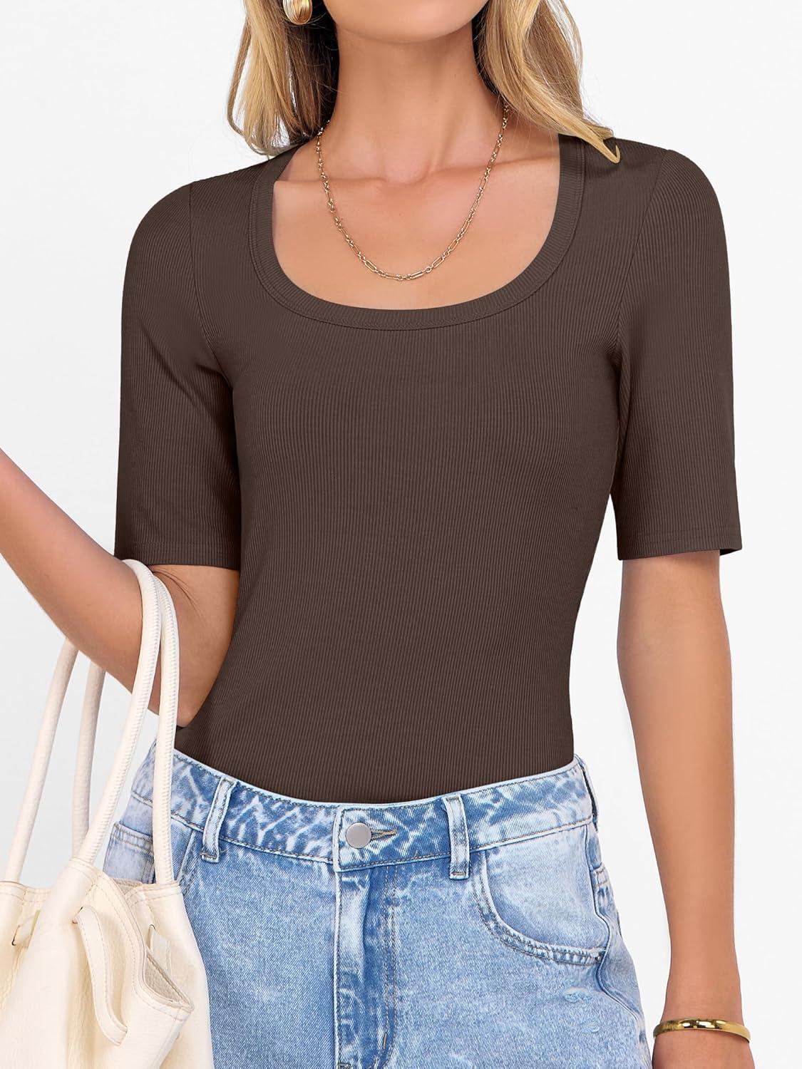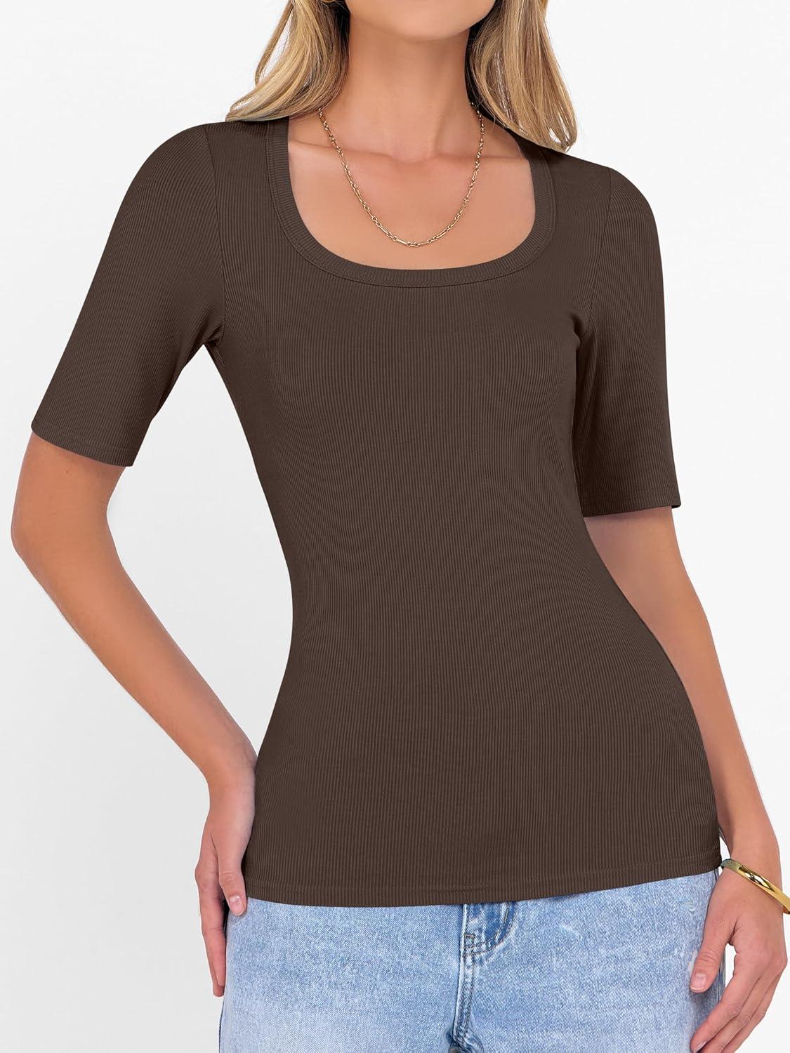 ANRABESS Womens Half Sleeve Tops Scoop Neck Ribbed Knit Slim Fitted Basic Tee Shirts Summer 2025 Trendy Fall Casual Clothes(Coffee)