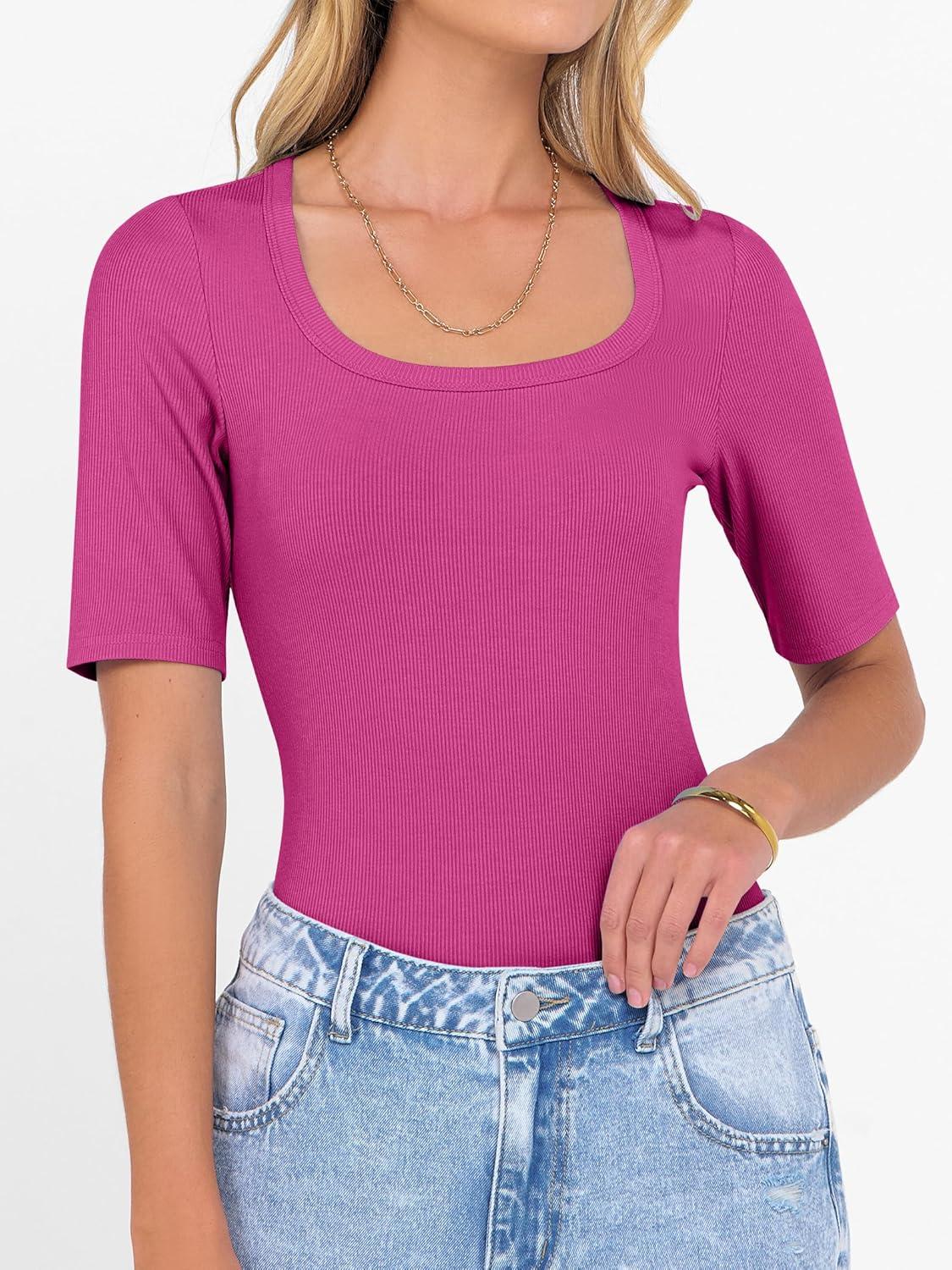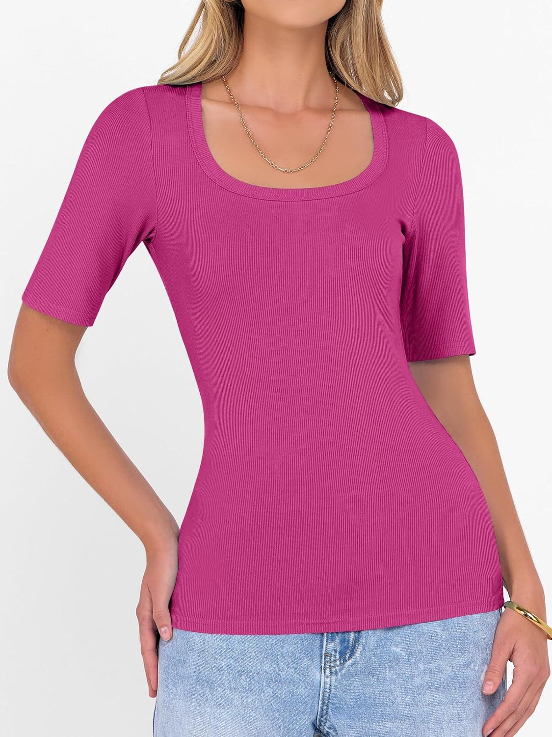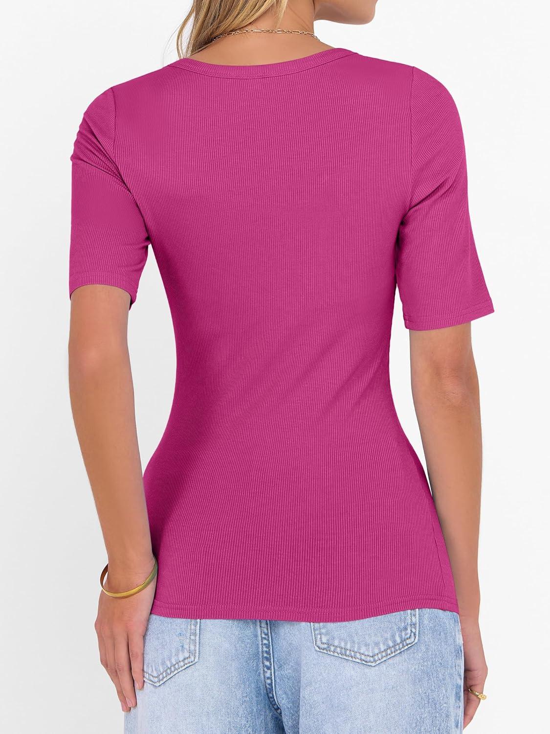 ANRABESS Womens Half Sleeve Tops Scoop Neck Ribbed Knit Slim Fitted Basic Tee Shirts Summer 2025 Trendy Fall Casual Clothes(Hot Pink)