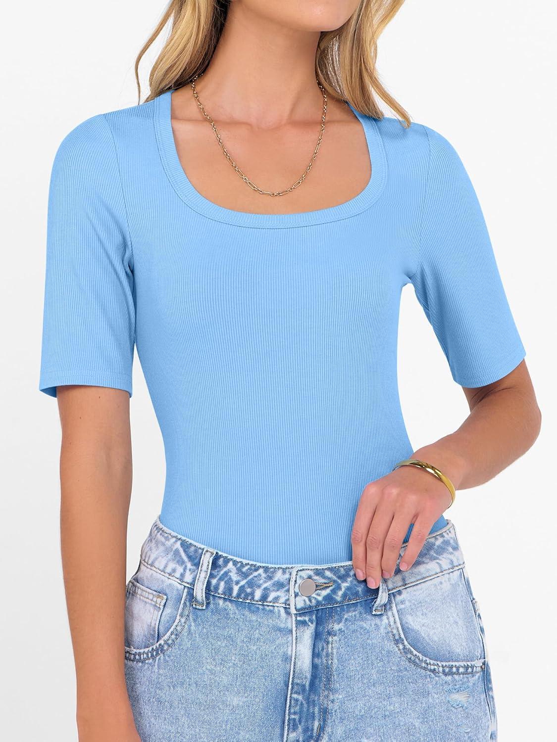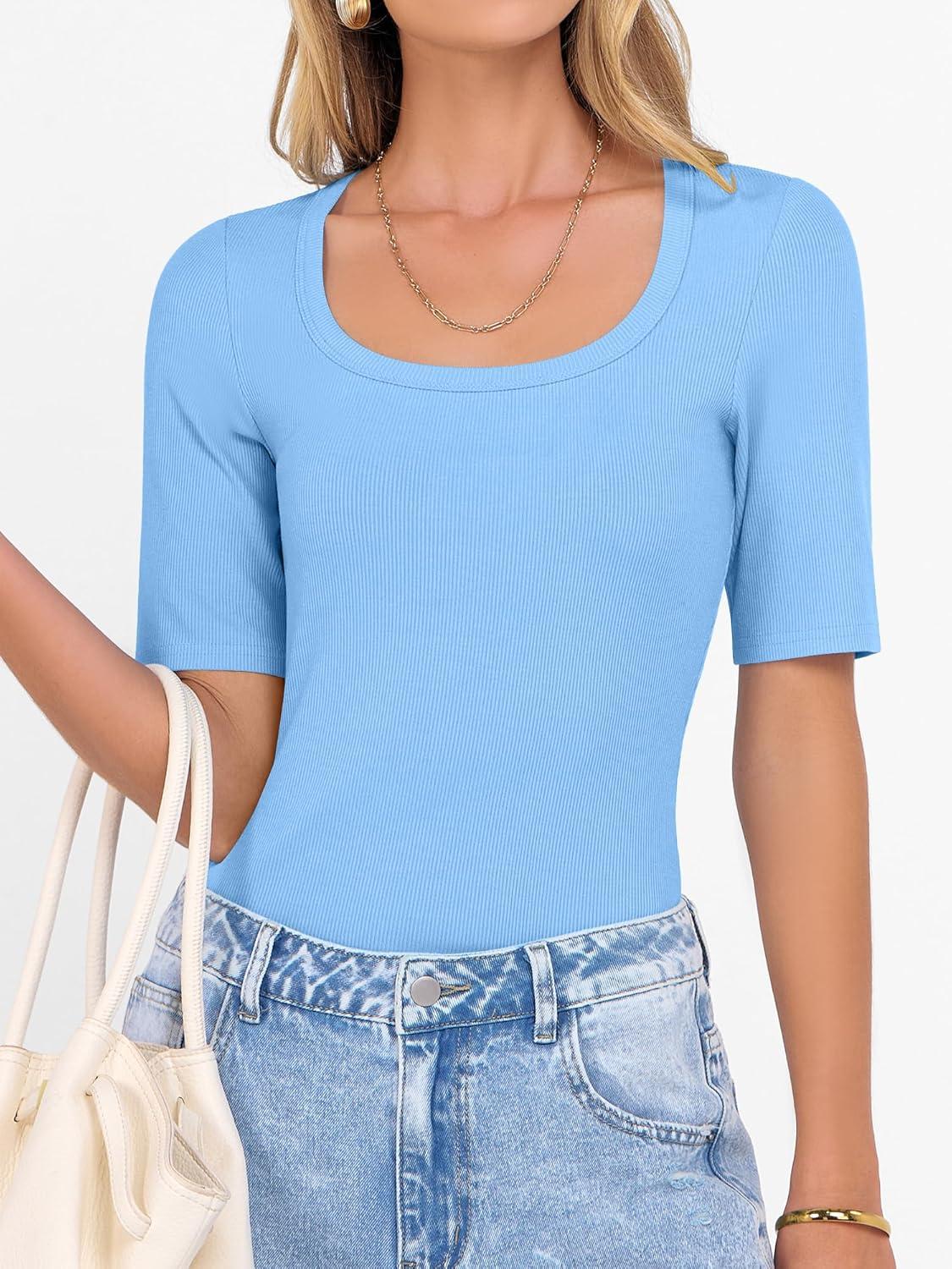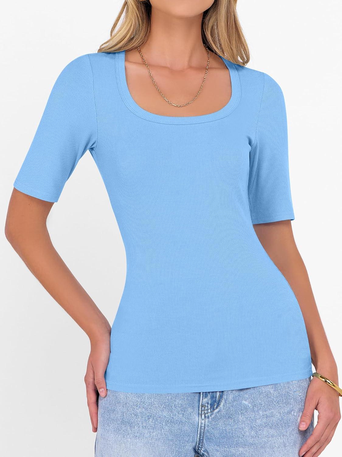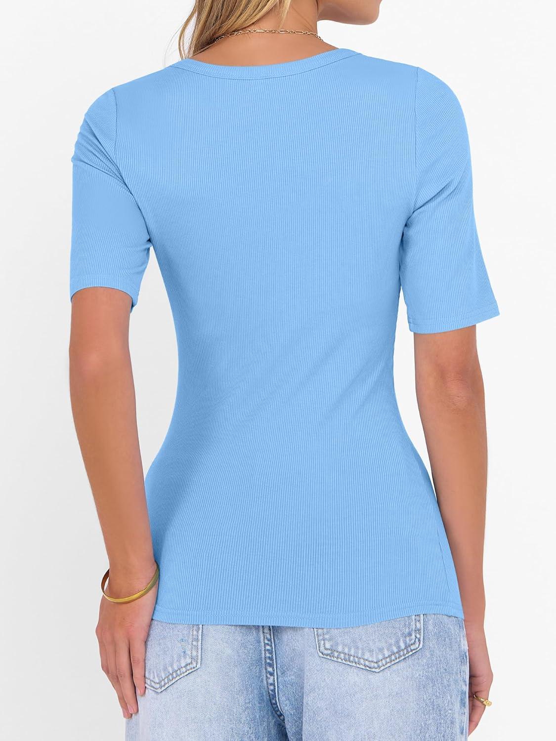 ANRABESS Womens Half Sleeve Tops Scoop Neck Ribbed Knit Slim Fitted Basic Tee Shirts Summer 2026 Trendy Spring Casual Clothes(Sky Blue)