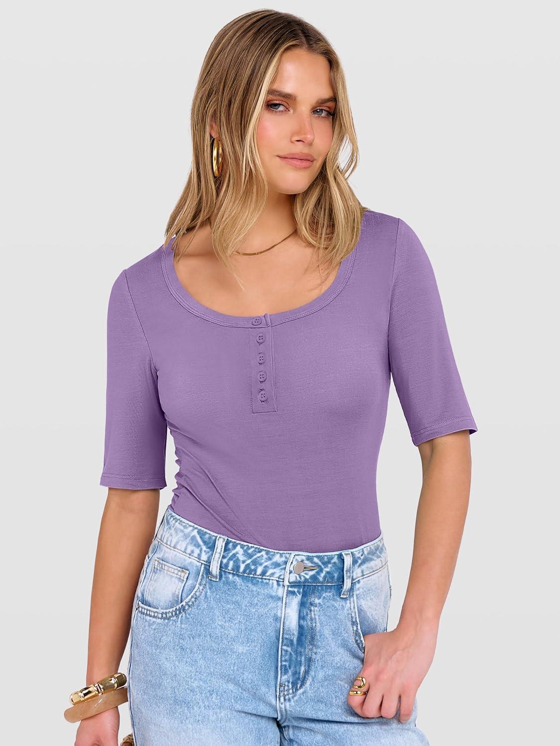 ANRABESS Womens Half Sleeve Tops Summer Slim Fitted Henley Shirts 2026 Spring Basic Tees Dressy Casual Blouses Cute T Shirt(Bright Purple)