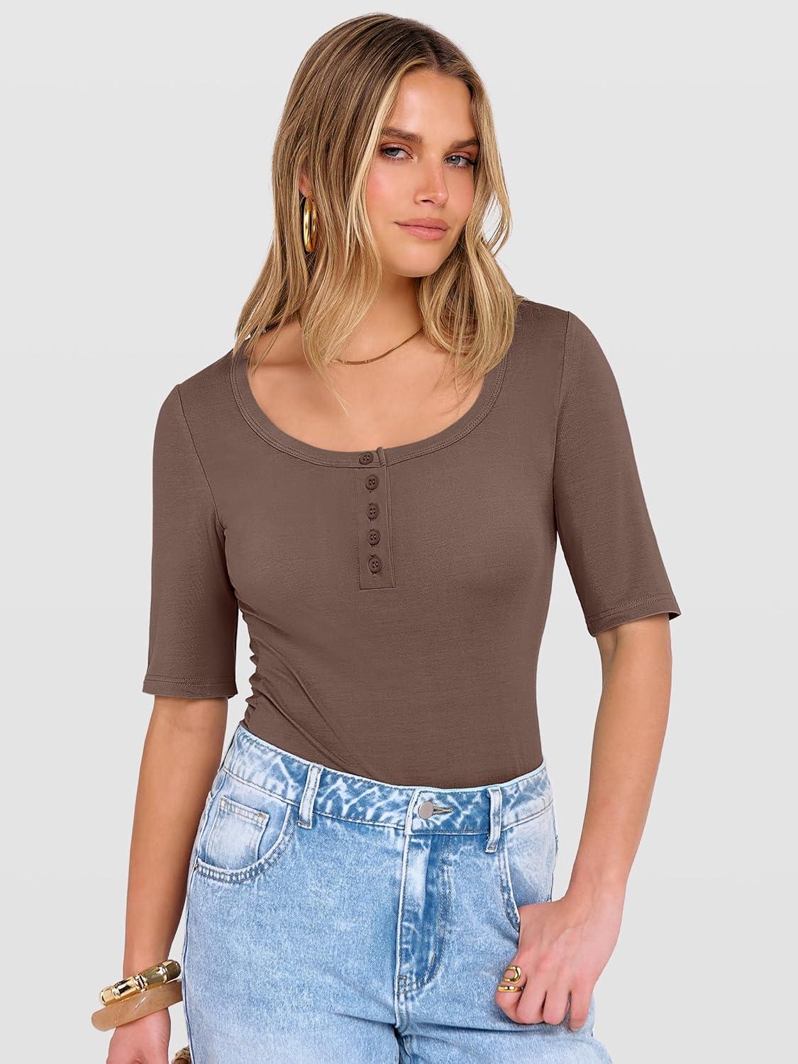 imageANRABESS Womens Half Sleeve Tops Summer Slim Fitted Henley Shirts 2026 Spring Basic Tees Dressy Casual Blouses Cute T ShirtBrown