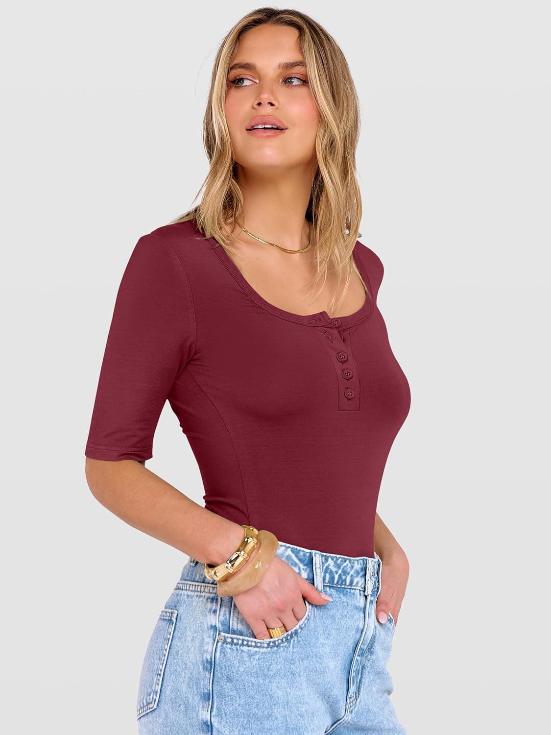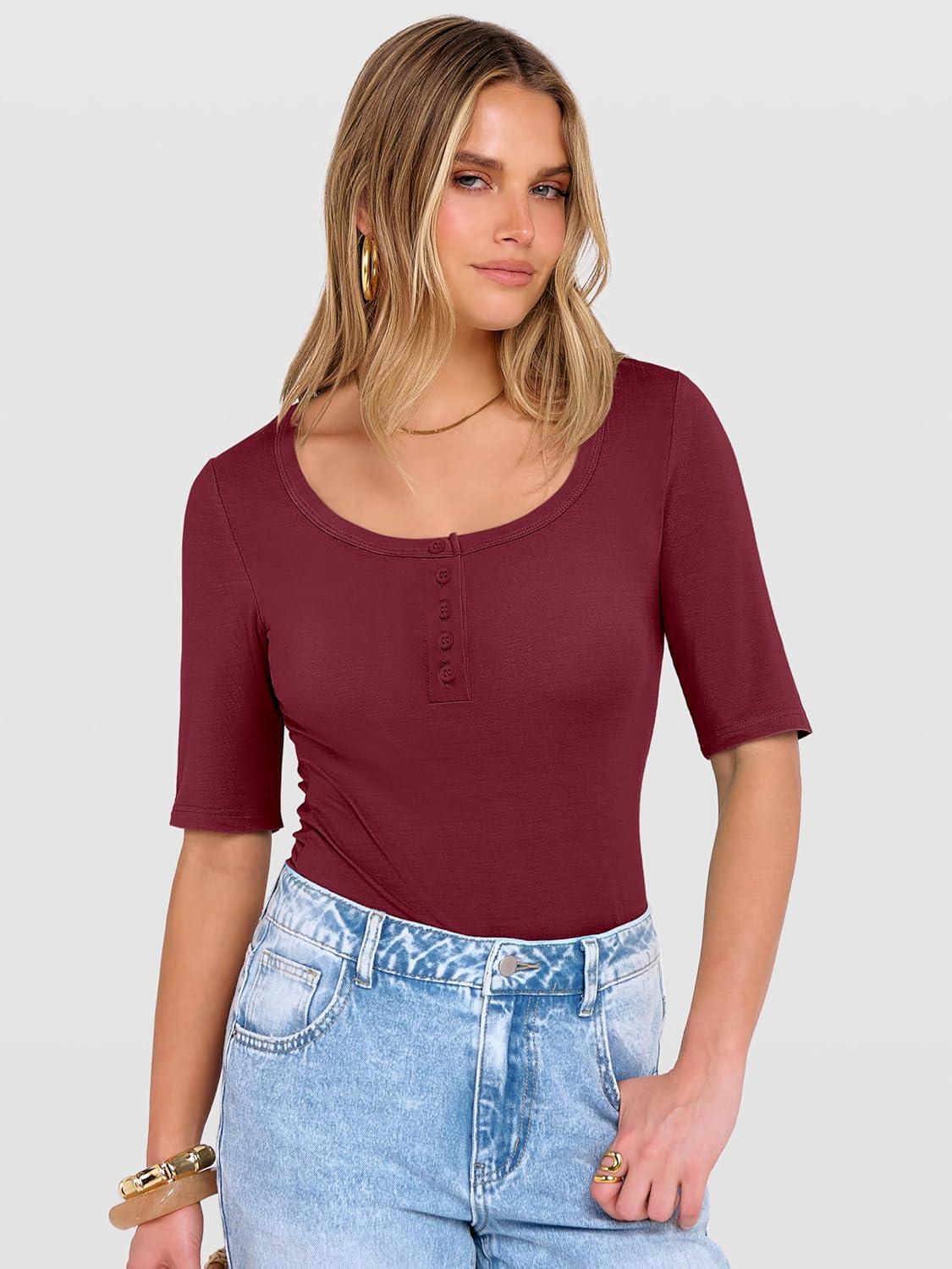 ANRABESS Womens Half Sleeve Tops Summer Slim Fitted Henley Shirts 2026 Spring Basic Tees Dressy Casual Blouses Cute T Shirt(Red)