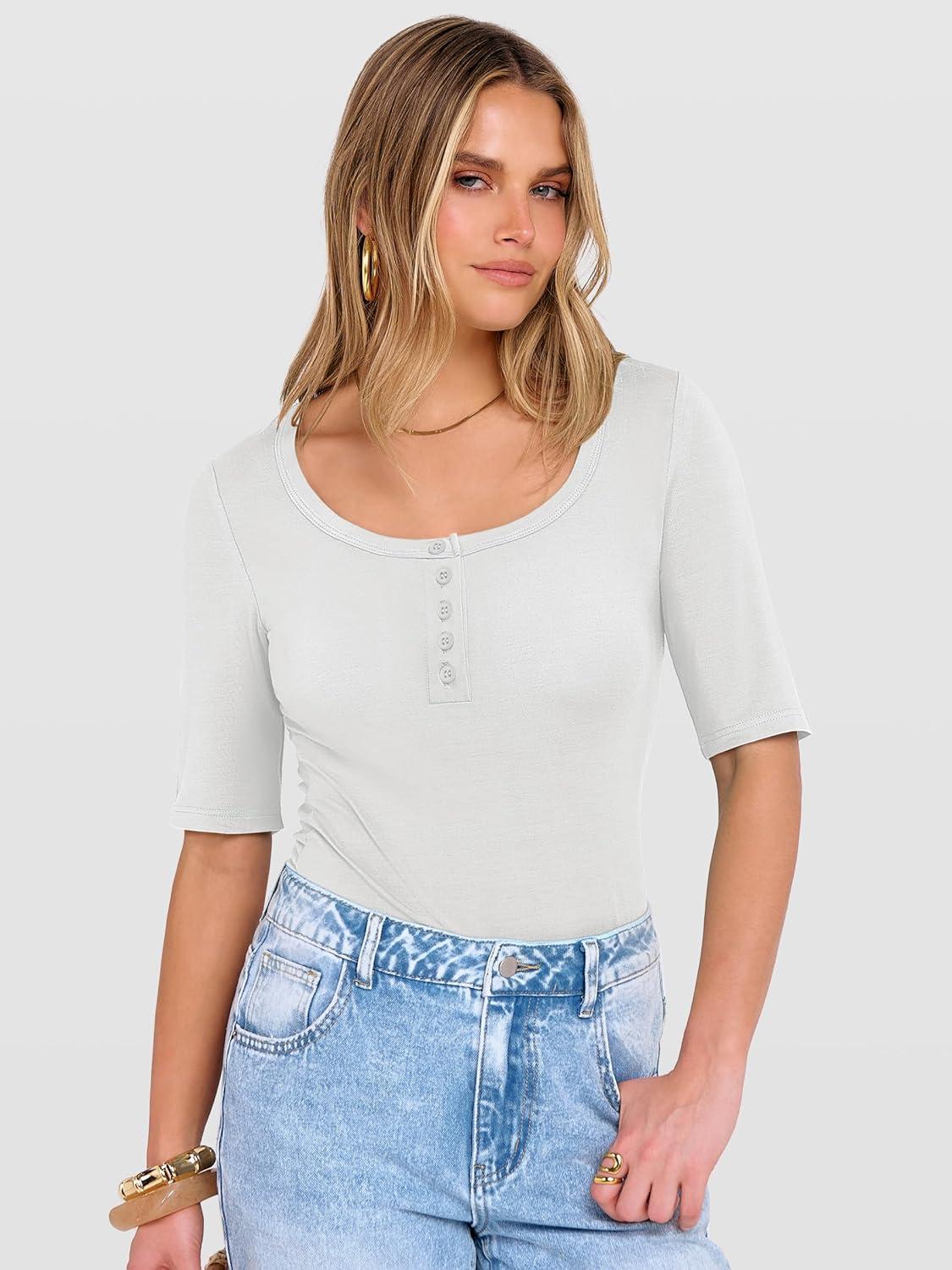 imageANRABESS Womens Half Sleeve Tops Summer Slim Fitted Henley Shirts 2026 Spring Basic Tees Dressy Casual Blouses Cute T ShirtWhite