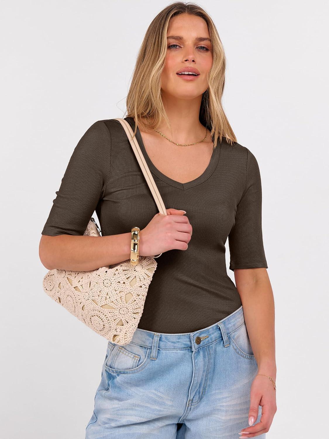 imageANRABESS Womens Half Sleeve Tops V Neck Ribbed Knit Slim Fit Basic T Shirts 2026 Summer Casual Tees Spring Trendy ClothesCoffee