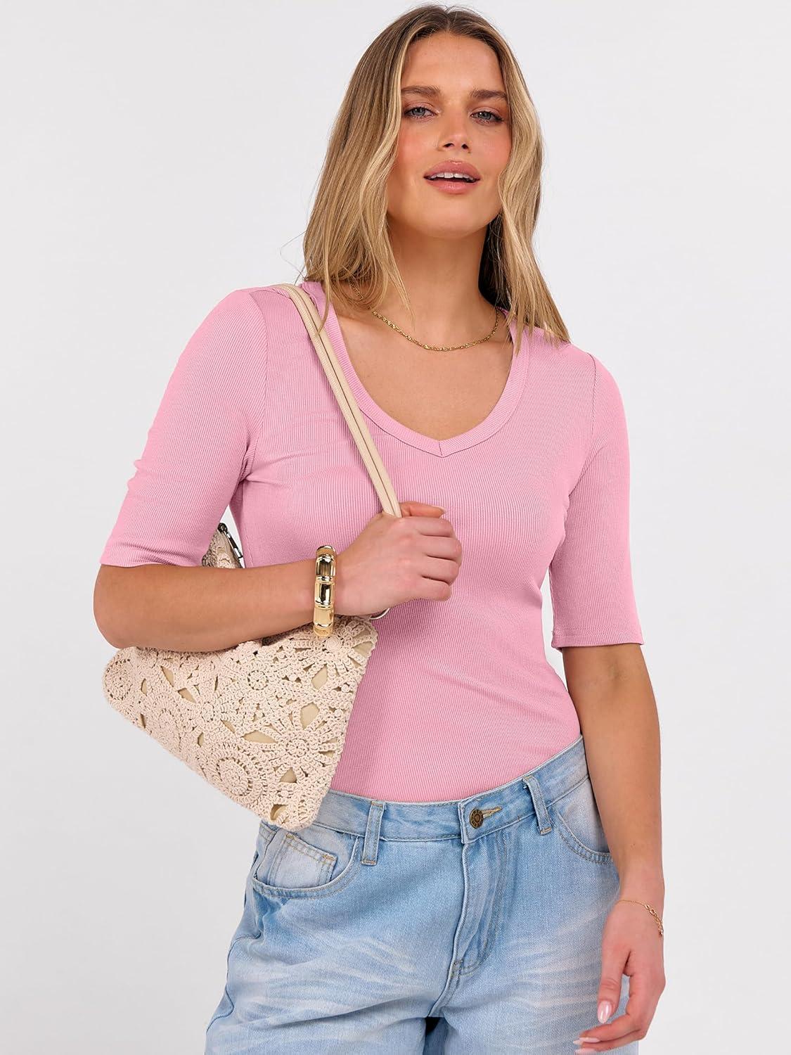 ANRABESS Womens Half Sleeve Tops V Neck Ribbed Knit Slim Fit Basic T Shirts 2026 Summer Casual Tees Spring Trendy Clothes(Pink)