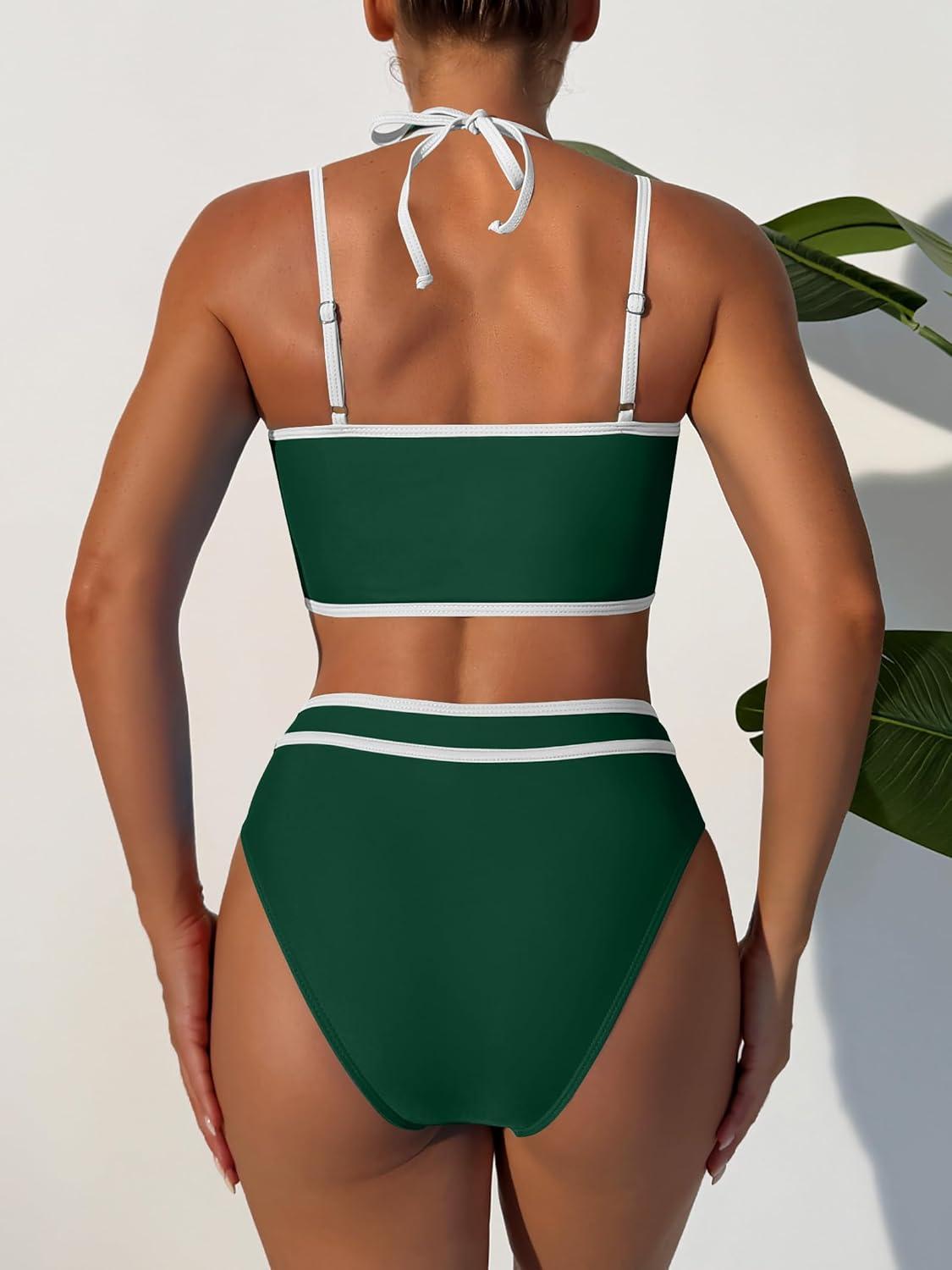 ANRABESS Womens Halter Bikini Set Color Block Sporty Swimsuits Two Piece High Waist Bathing Suit Sexy Summer Beach Swim Suits(Deep Green)