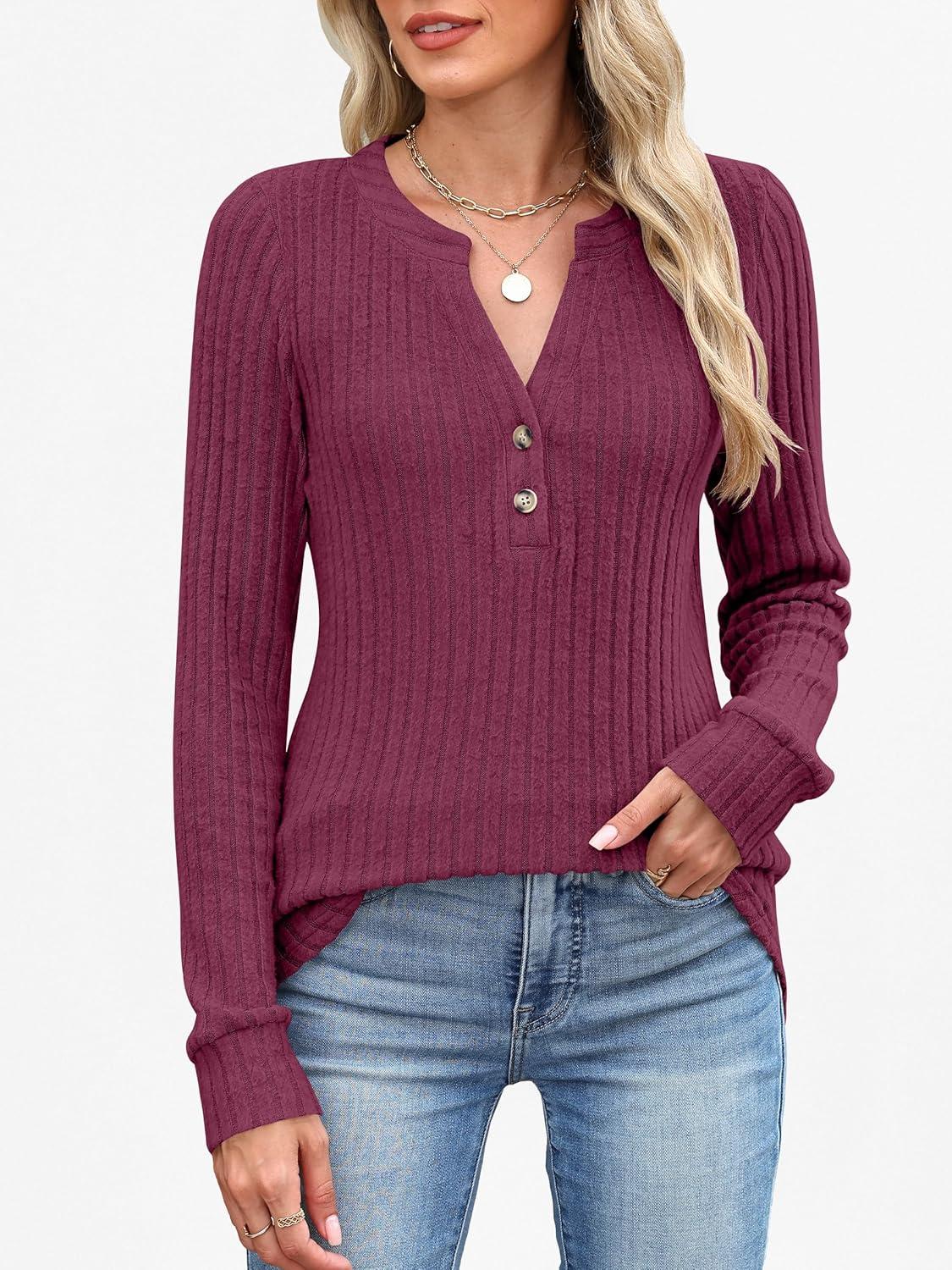 ANRABESS Womens Henley Shirts Long Sleeve Tunic Tops 2025 Fall Fashion Outfits Ribbed Knit Sweaters Ladies Casual Clothes(Burgundy)