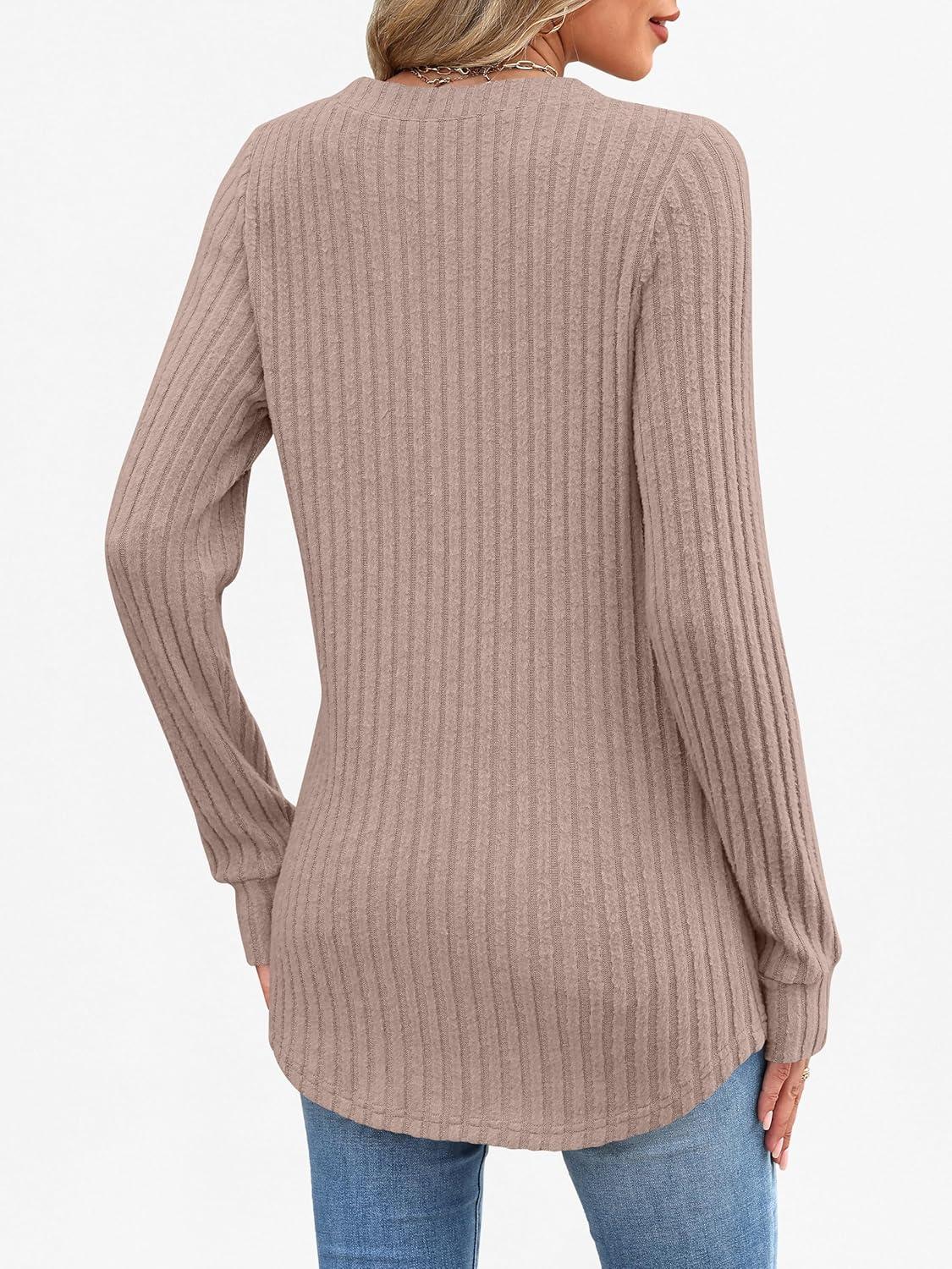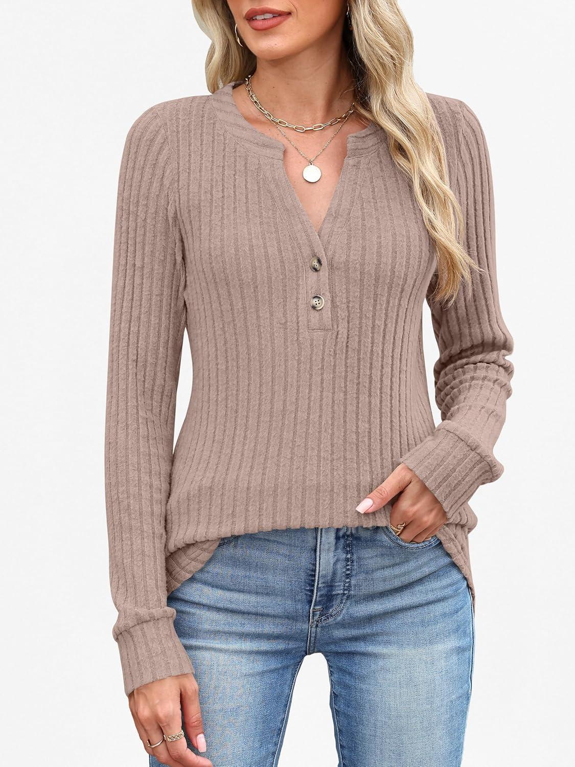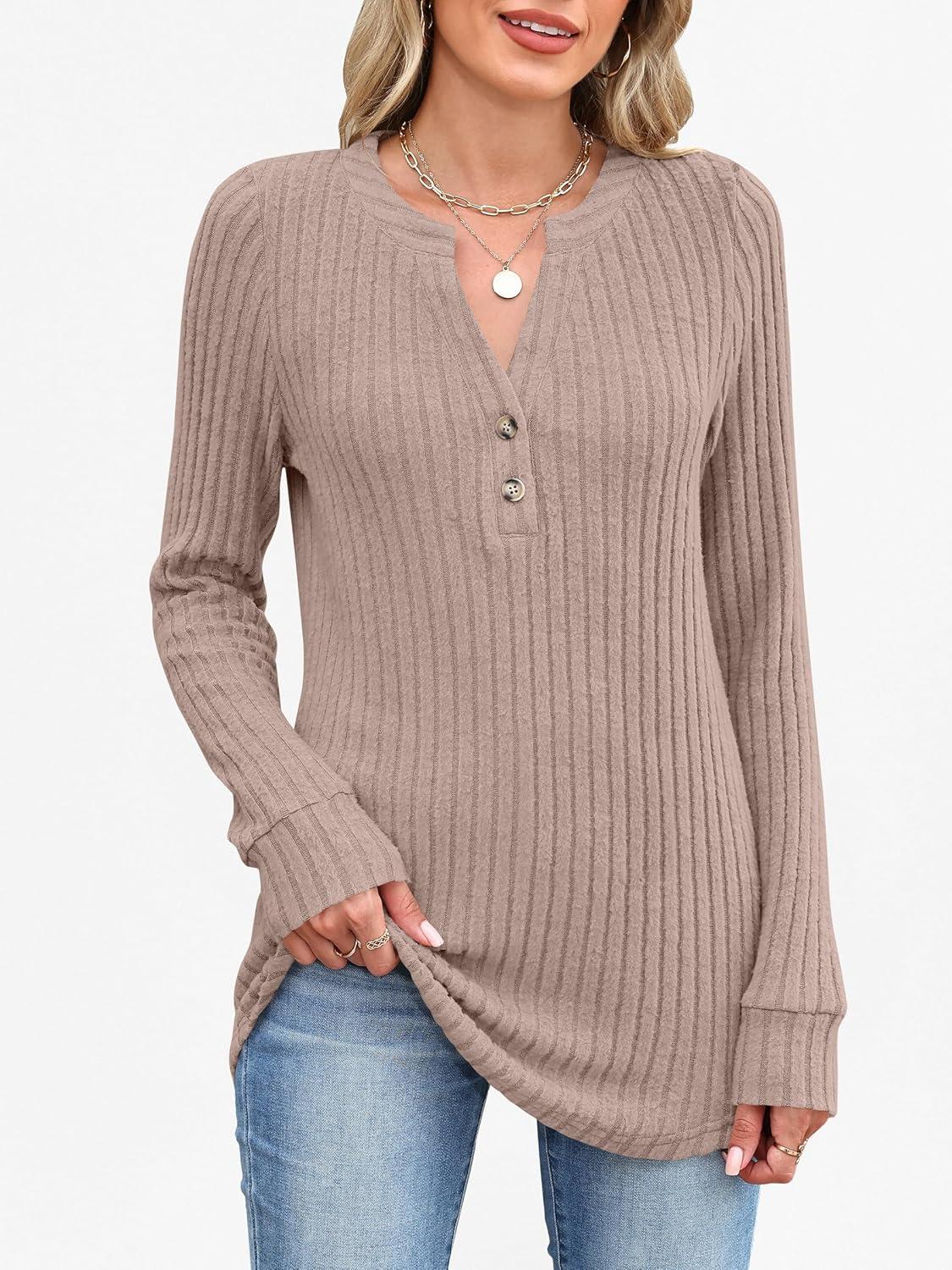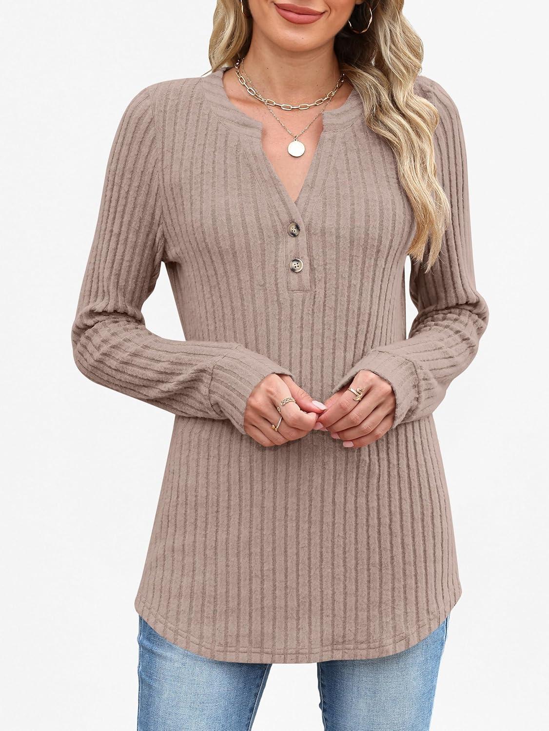 ANRABESS Womens Henley Shirts Long Sleeve Tunic Tops 2025 Fall Fashion Outfits Ribbed Knit Sweaters Ladies Casual Clothes(Tan)
