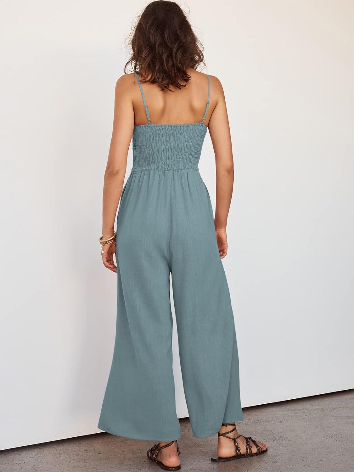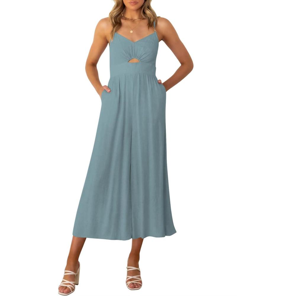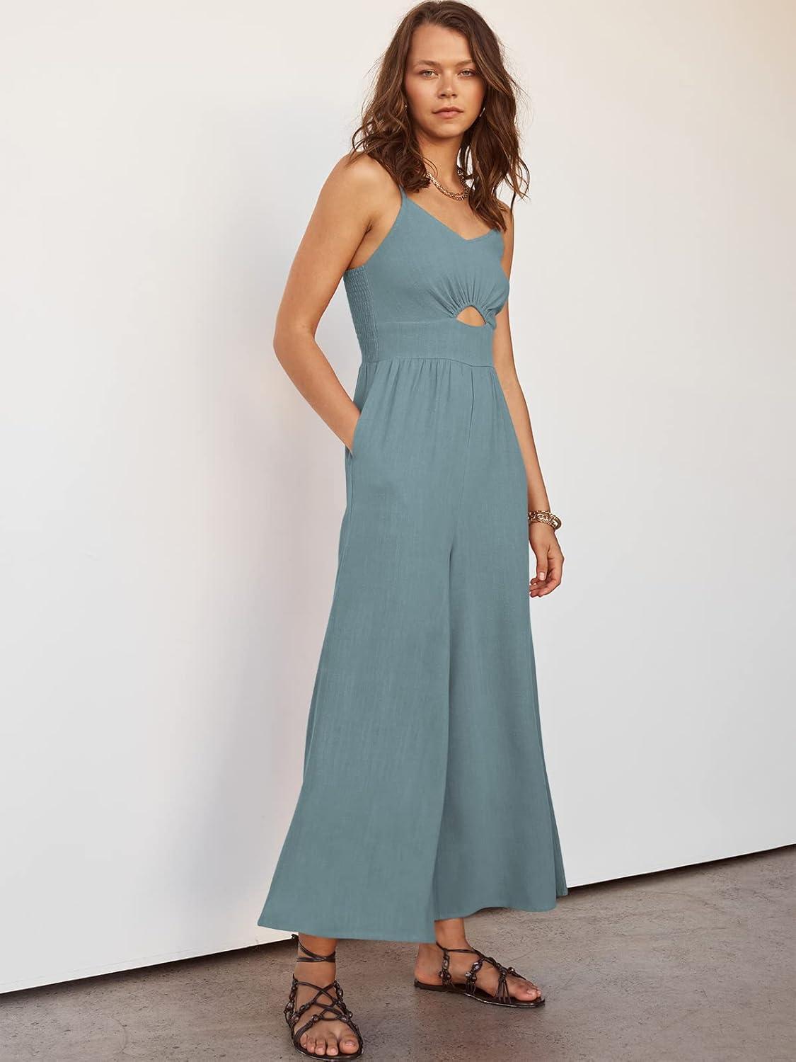 ANRABESS Womens Jumpsuit Summer Beach Vacation Romper 2025 V Neck Sleevelsee Spaghetti Strap Cutout Linen Wide Leg Clothes(Blue)