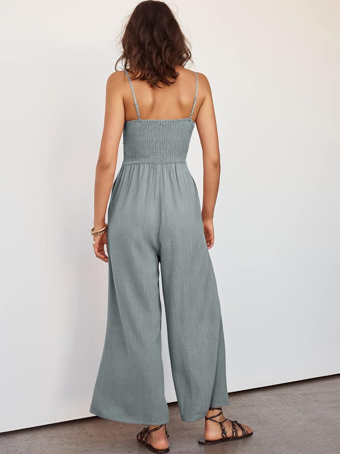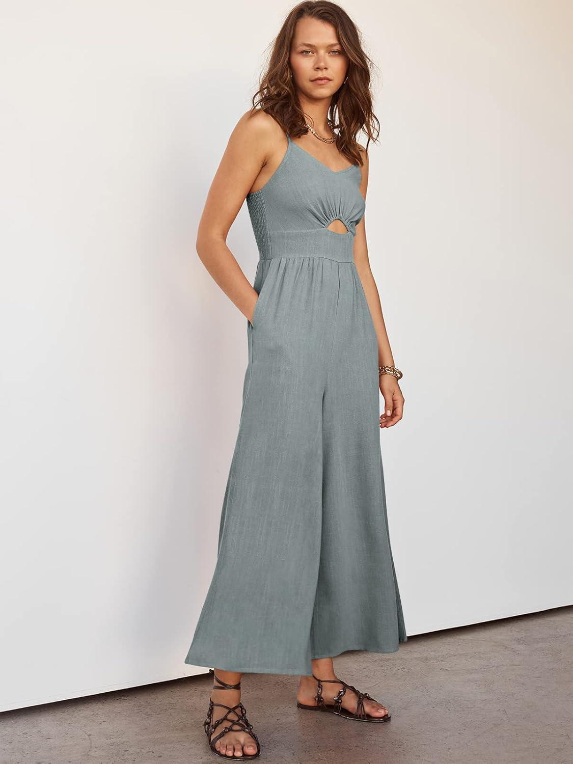 ANRABESS Womens Jumpsuit Summer Beach Vacation Romper 2025 V Neck Sleevelsee Spaghetti Strap Cutout Linen Wide Leg Clothes(Grey)