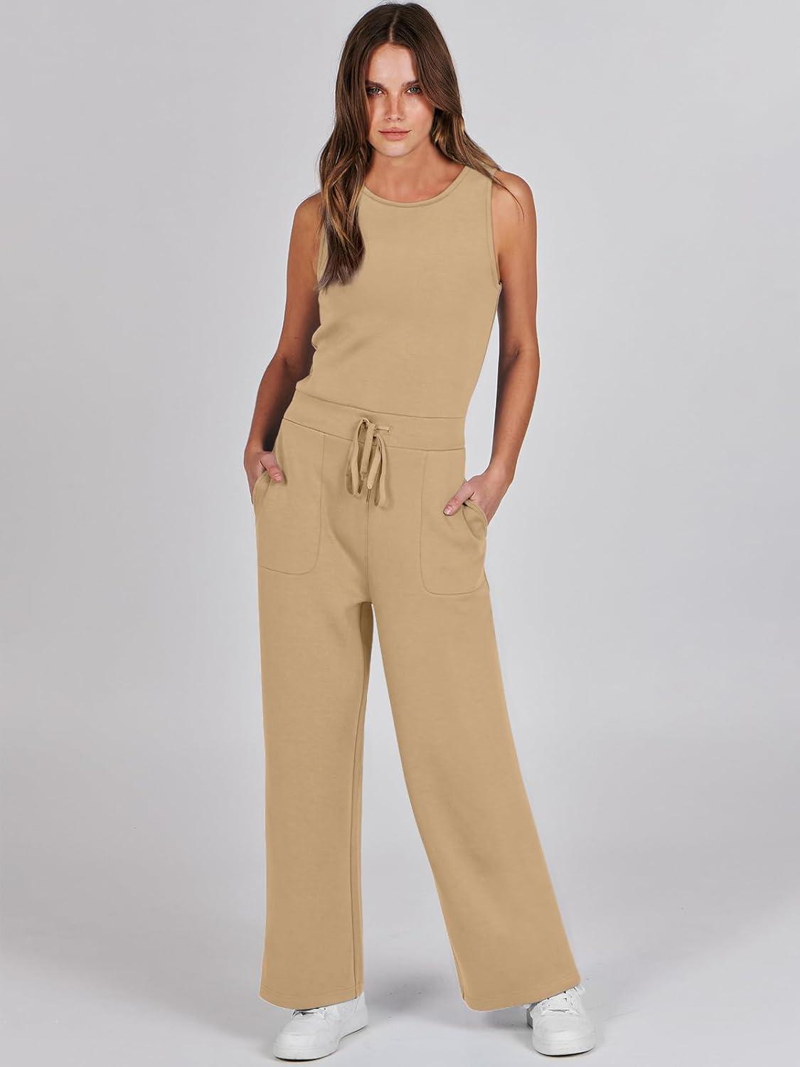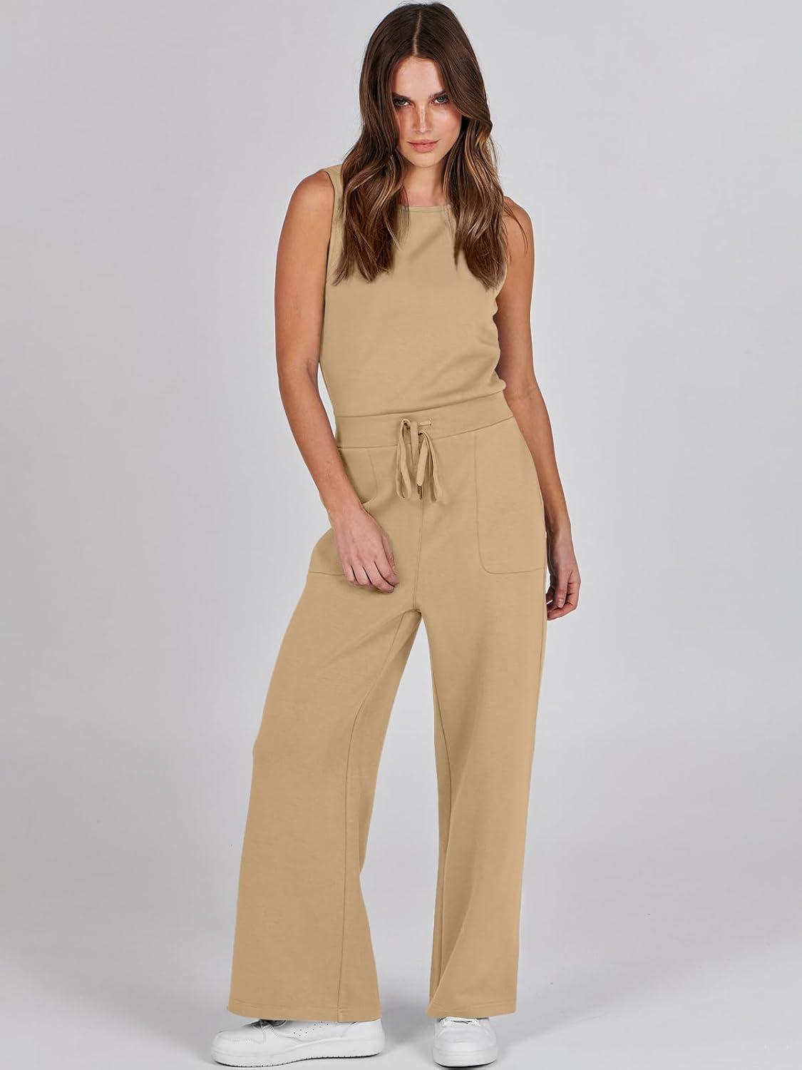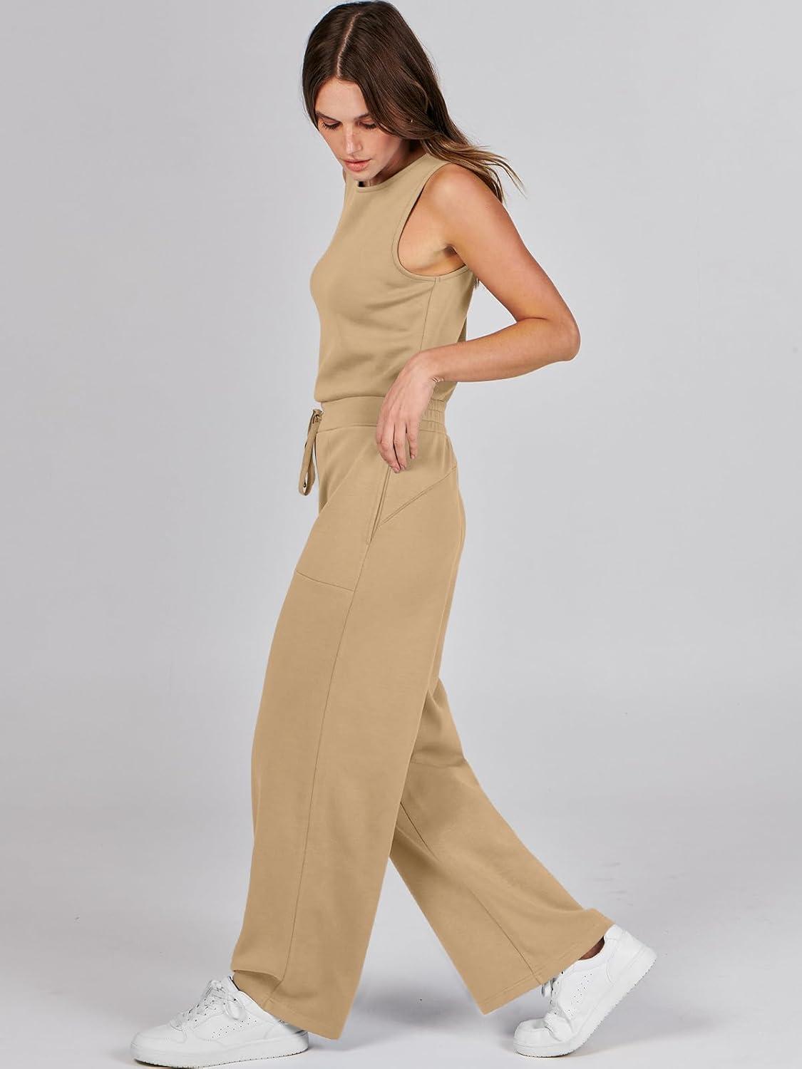 ANRABESS Womens Jumpsuits 2025 Spring Fall Thick Casual Romper Sleeveless Wide Leg Pants One Piece Outfits Vacation Clothes(Light Khaki)