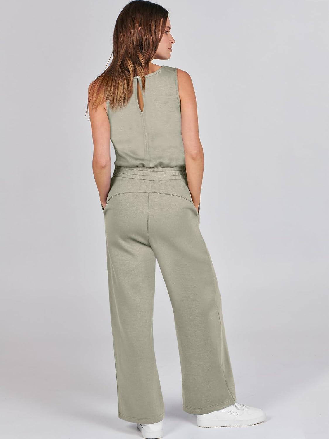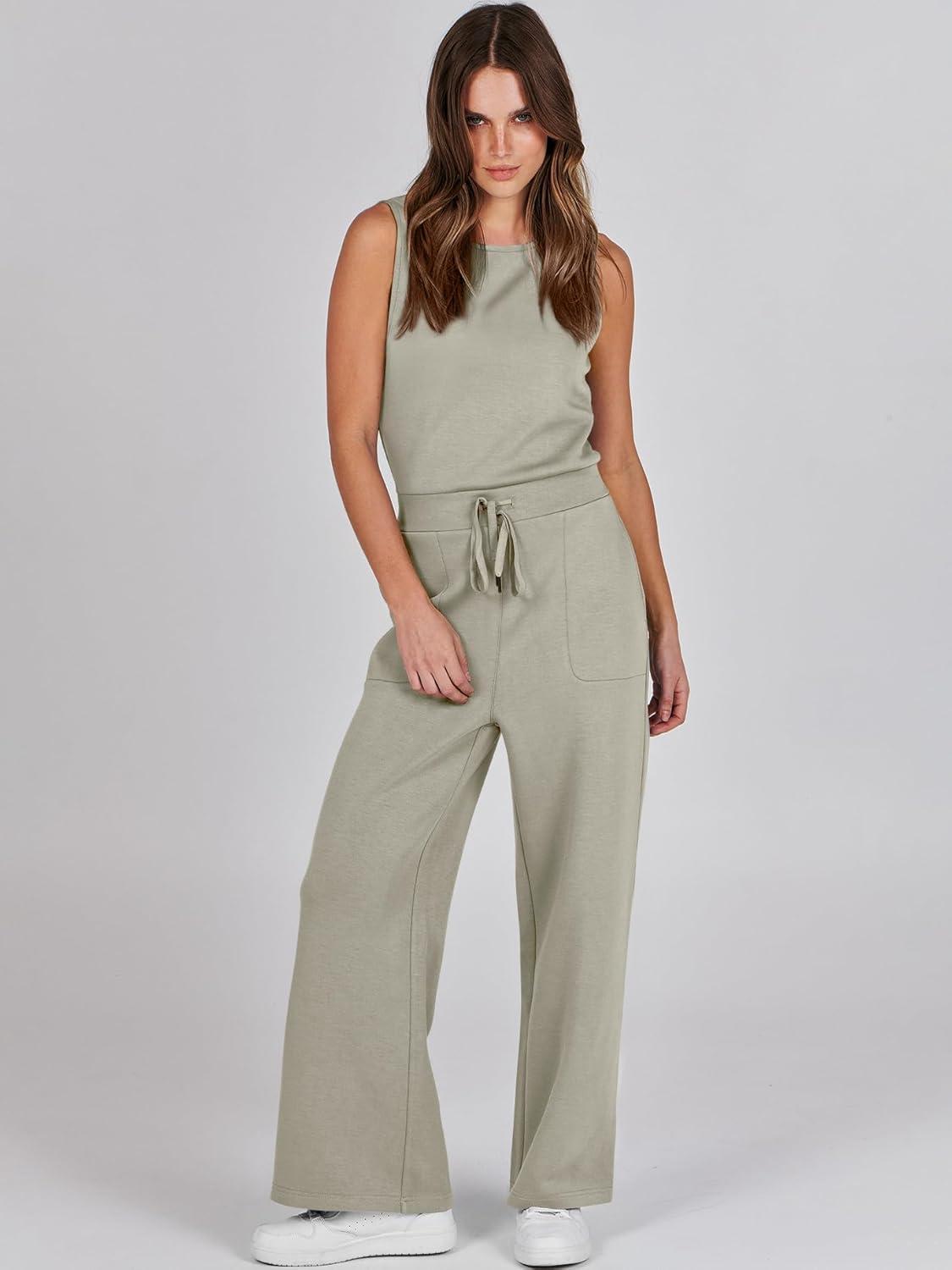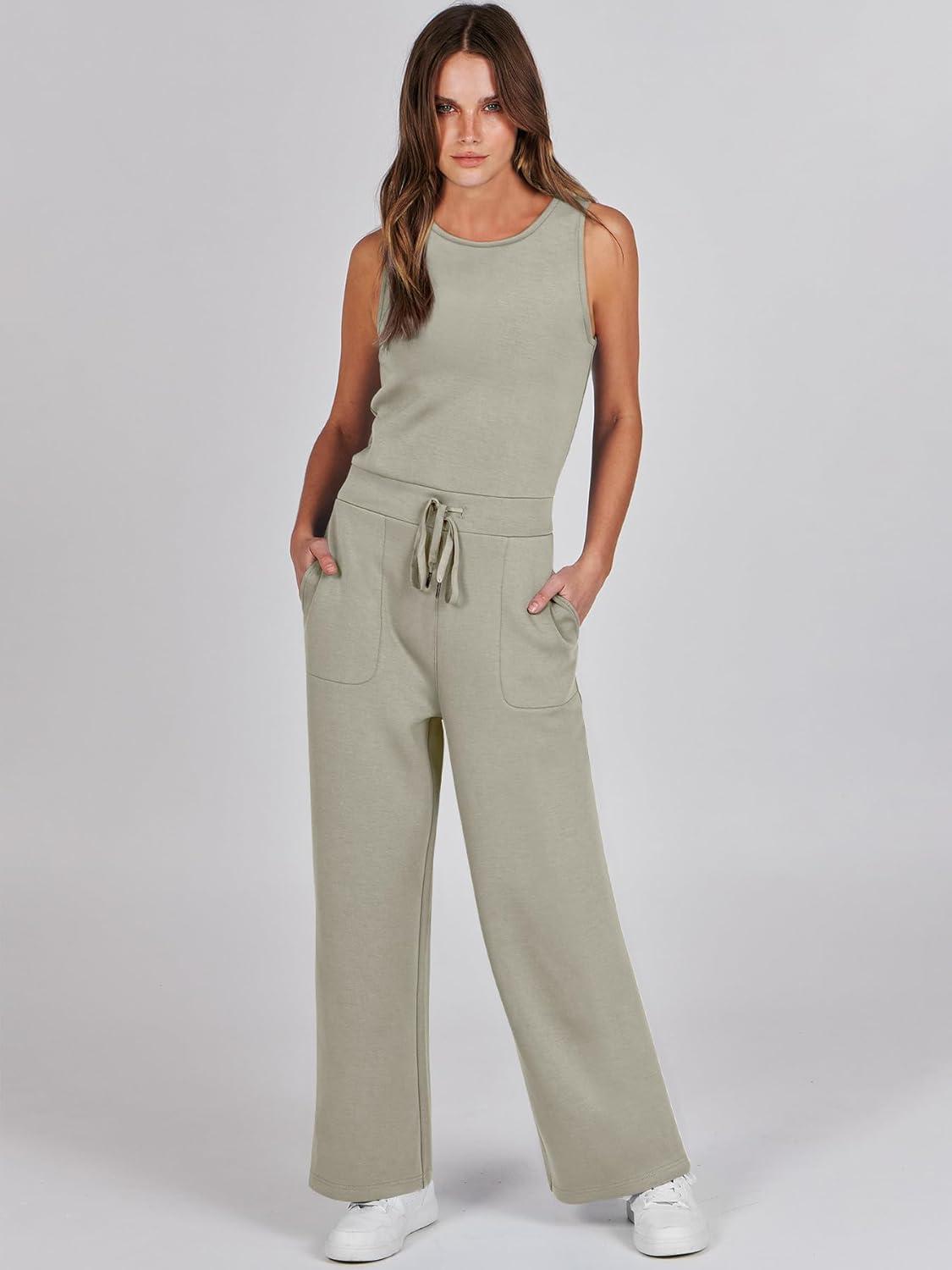 ANRABESS Womens Jumpsuits 2025 Spring Fall Thick Casual Romper Sleeveless Wide Leg Pants One Piece Outfits Vacation Clothes(Light Khaki)