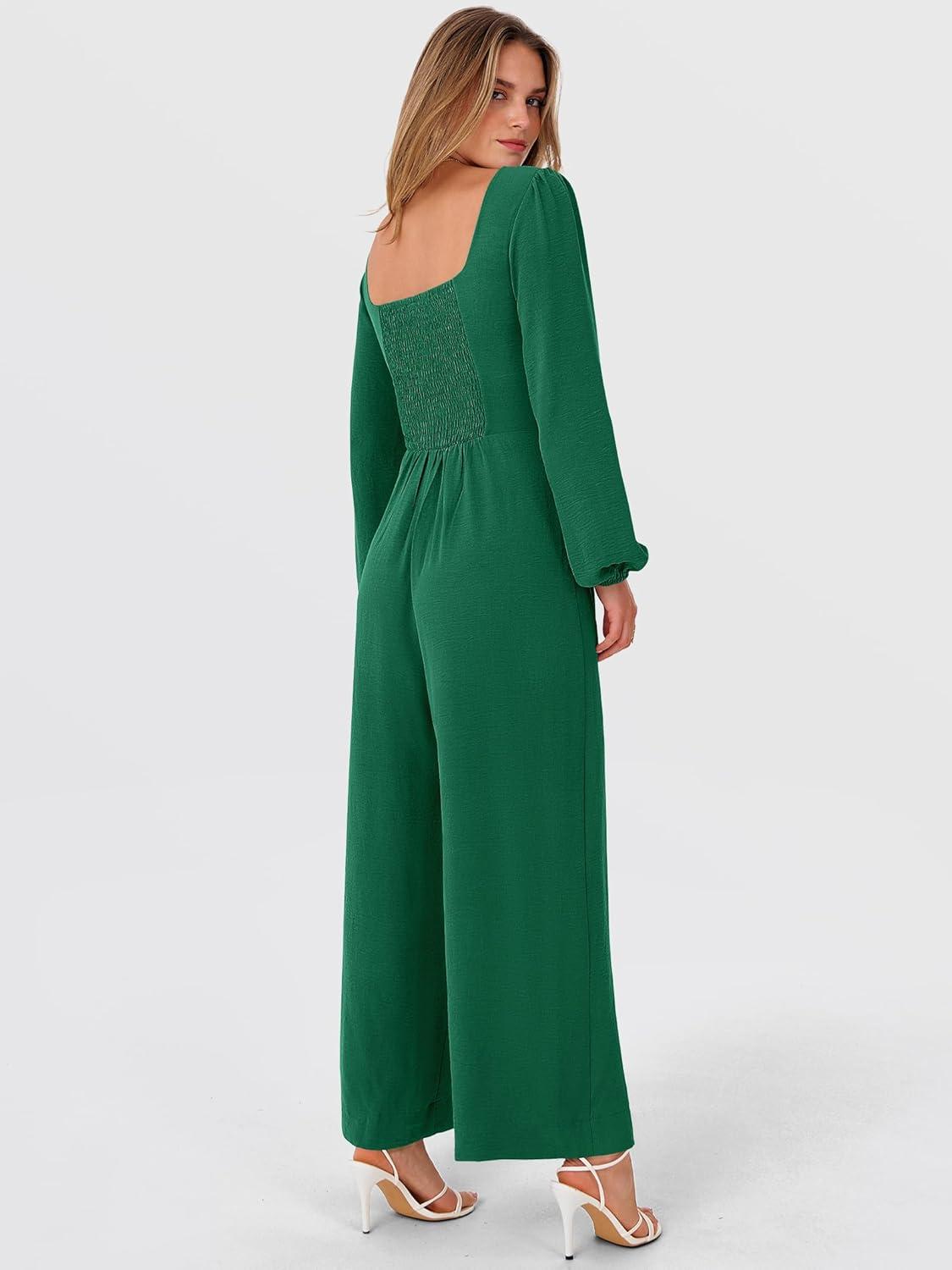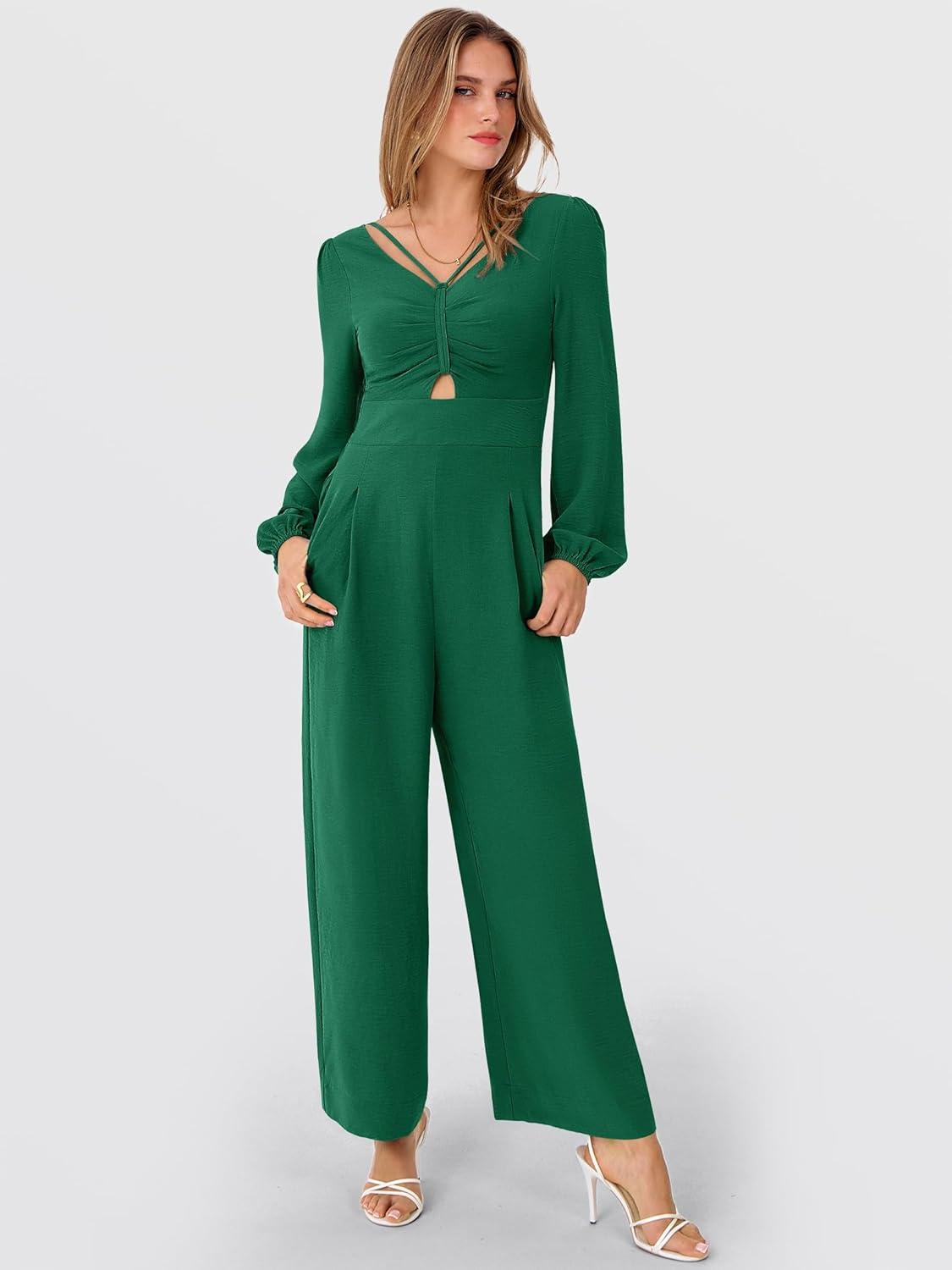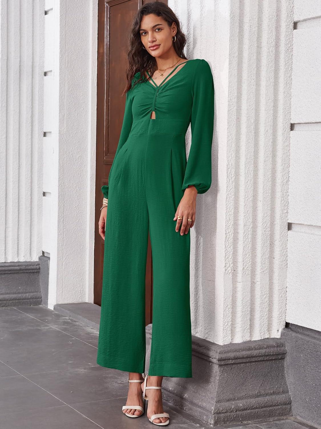 ANRABESS Womens Jumpsuits Dressy Long Sleeve Wide Leg V Neck Pants Rompers 2025 Fall Formal One Piece Wedding Guest Outfits(Forest Green)