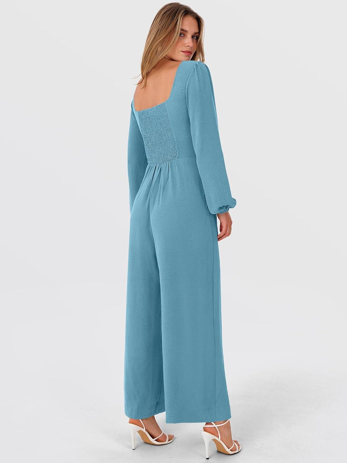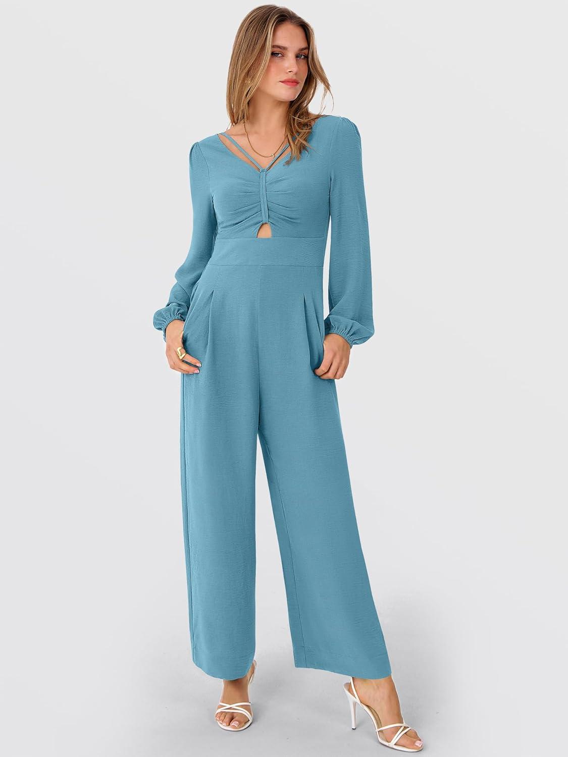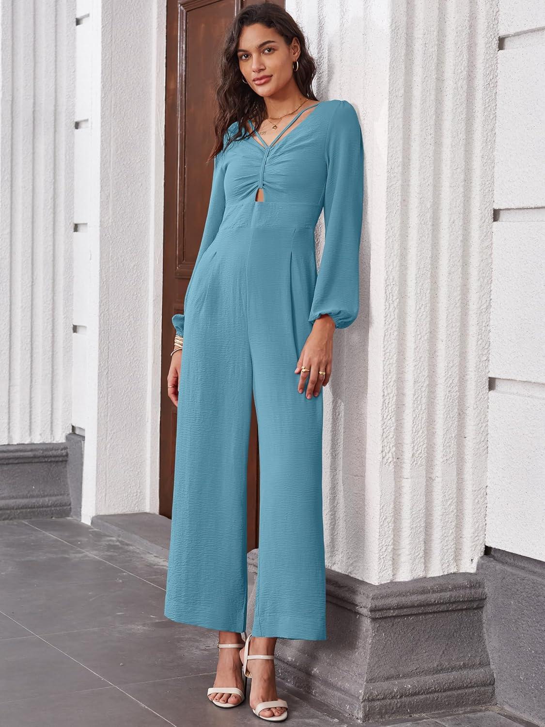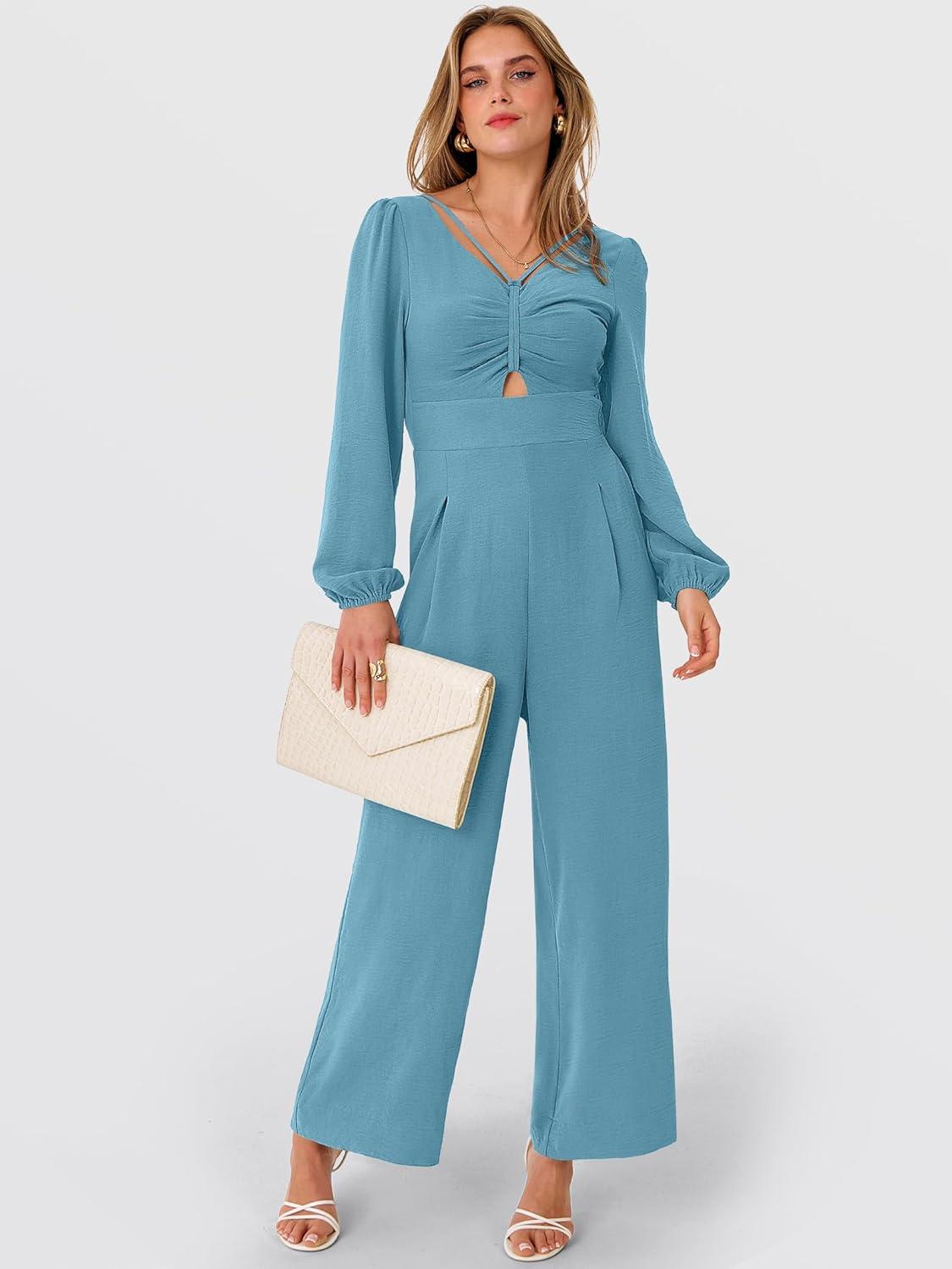ANRABESS Womens Jumpsuits Dressy Long Sleeve Wide Leg V Neck Pants Rompers 2026 Fall Formal One Piece Wedding Guest Outfits(Lake)