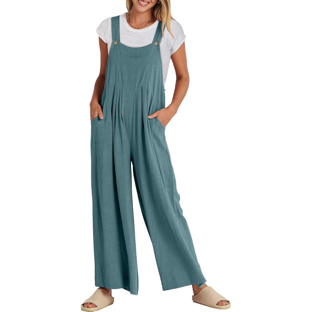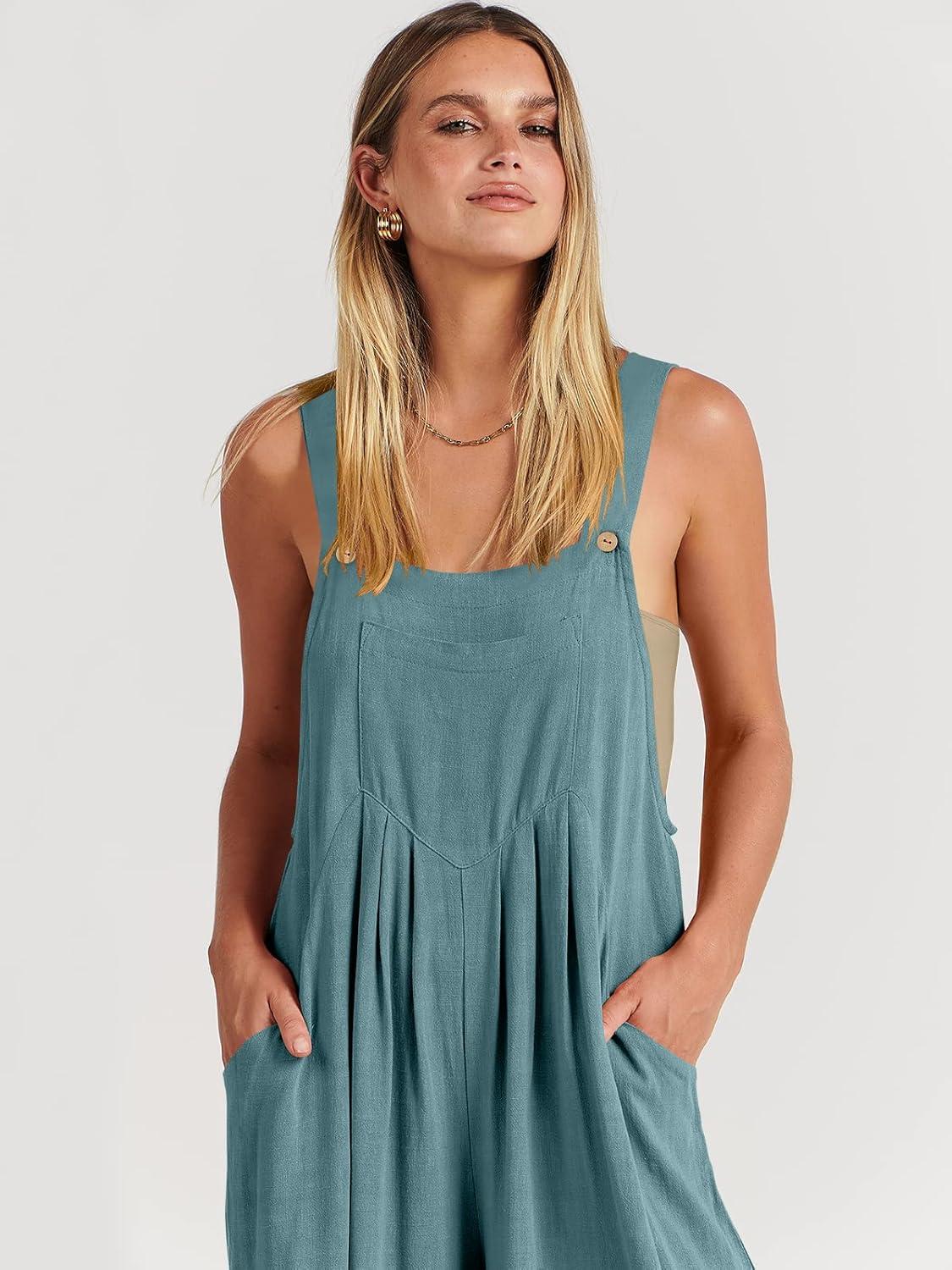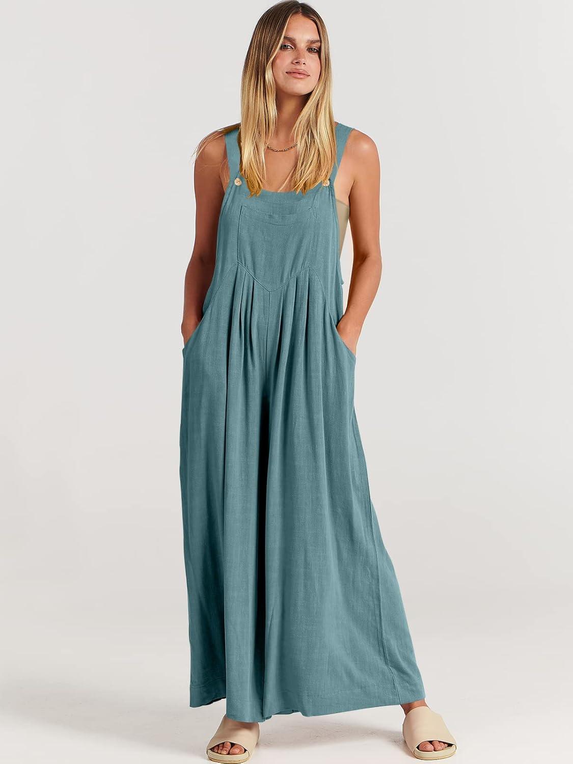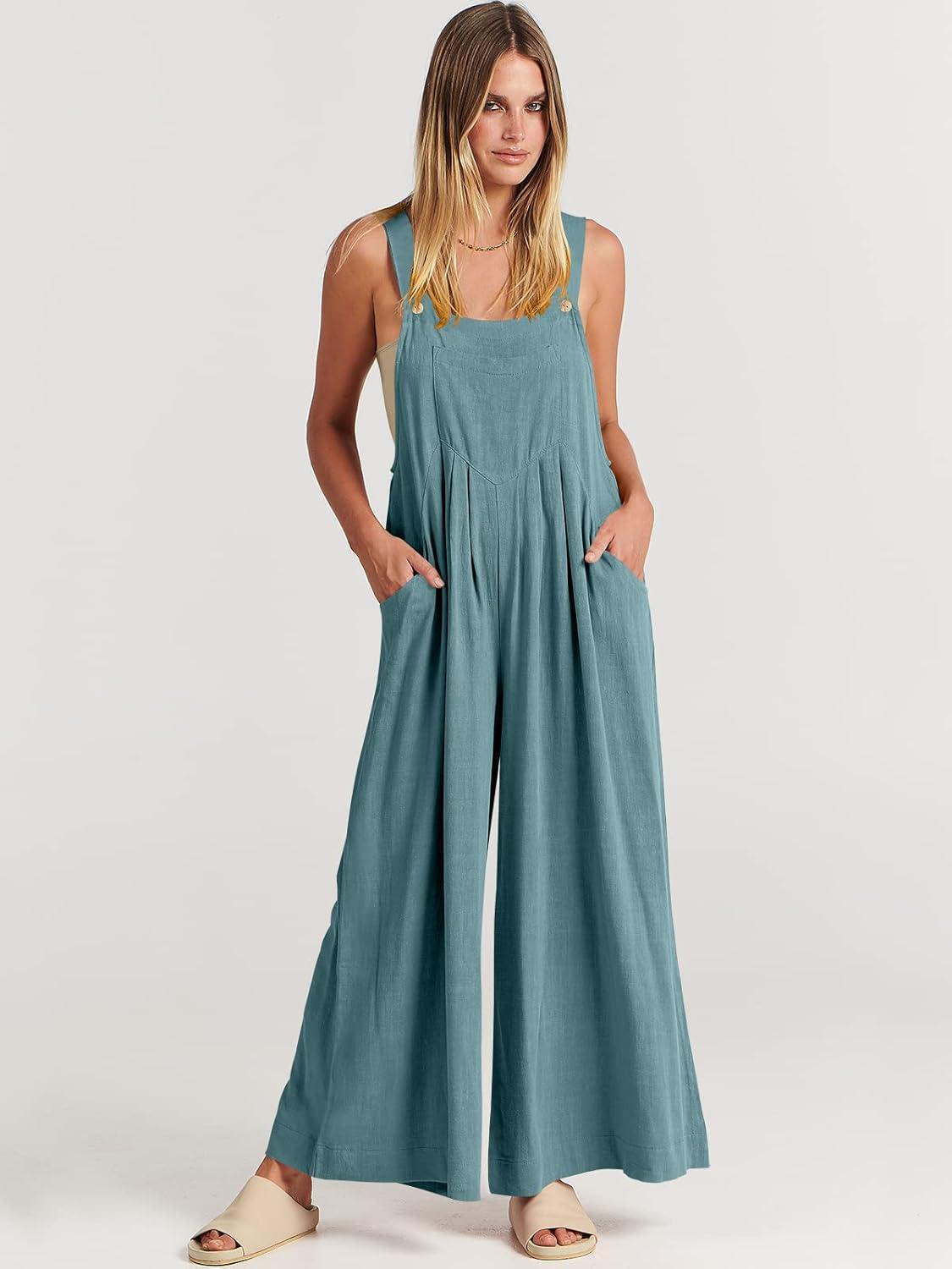 ANRABESS Womens Jumpsuits Overalls Linen Wide Leg Jumpers Casual Summer Fall Outfits 2025 Beach Vacation Clothes with Pockets(Lake)