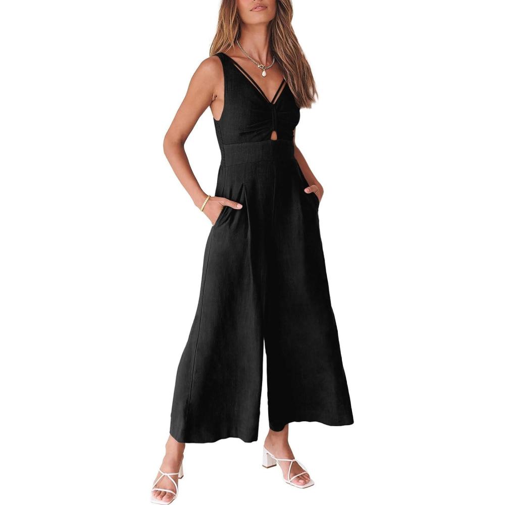 ANRABESS Women’s Jumpsuits Summer Wide Leg Sleeveless V Neck Casual Dressy Linen Pants Rompers 2025 Vacation Beach Outfits(Black)