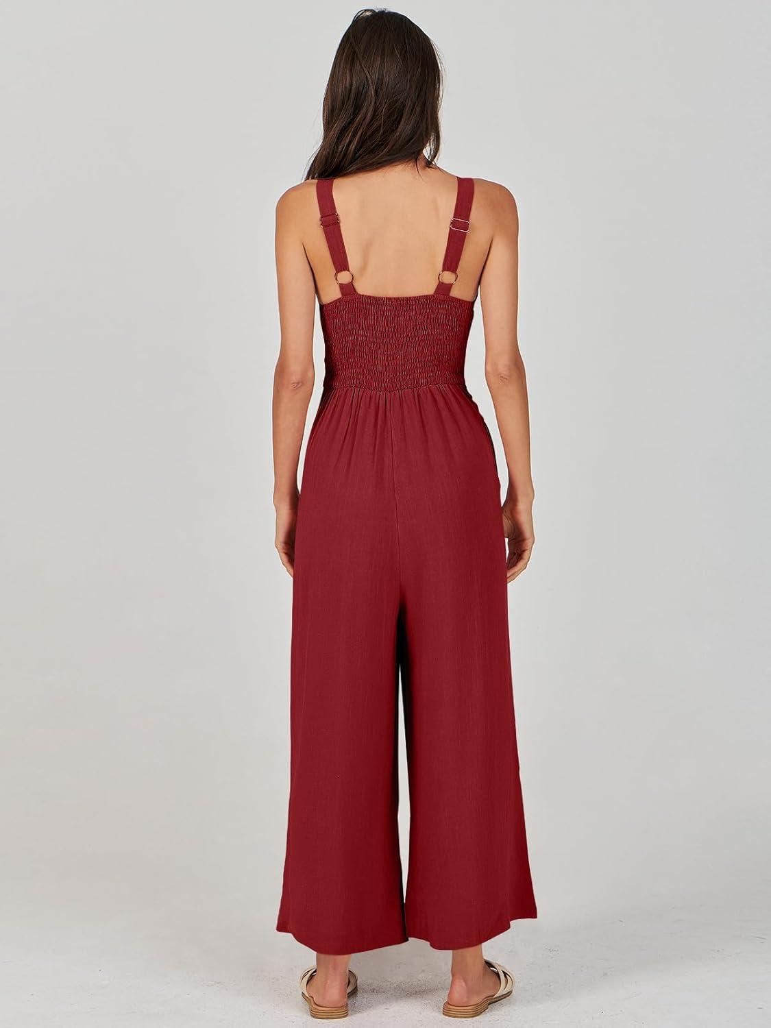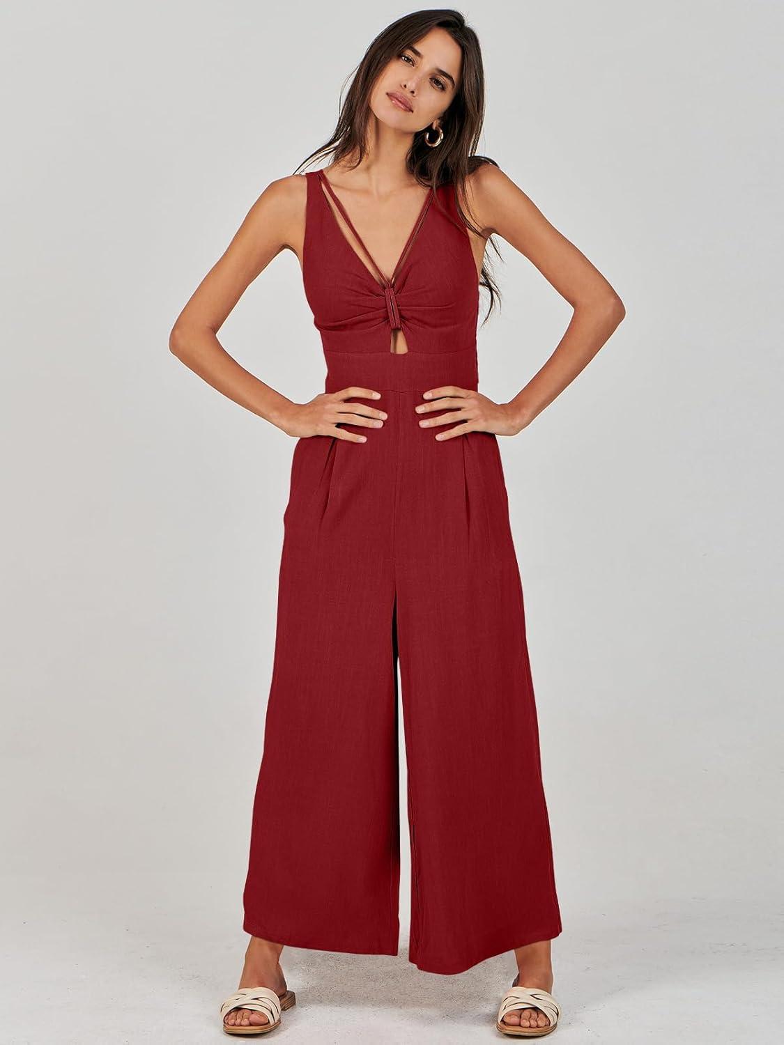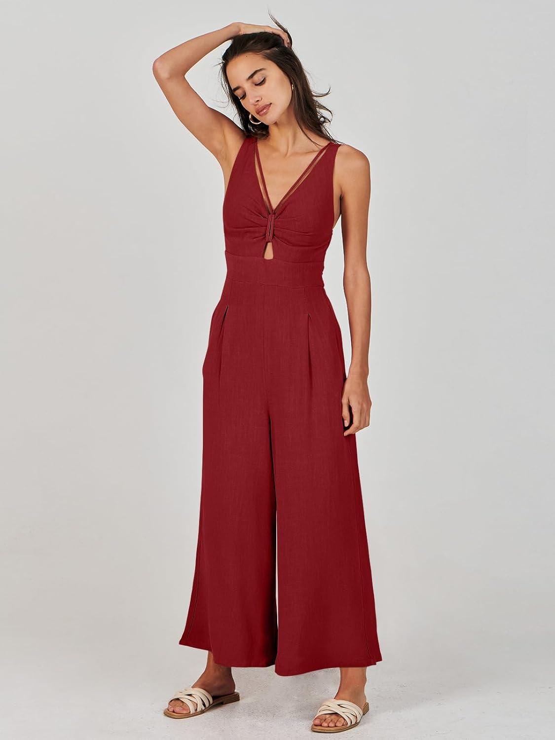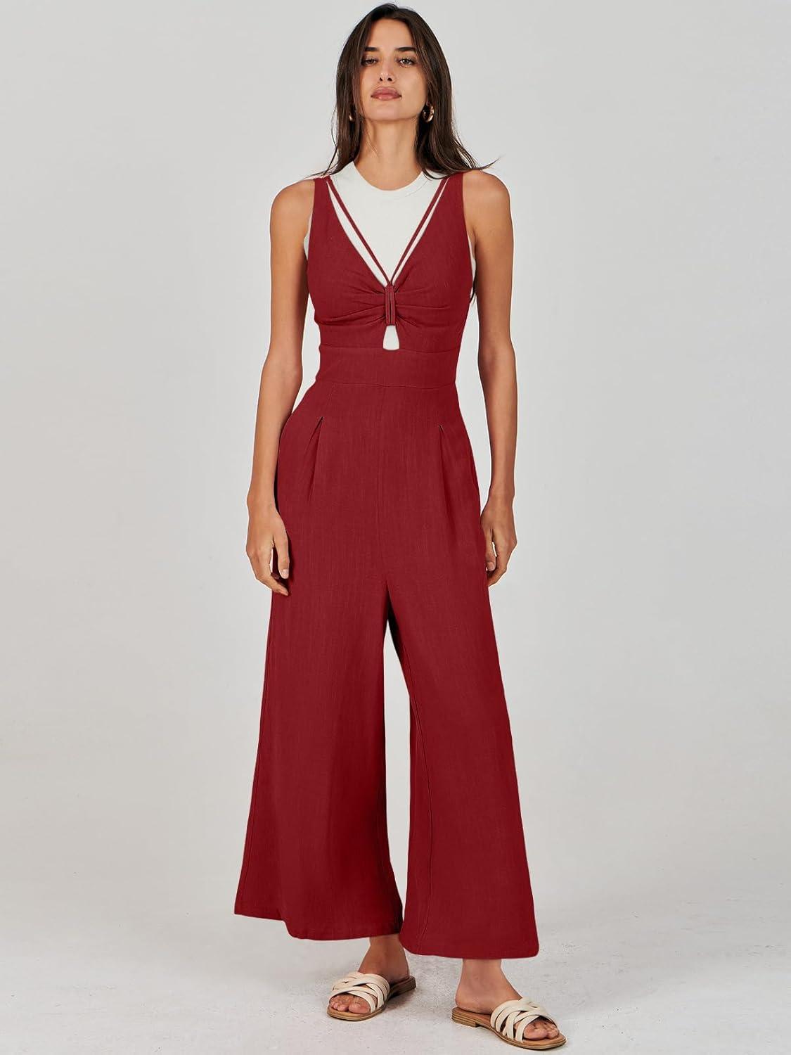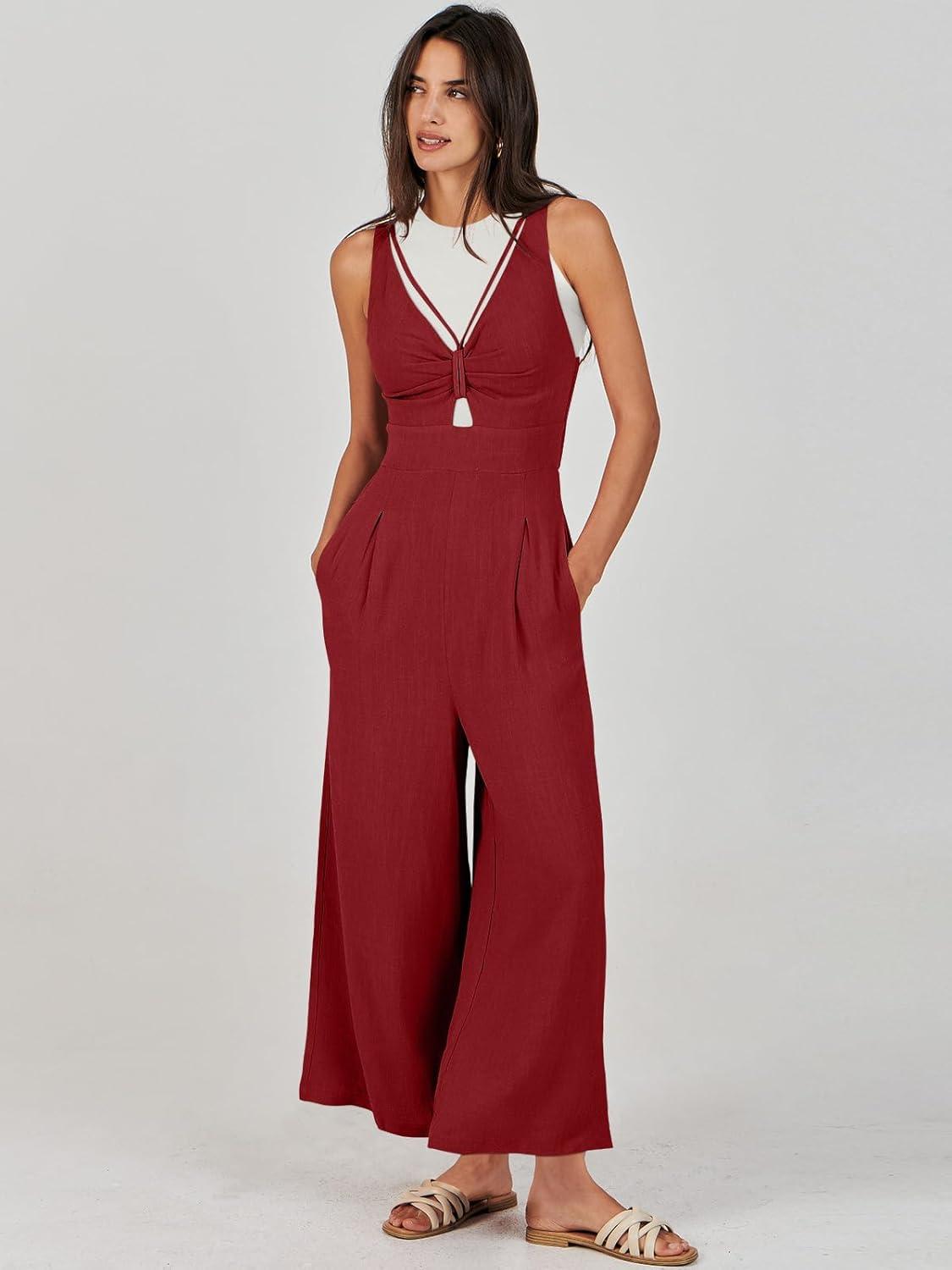 imageANRABESS Womens Jumpsuits Summer Wide Leg Sleeveless V Neck Casual Dressy Linen Pants Rompers 2025 Vacation Beach OutfitsDeep Red
