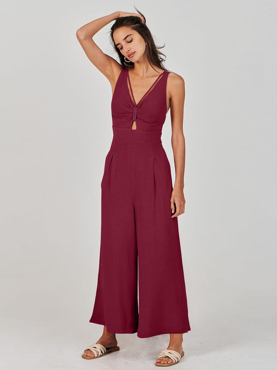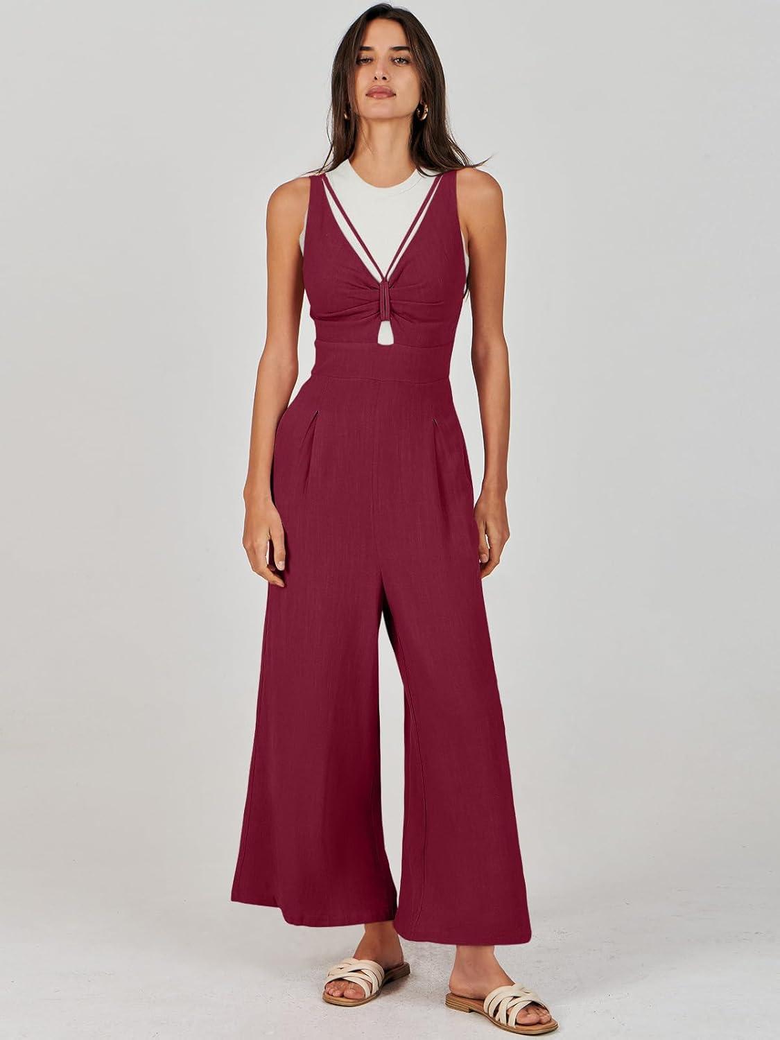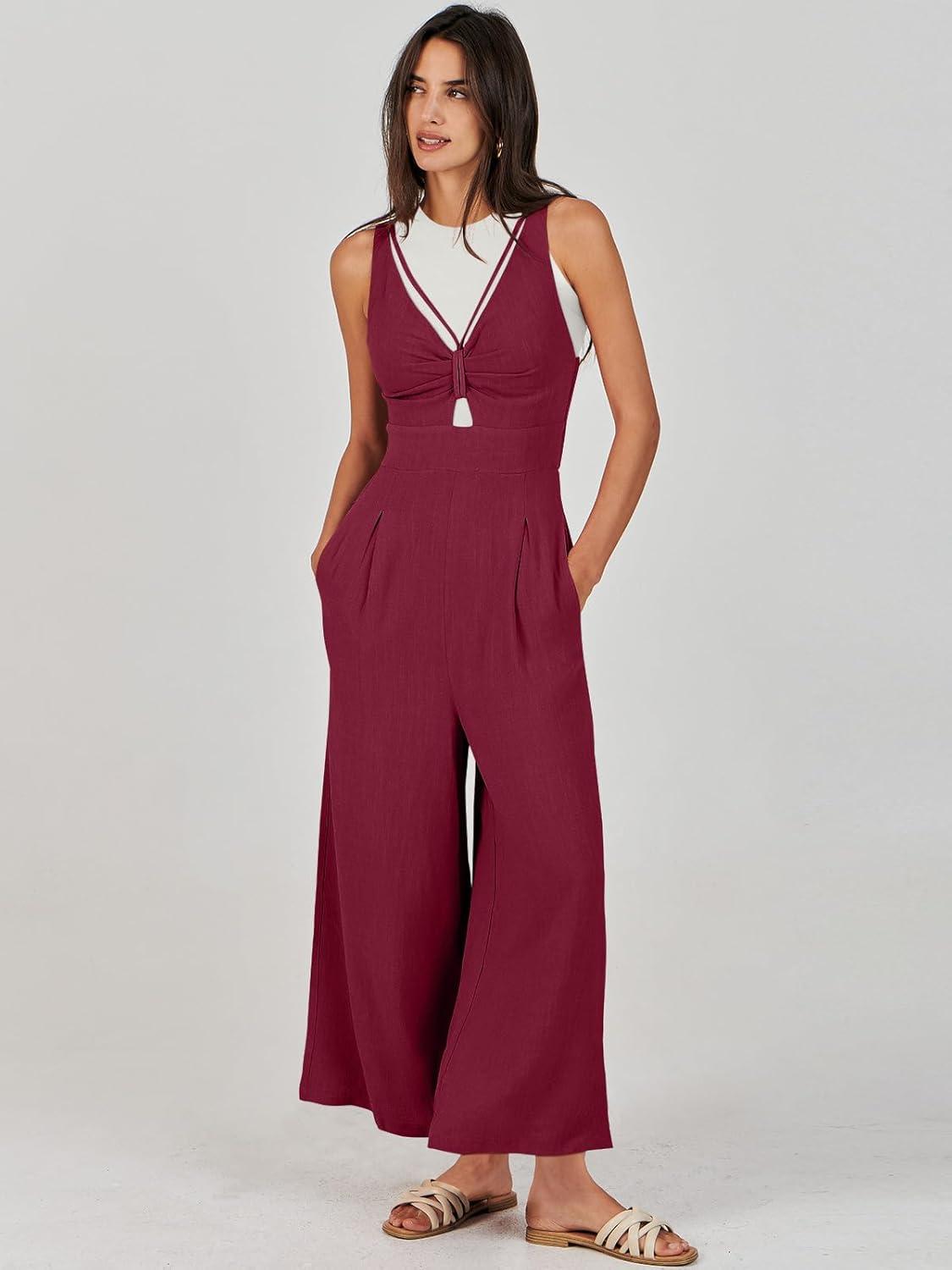 ANRABESS Women’s Jumpsuits Summer Wide Leg Sleeveless V Neck Casual Dressy Linen Pants Rompers 2025 Vacation Beach Outfits(Fuchsia)