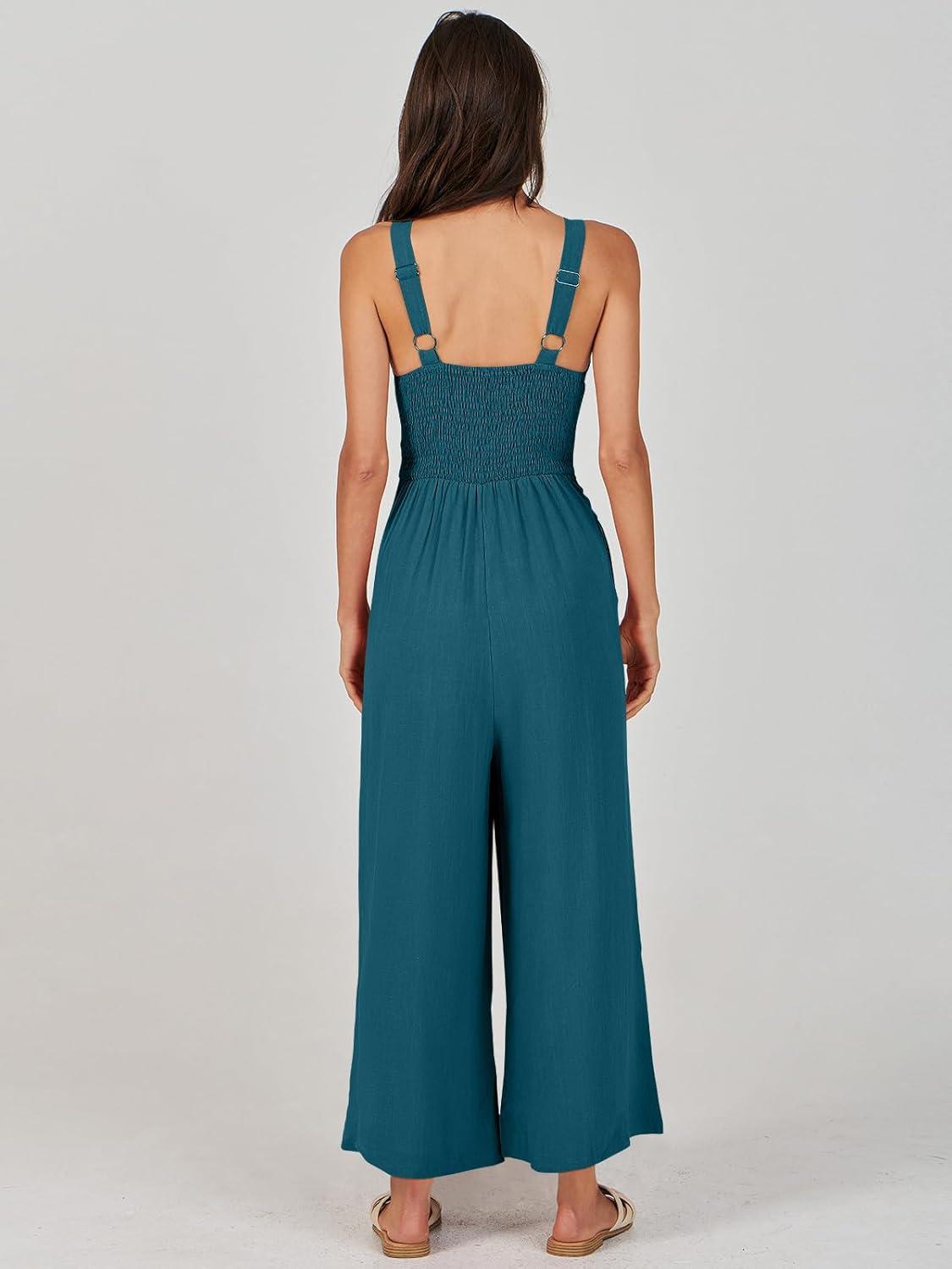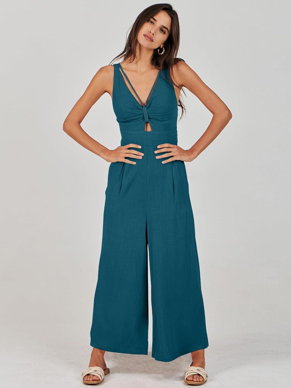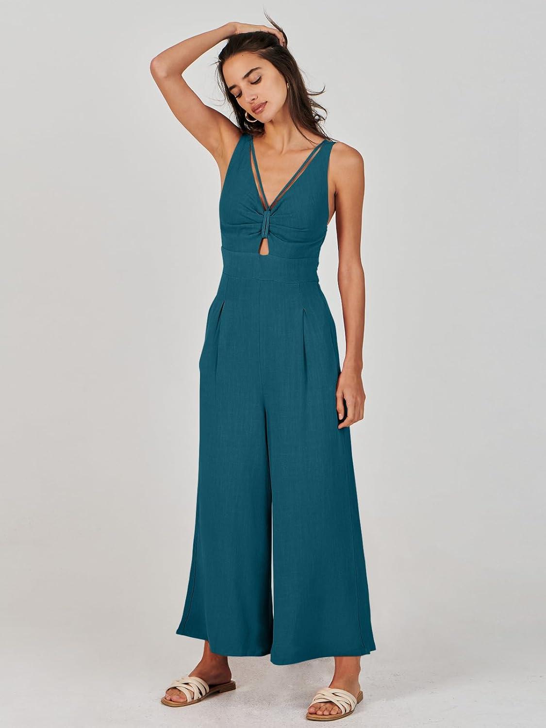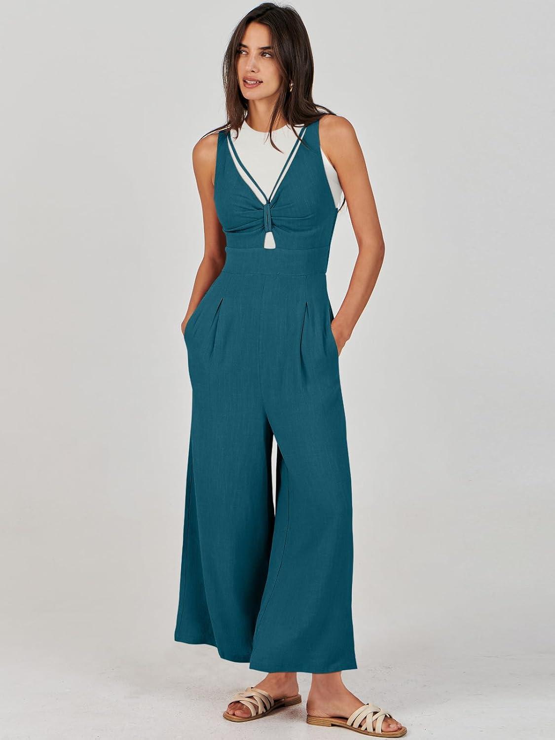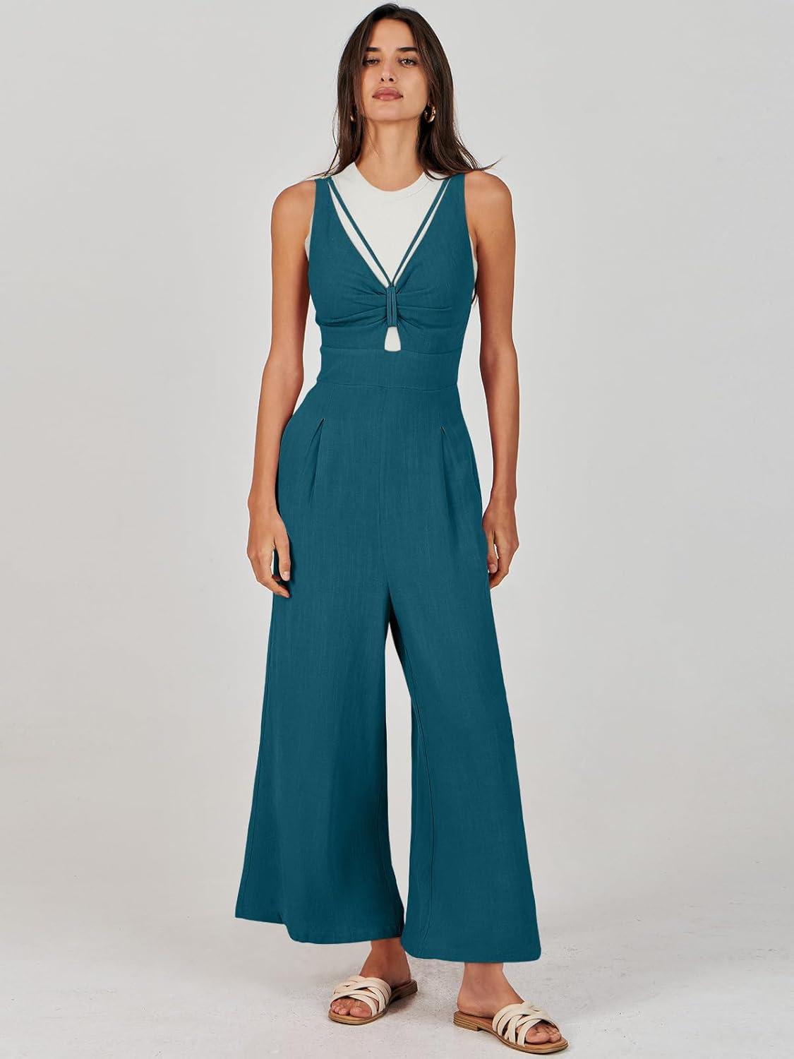 imageANRABESS Womens Jumpsuits Summer Wide Leg Sleeveless V Neck Casual Dressy Linen Pants Rompers 2025 Vacation Beach OutfitsTeal