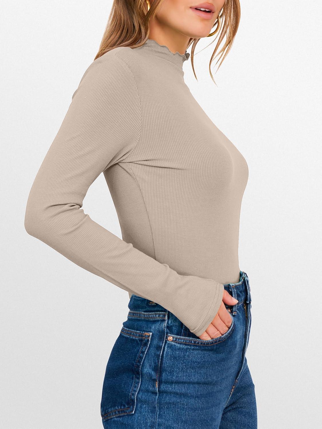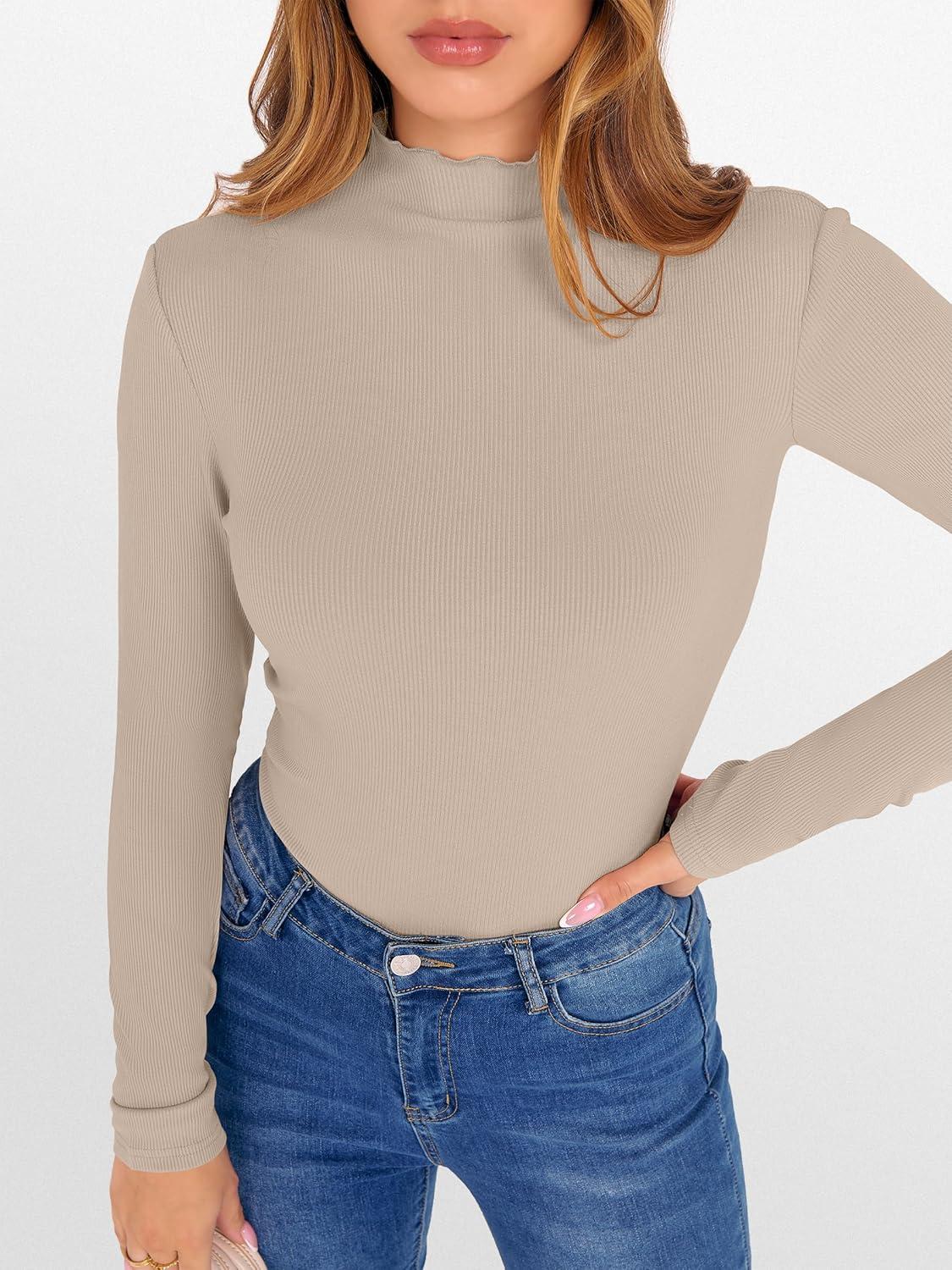 imageANRABESS Womens Lettuce Trim Mock Neck Long Sleeve Tops 2025 Casual Dressy Ribbed Knit Slim Fit Tee Shirt Fall Layer OutfitsBeige