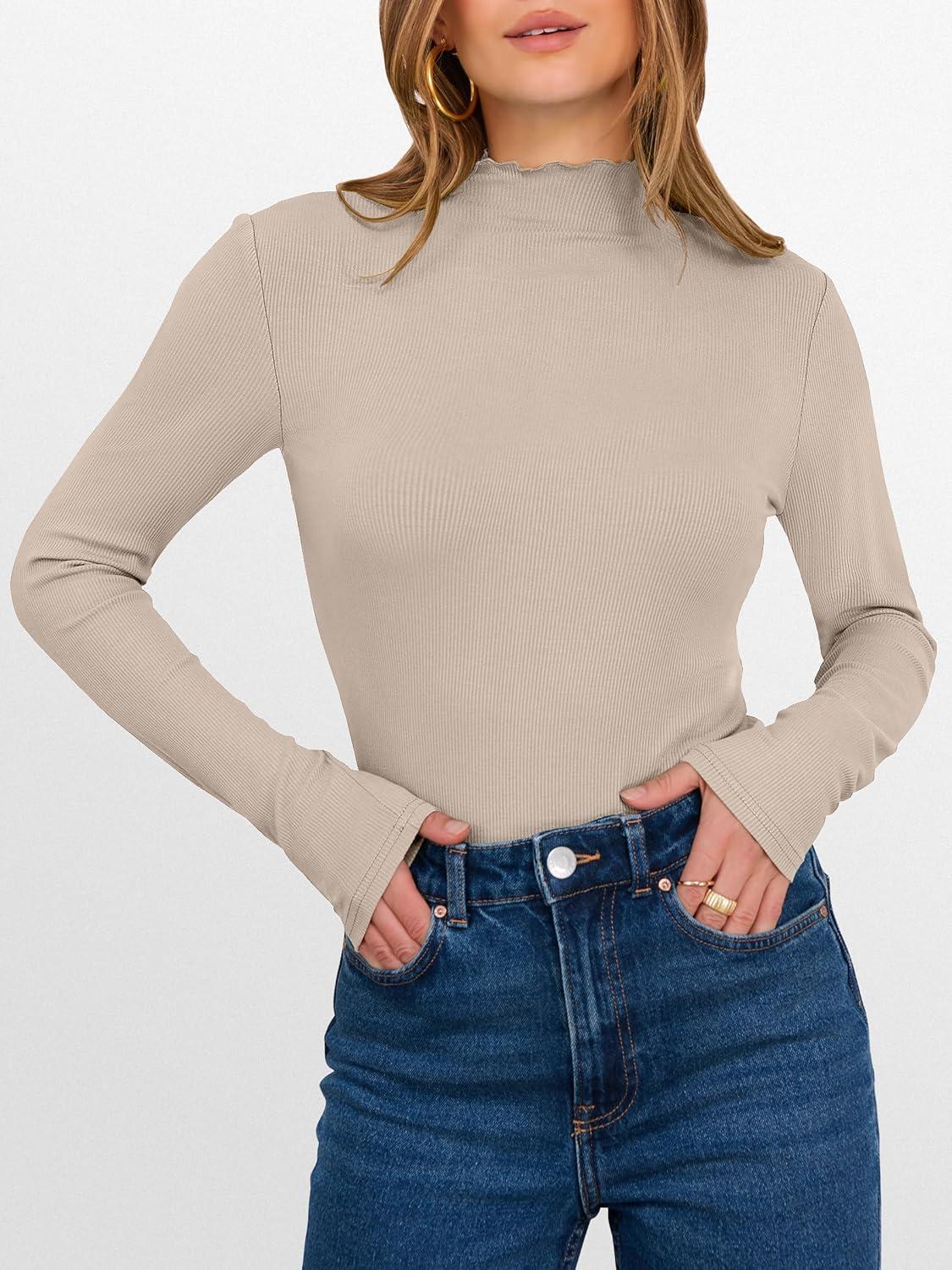 ANRABESS Women's Lettuce Trim Mock Neck Long Sleeve Tops 2025 Casual Dressy Ribbed Knit Slim Fit Tee Shirt Fall Layer Outfits(Beige)