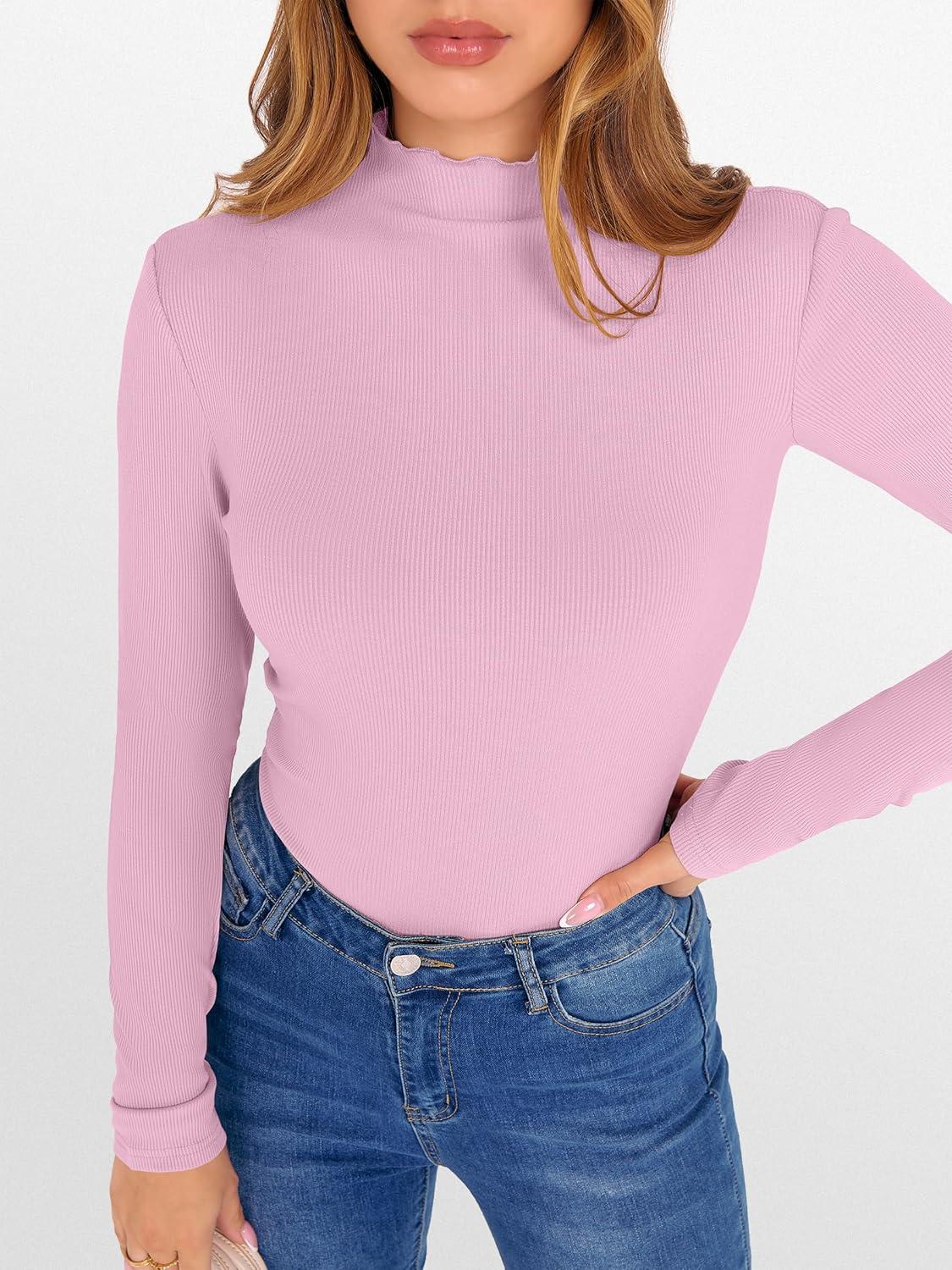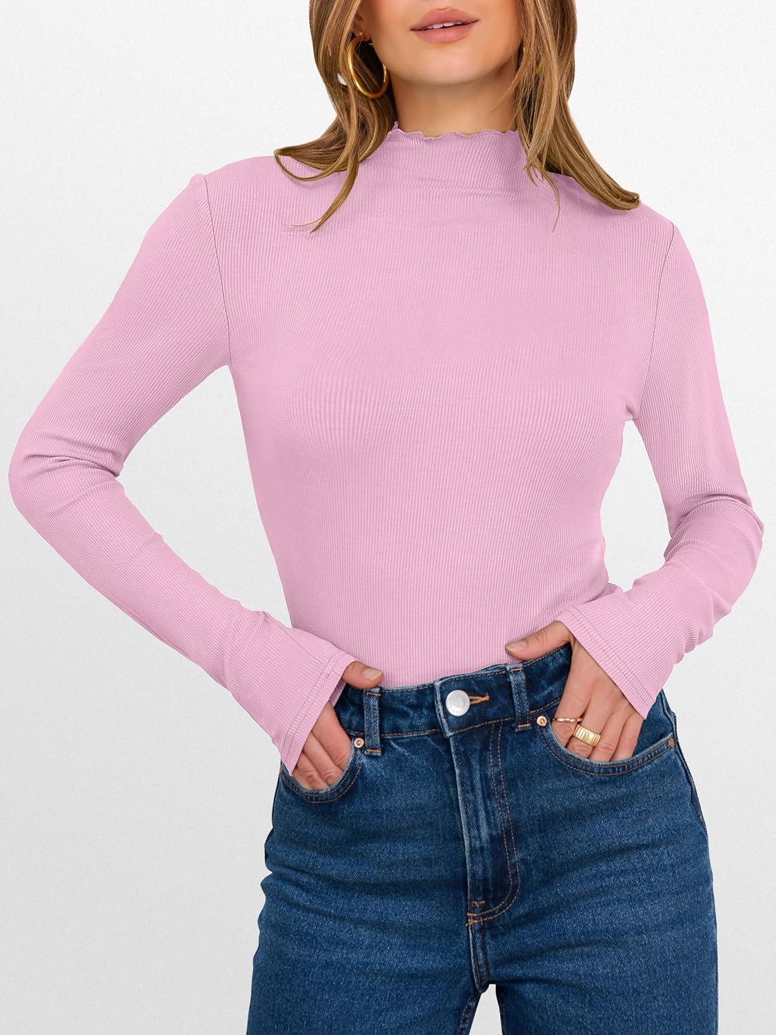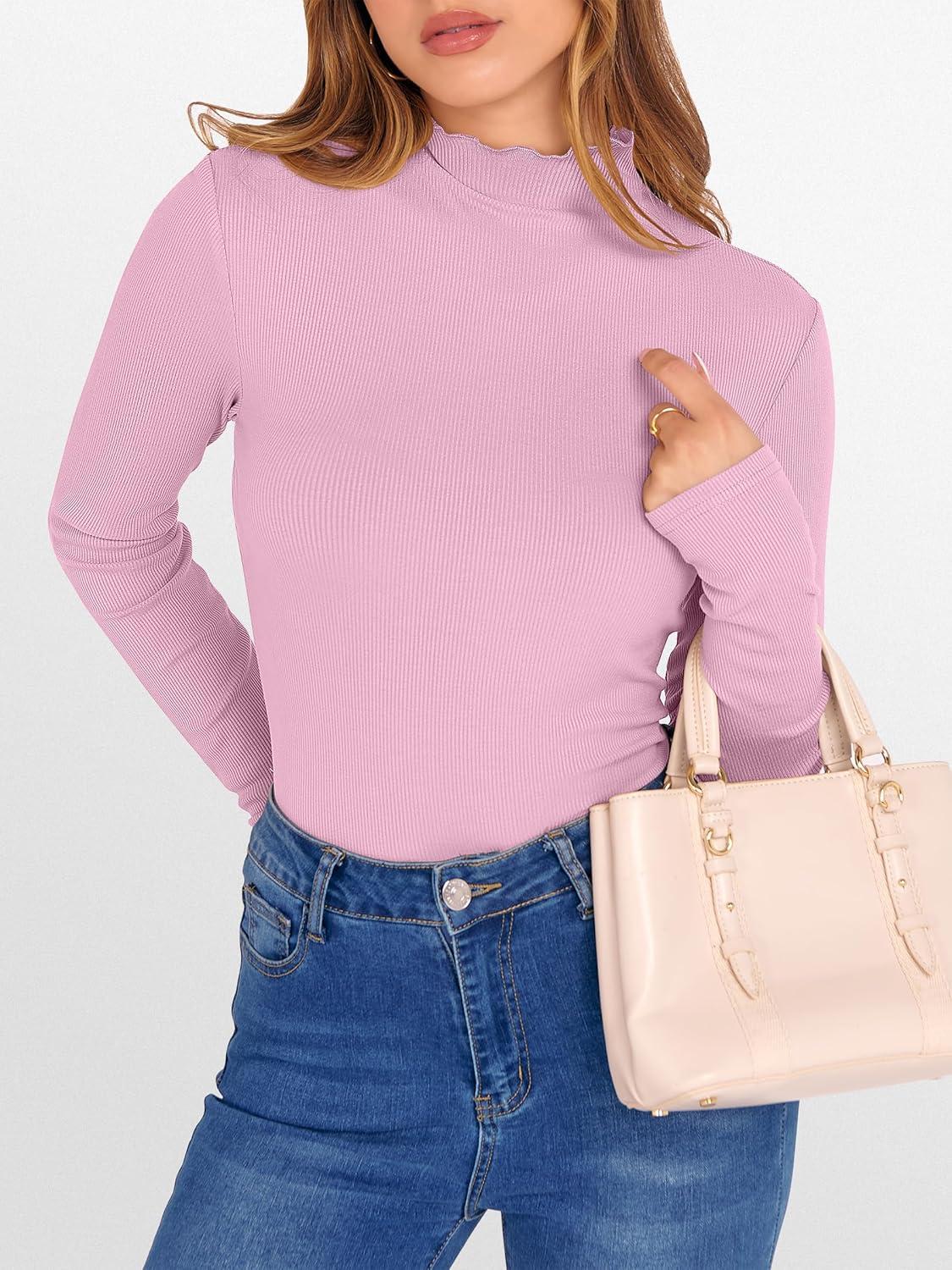ANRABESS Women’s Lettuce Trim Mock Neck Long Sleeve Tops 2025 Casual Dressy Ribbed Knit Slim Fit Tee Shirt Fall Layer Outfits(Bright Pink)