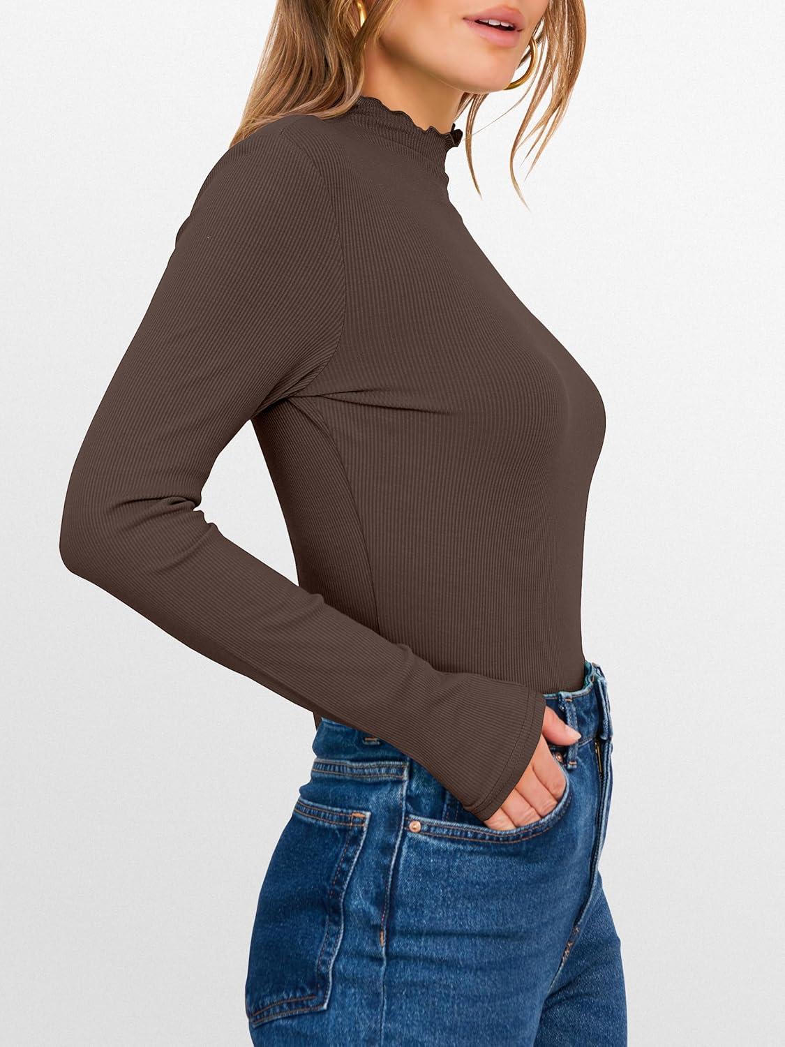 ANRABESS Women’s Lettuce Trim Mock Neck Long Sleeve Tops 2025 Casual Dressy Ribbed Knit Slim Fit Tee Shirt Fall Layer Outfits(Coffee)