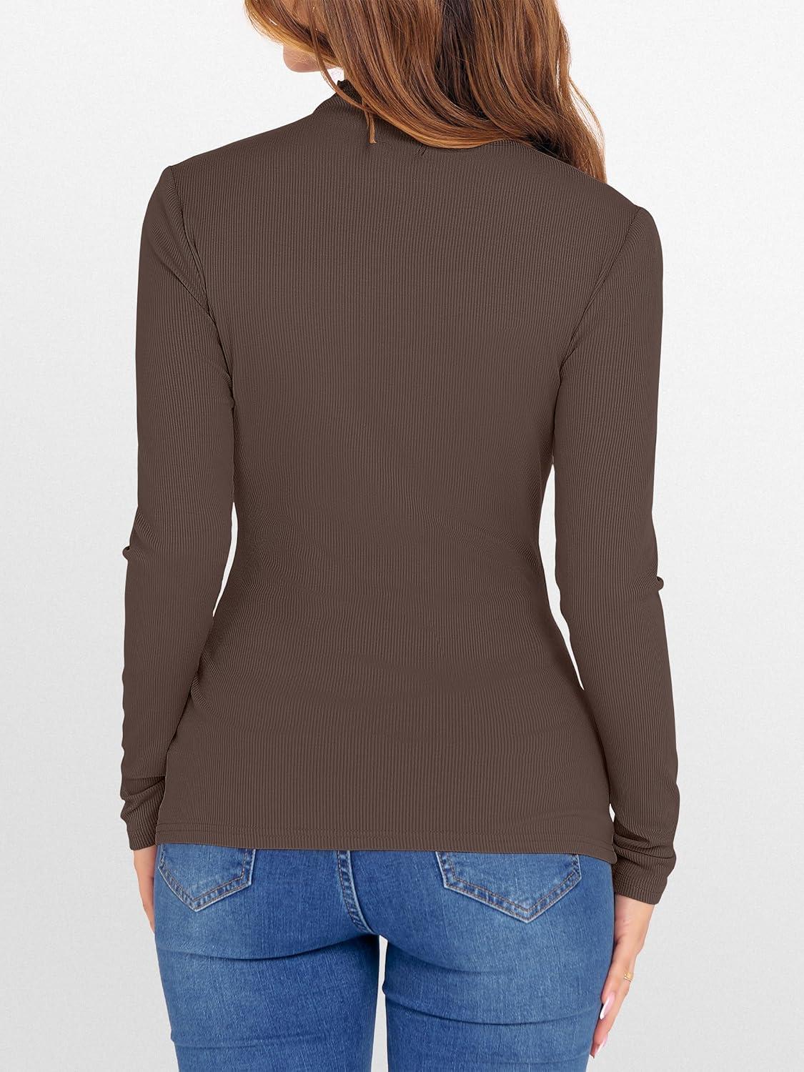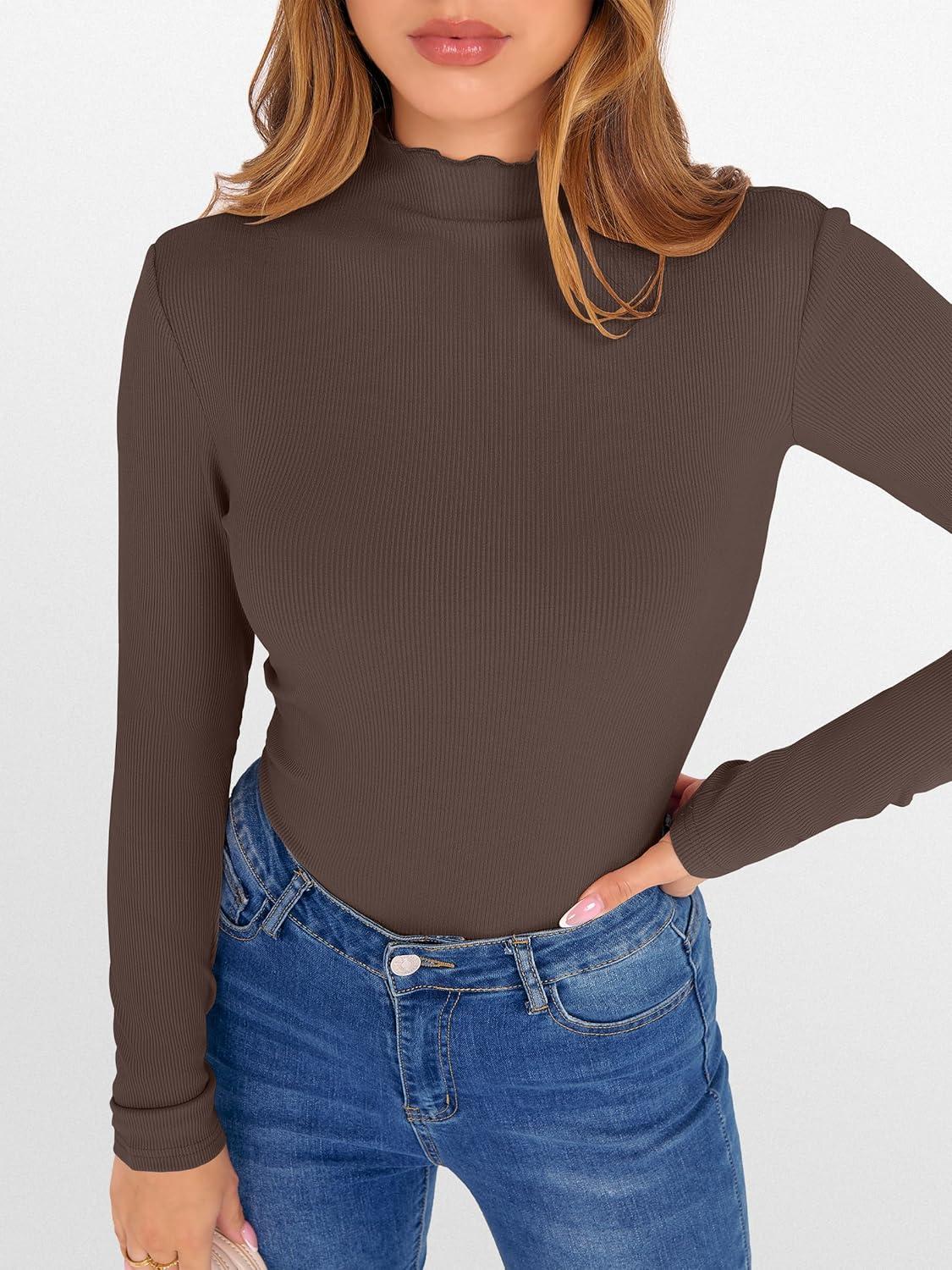 ANRABESS Women's Lettuce Trim Mock Neck Long Sleeve Tops 2025 Casual Dressy Ribbed Knit Slim Fit Tee Shirt Fall Layer Outfits(Coffee)