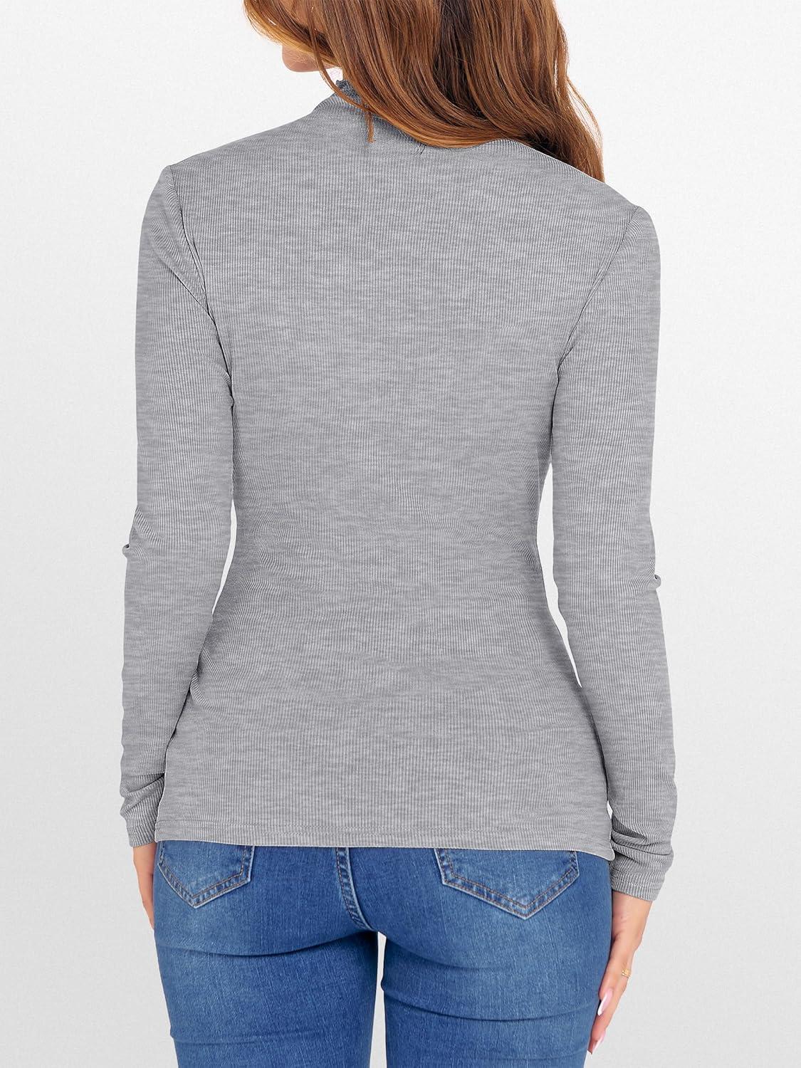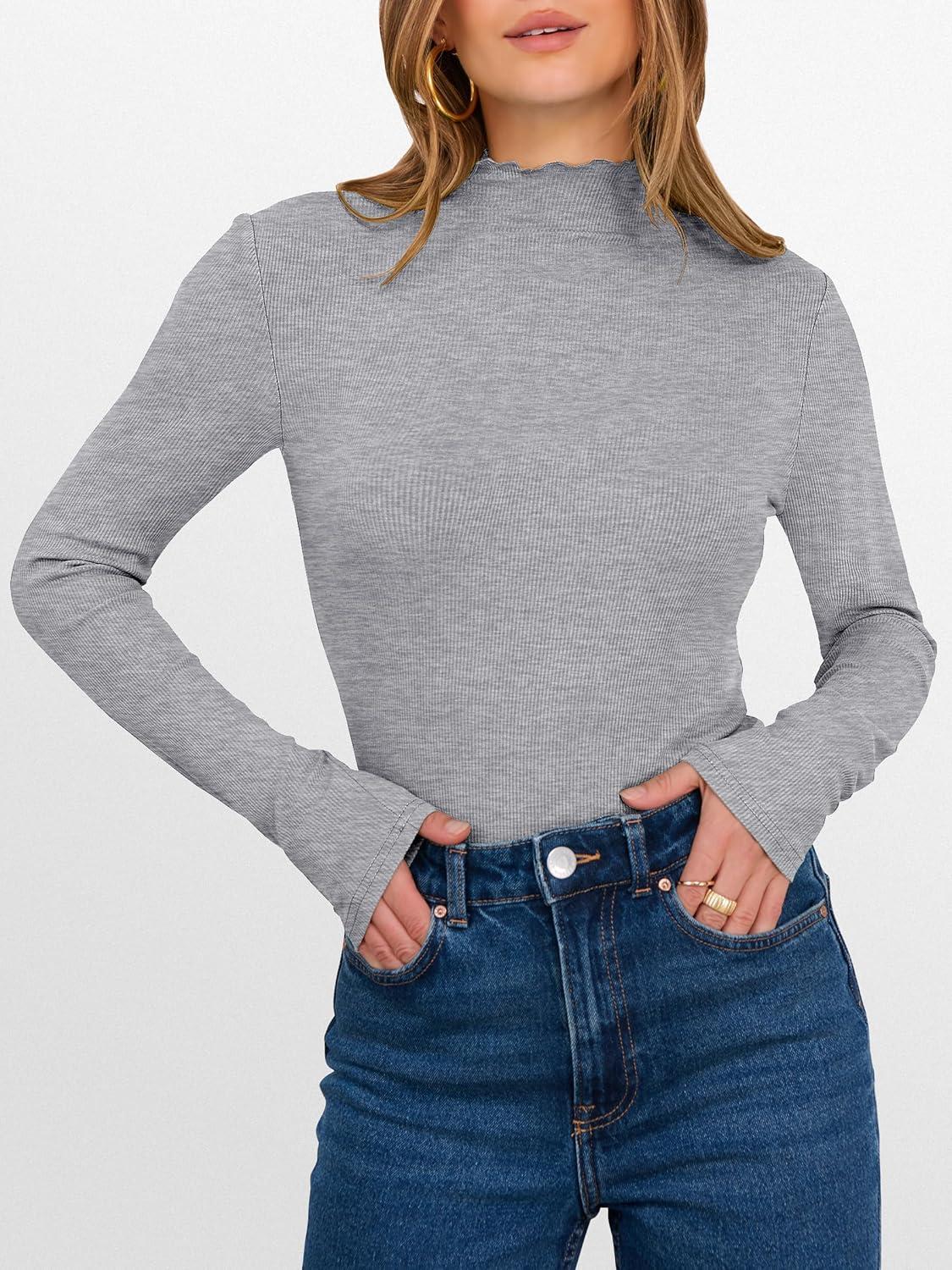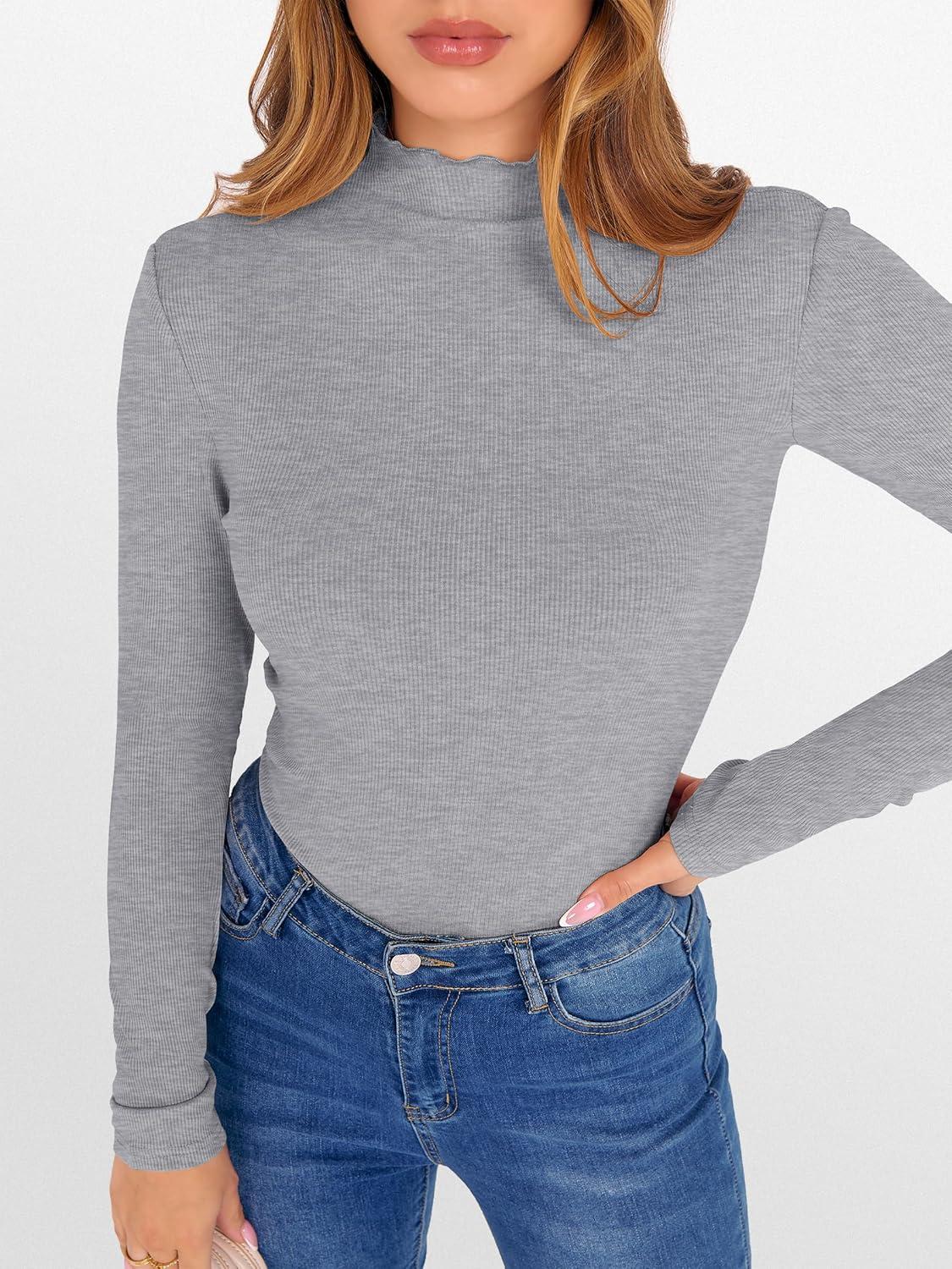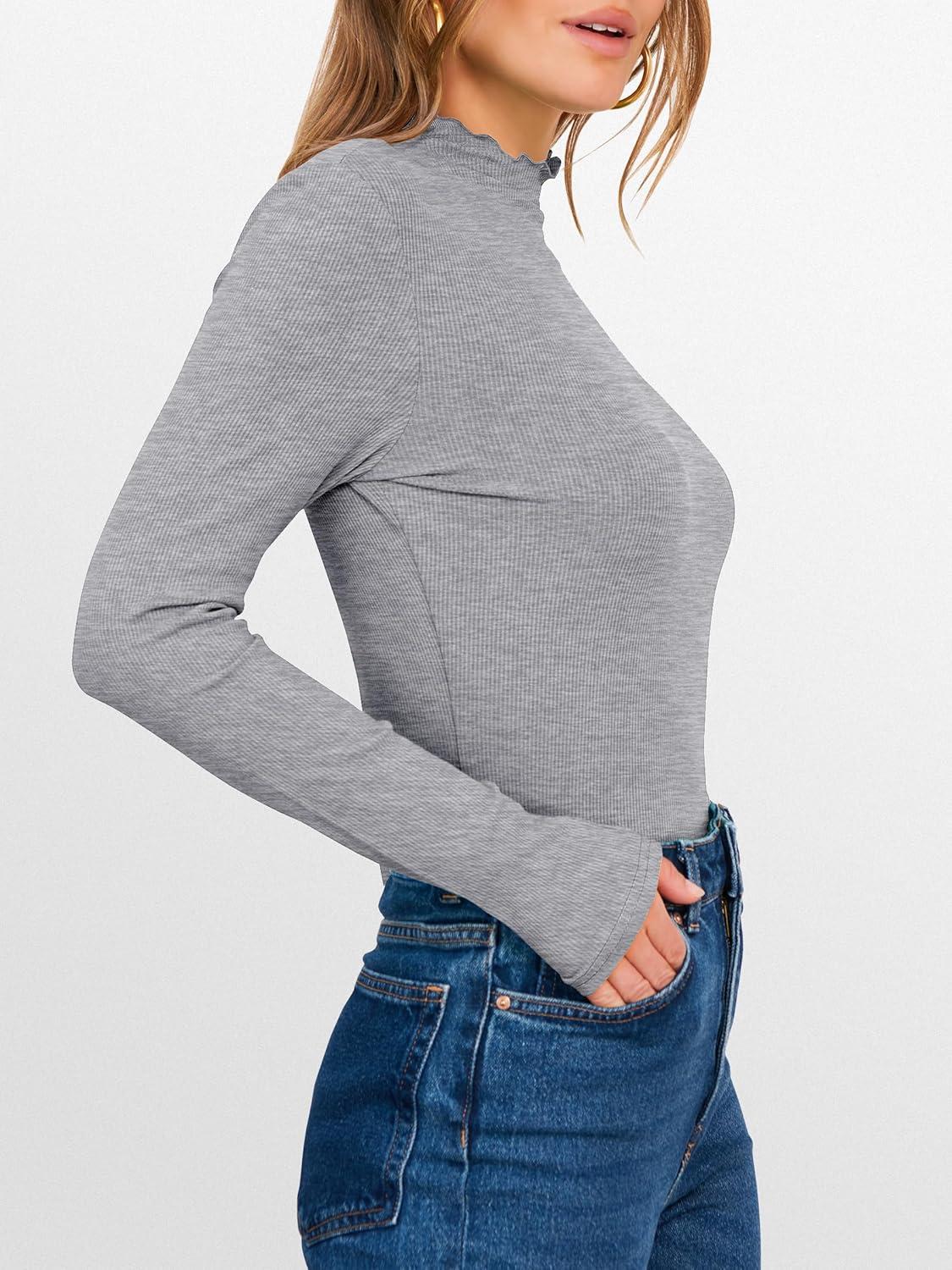 ANRABESS Women's Lettuce Trim Mock Neck Long Sleeve Tops 2025 Casual Dressy Ribbed Knit Slim Fit Tee Shirt Fall Layer Outfits(Grey)