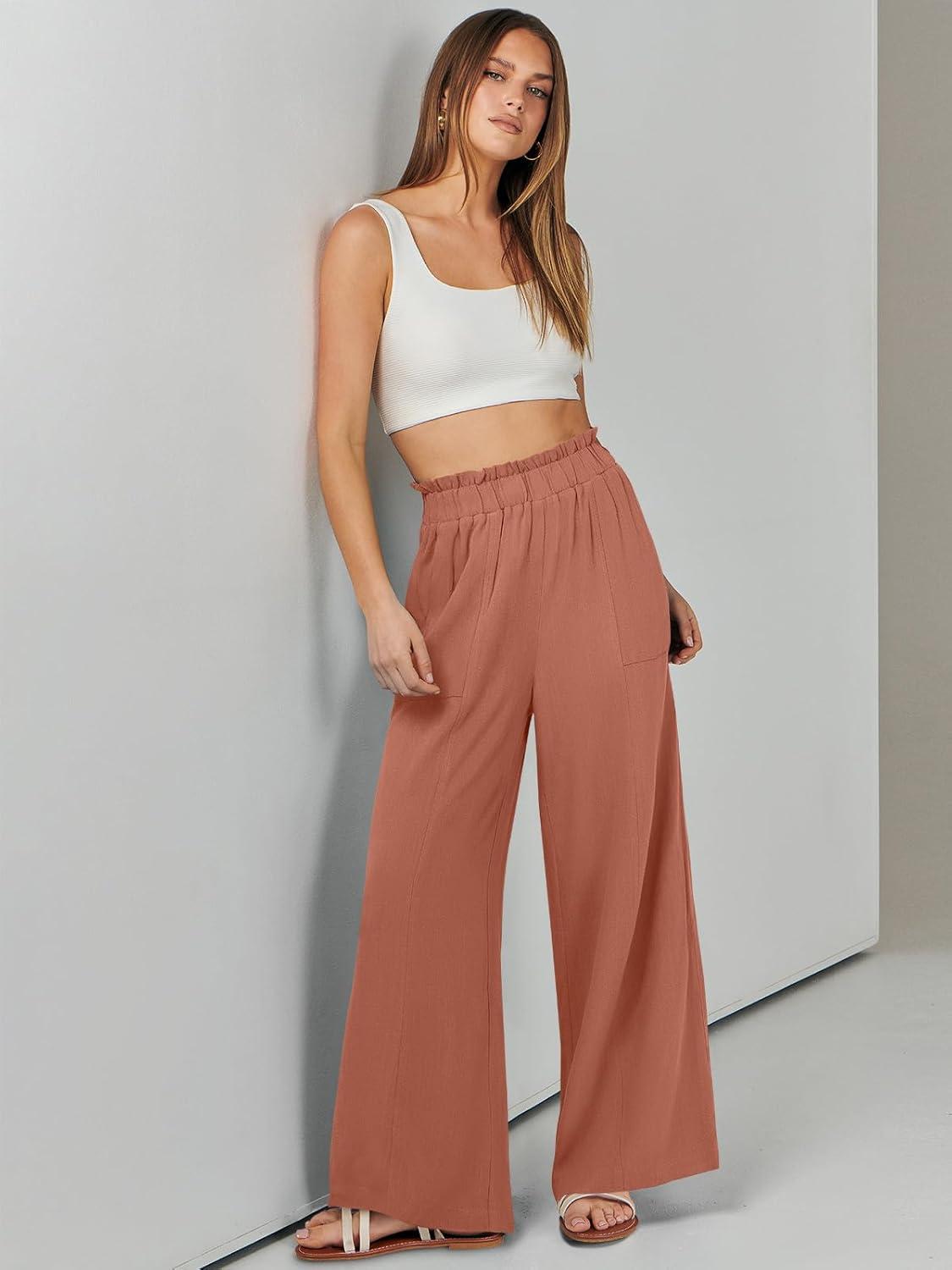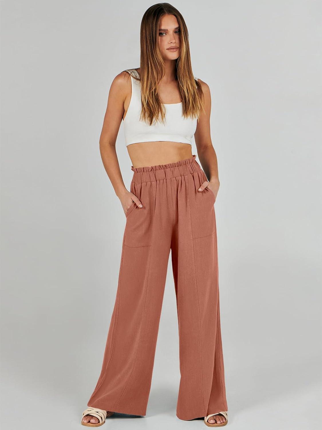ANRABESS Womens Linen Pants 2025 Summer Casual Loose Wide Leg Palazzo Pants High Waist Flowy Beach Trousers Work Outfits(Rust Orange)