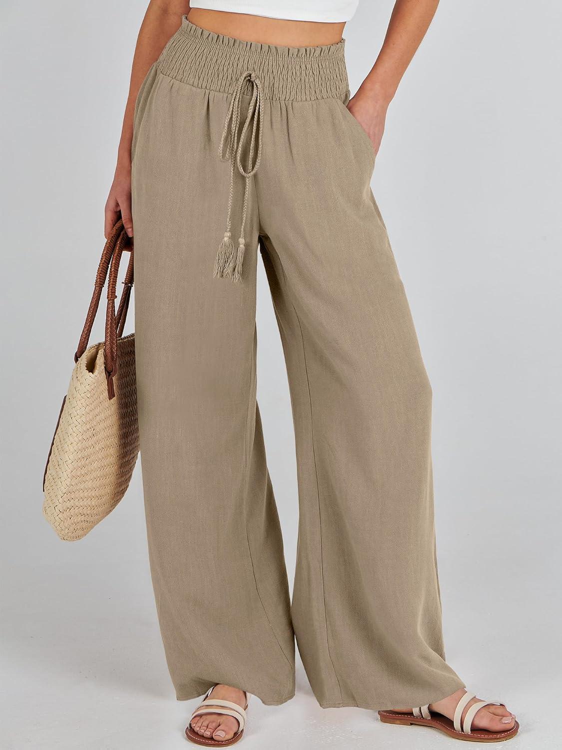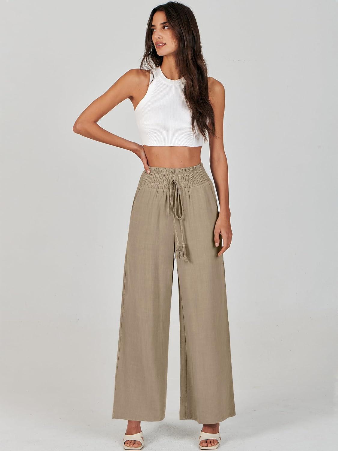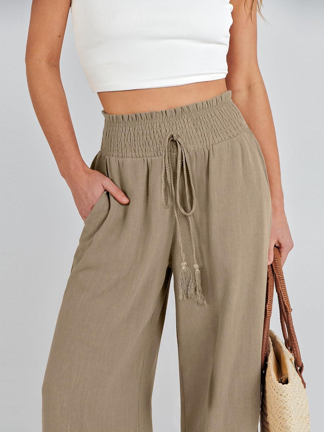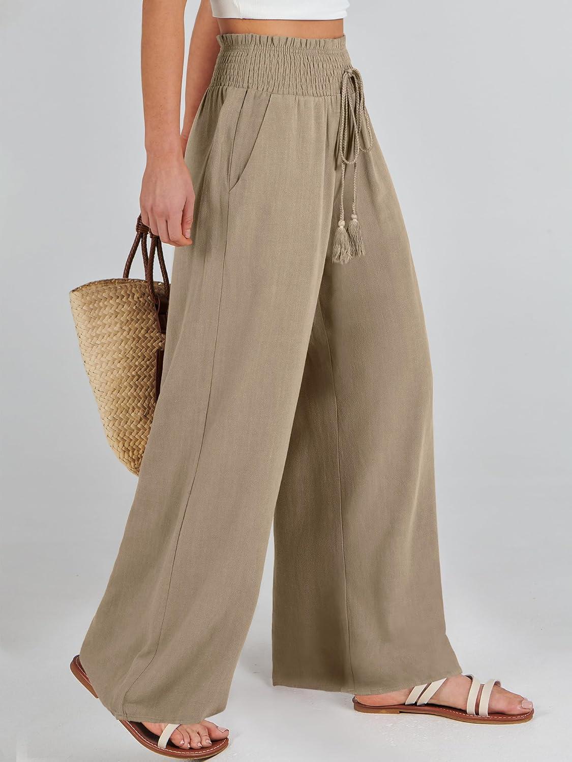 ANRABESS Women’s Linen Pants Summer Casual Palazzo Beach Pant Drawstring High Waist Wide Leg Trousers Vacation Outfits(Beige)