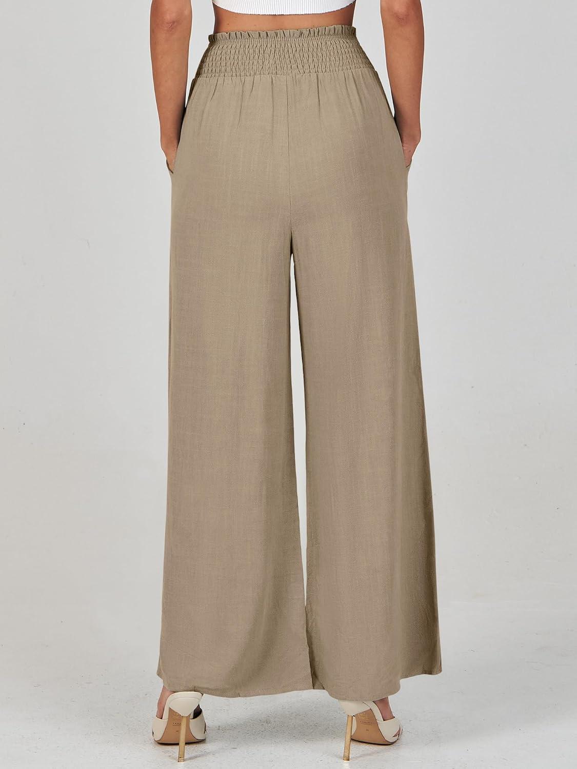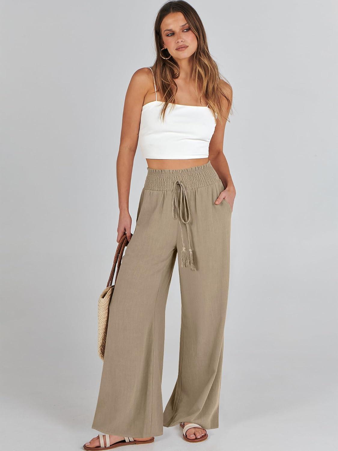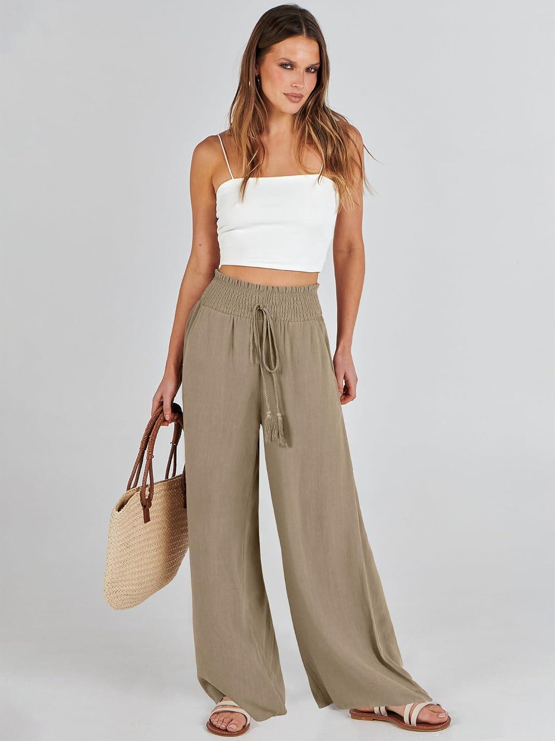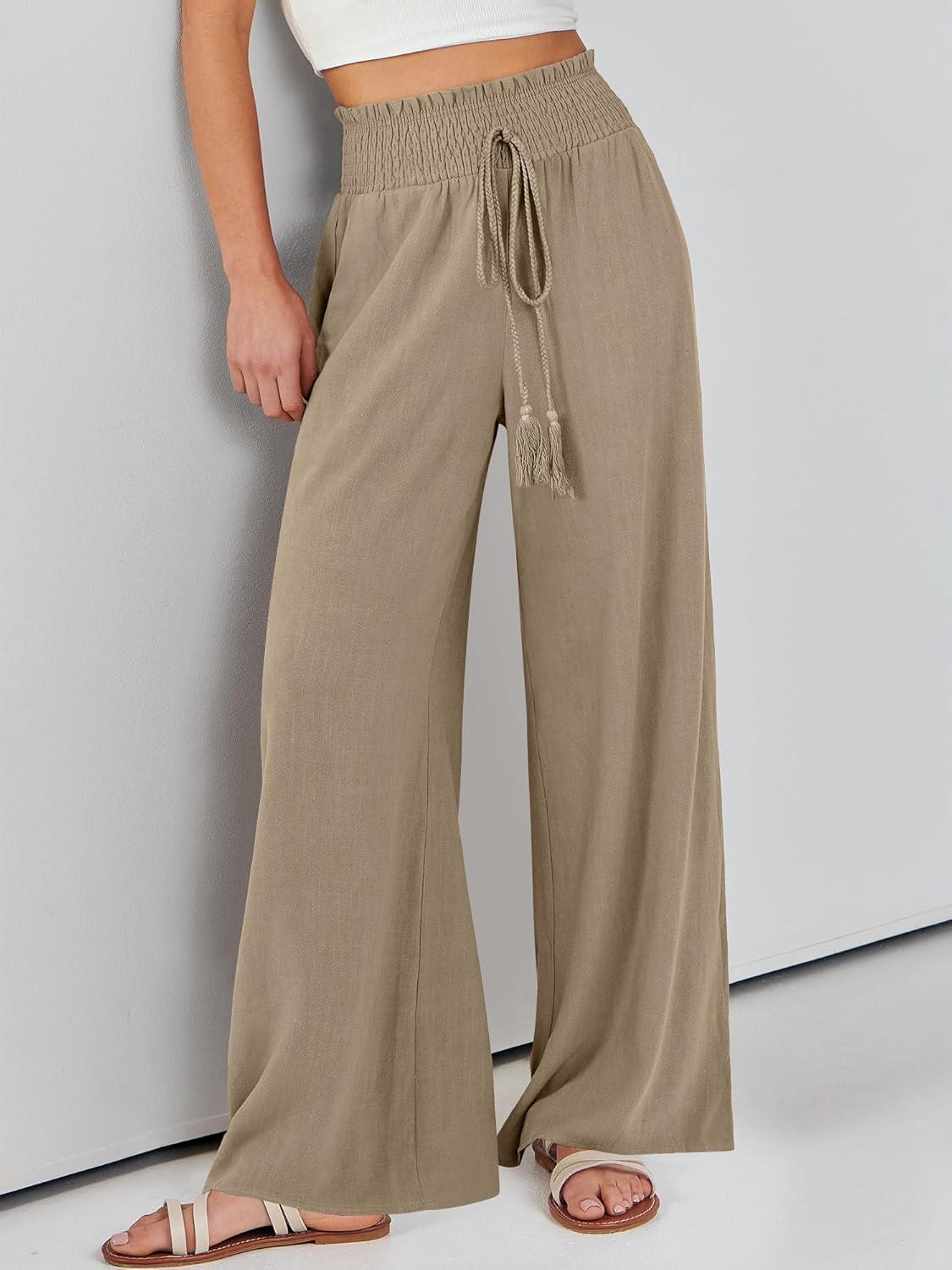 ANRABESS Women’s Linen Pants Summer Casual Palazzo Beach Pant Drawstring High Waist Wide Leg Trousers Vacation Outfits(Beige)