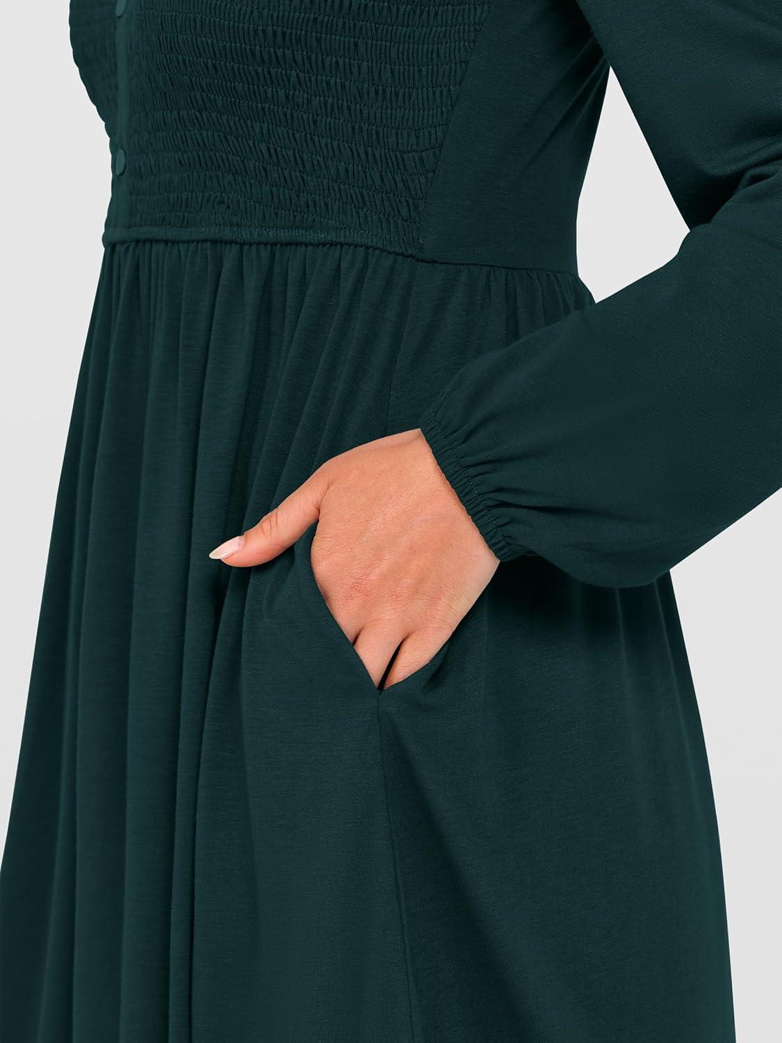 imageANRABESS Womens Long Lantern Sleeve Dresses 2025 Fall Casual Smocked ALine High Waist Flowy Short Dress with Pockets TrendyDeep Green