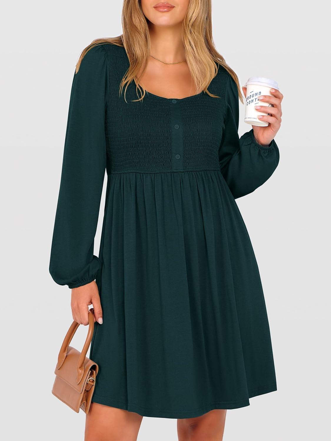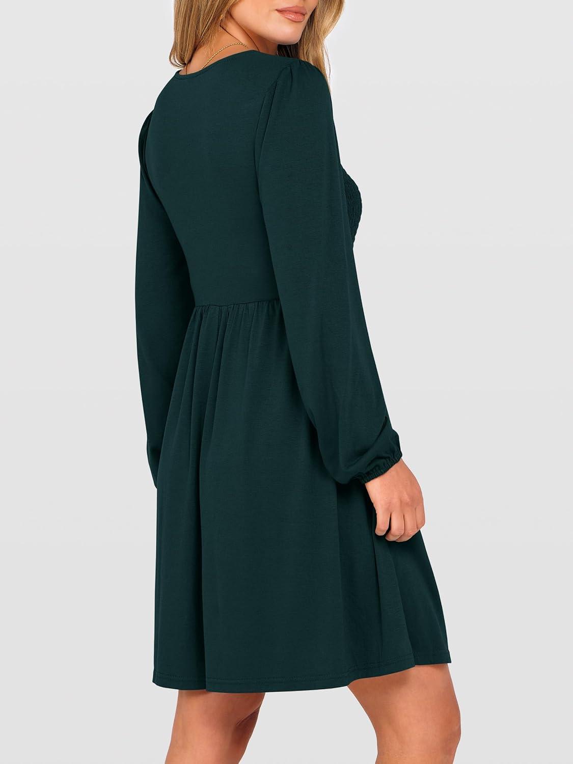 ANRABESS Womens Long Lantern Sleeve Dresses 2025 Fall Casual Smocked A-Line High Waist Flowy Short Dress with Pockets Trendy(Deep Green)
