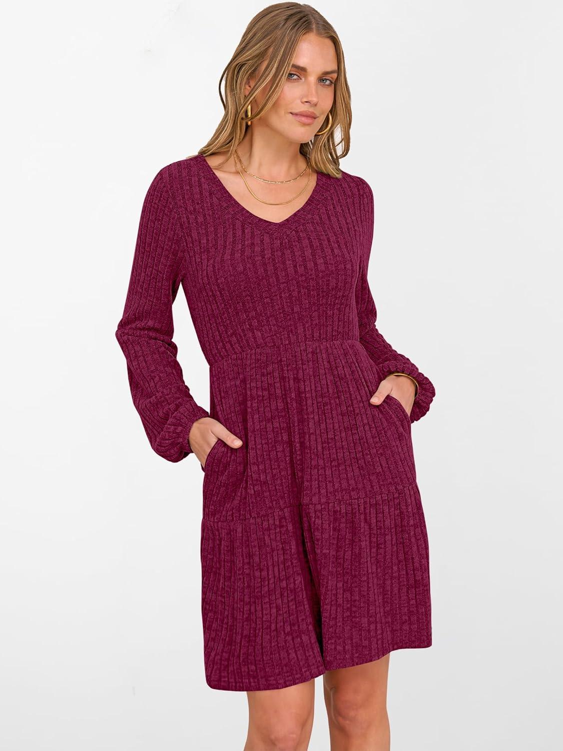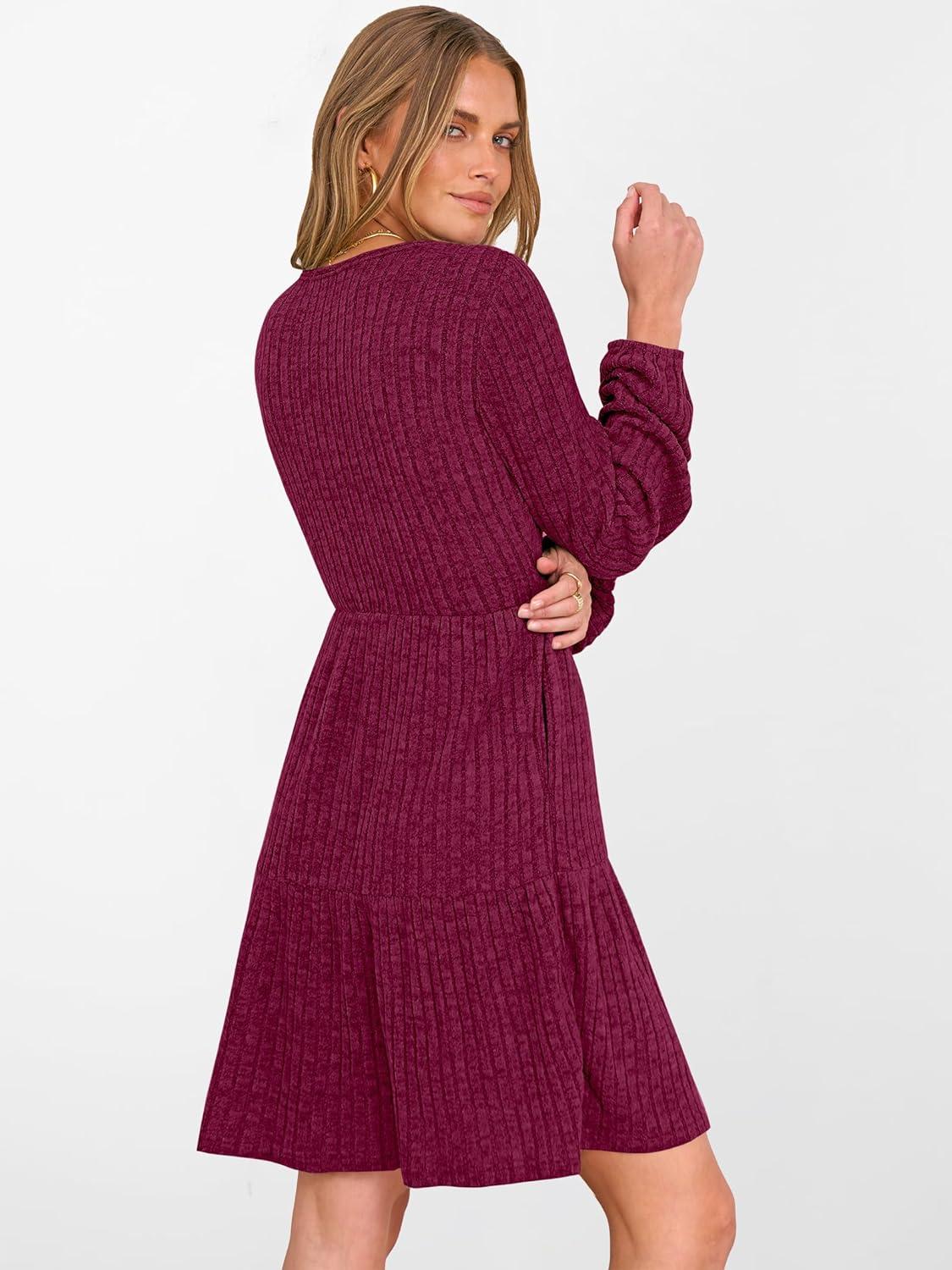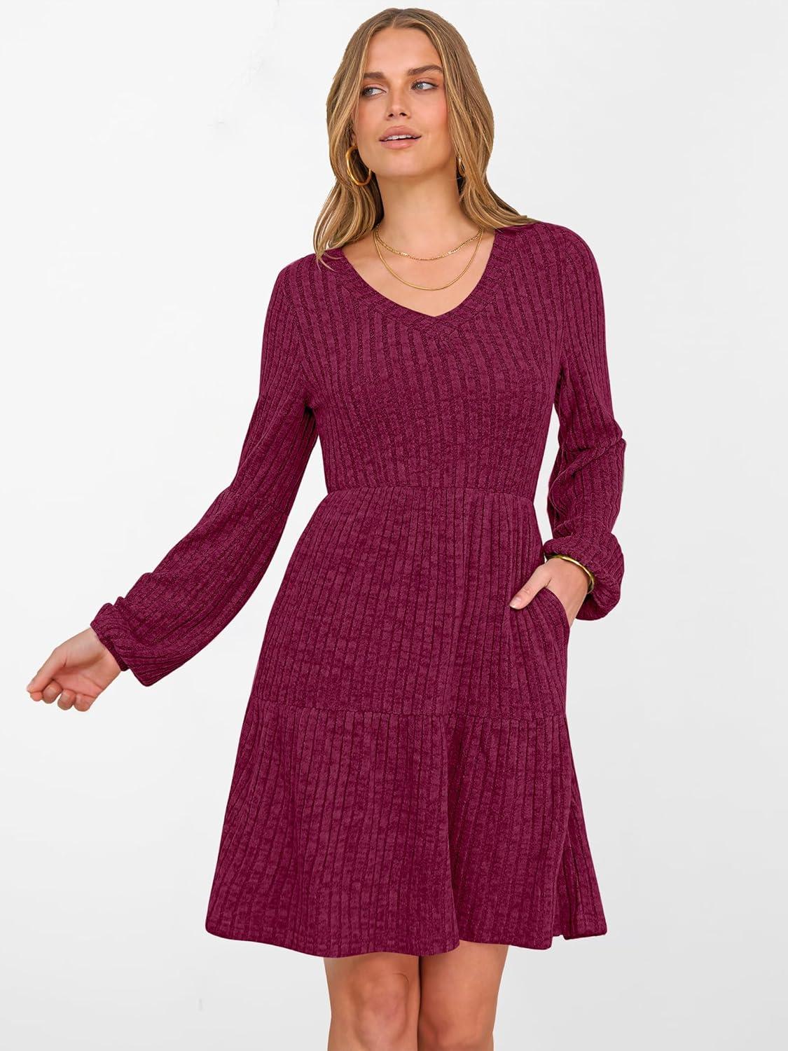 ANRABESS Women's Long Lantern Sleeve Ribbed Knit Dresses V Neck Casual 2025 Fall Winter Flowy Swing Tunic Sweater Short Dress(Burgundy)