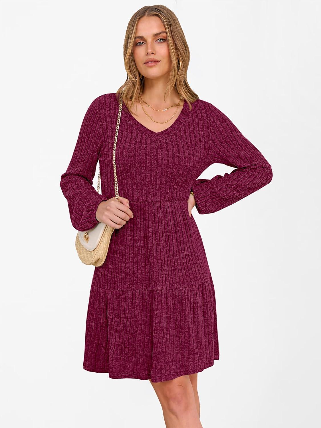 ANRABESS Women’s Long Lantern Sleeve Ribbed Knit Dresses V Neck Casual 2025 Fall Winter Flowy Swing Tunic Sweater Short Dress(Burgundy)