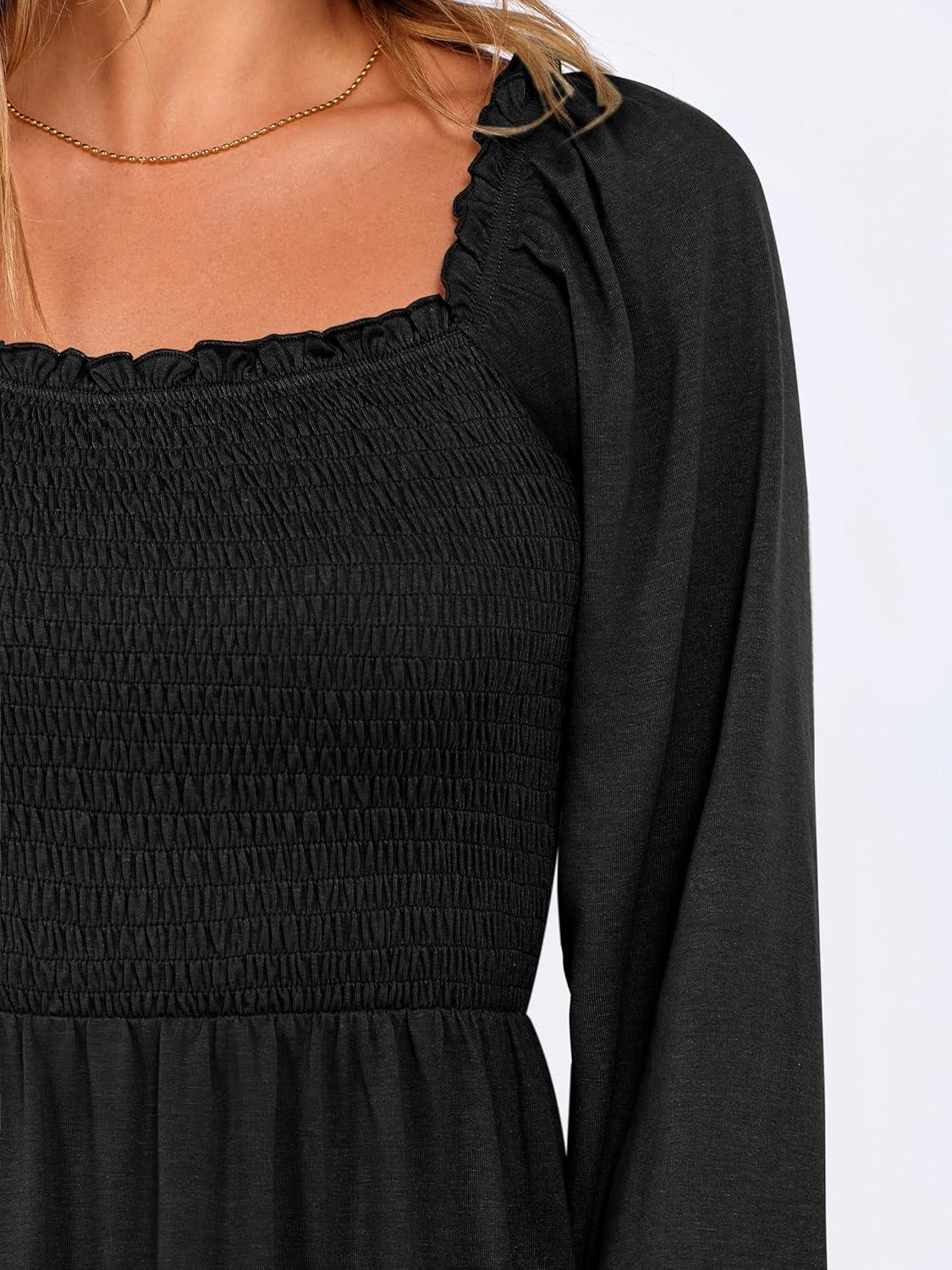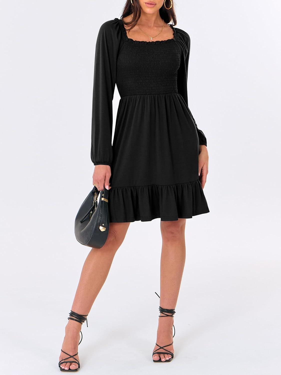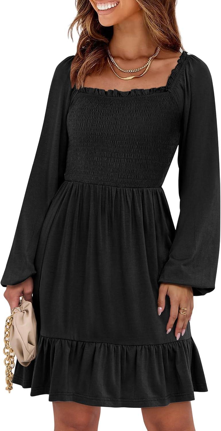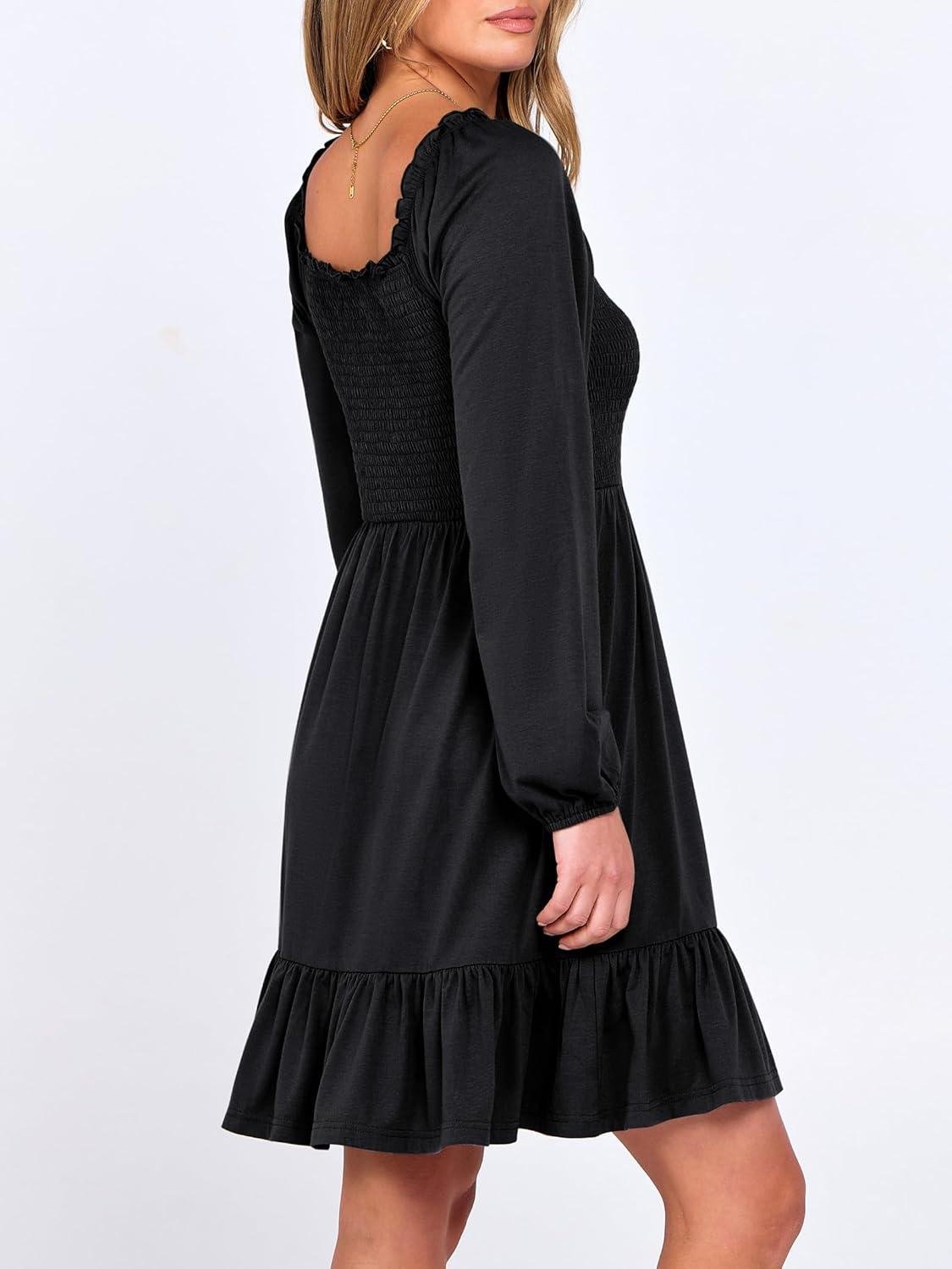 ANRABESS Womens Long Lantern Sleeve Square Neck Dress Smocked Tiered High Waist Ruffle Flowy Swing 2026 Spring Short Dresses(Black)