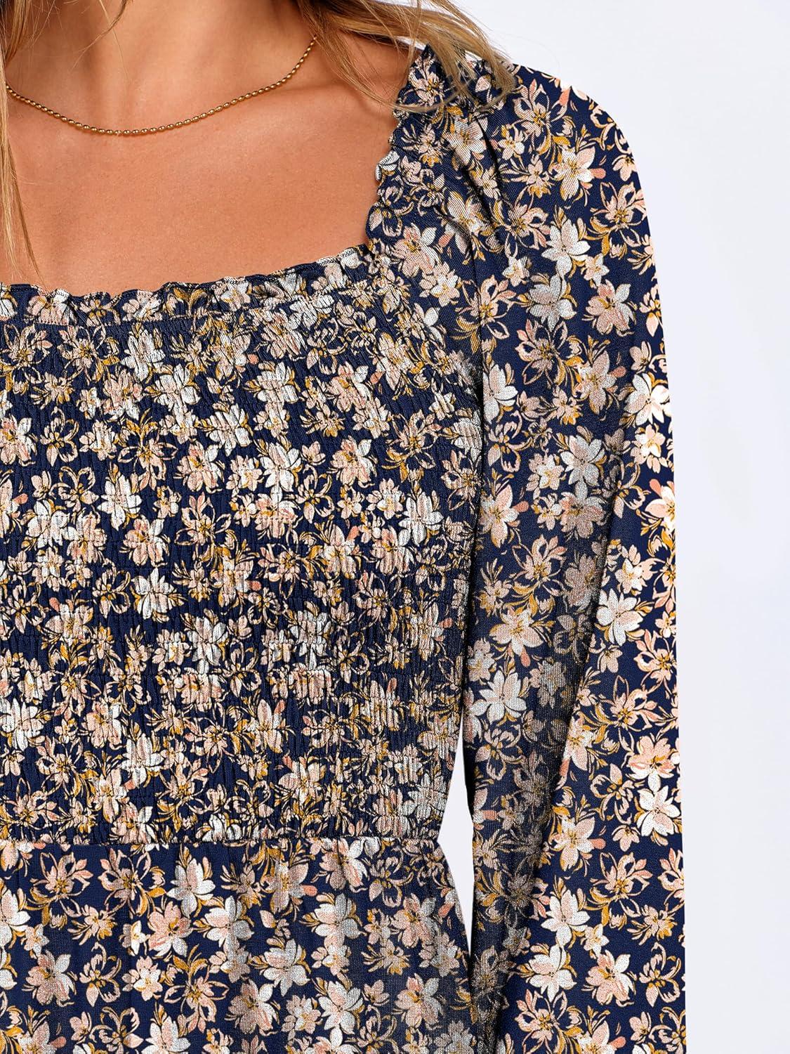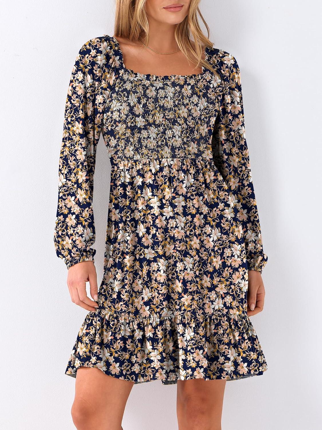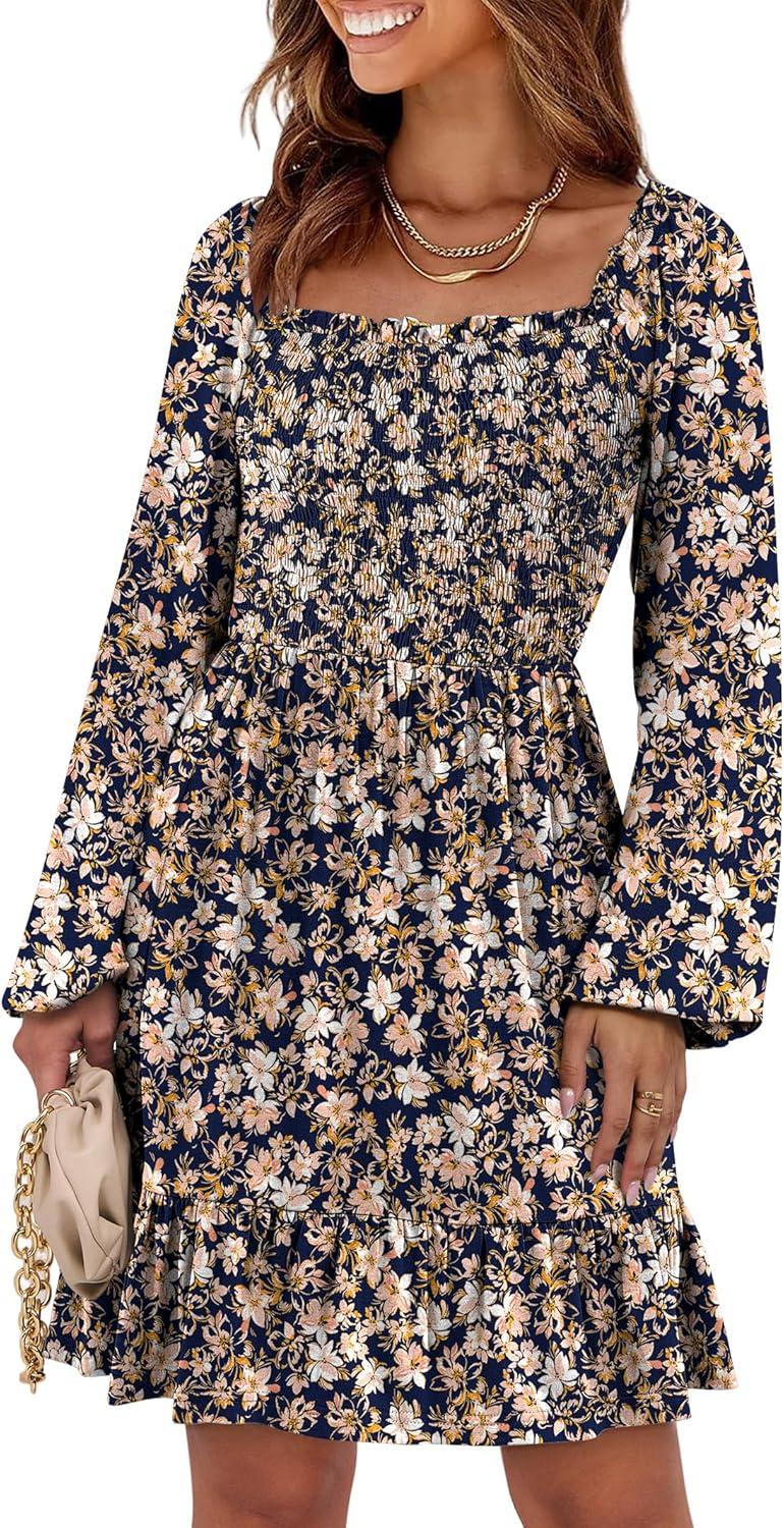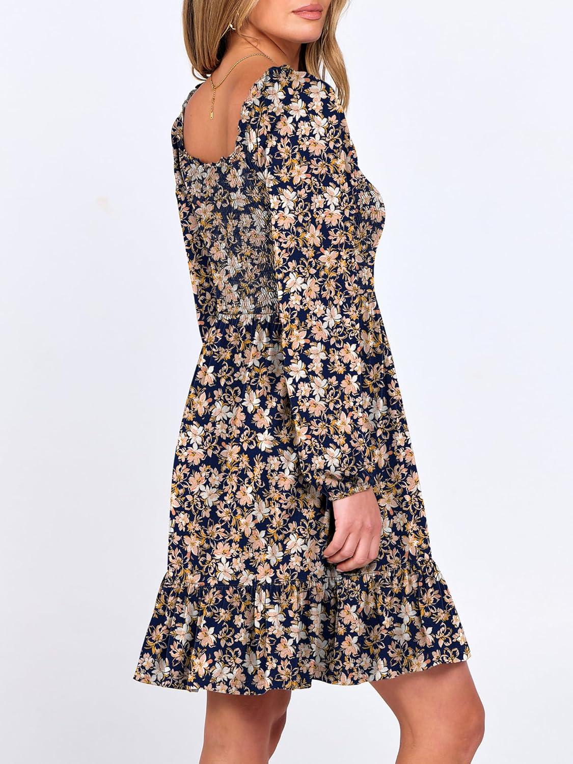 ANRABESS Womens Long Lantern Sleeve Square Neck Dress Smocked Tiered High Waist Ruffle Flowy Swing 2026 Spring Short Dresses(Floral Navy Blue)