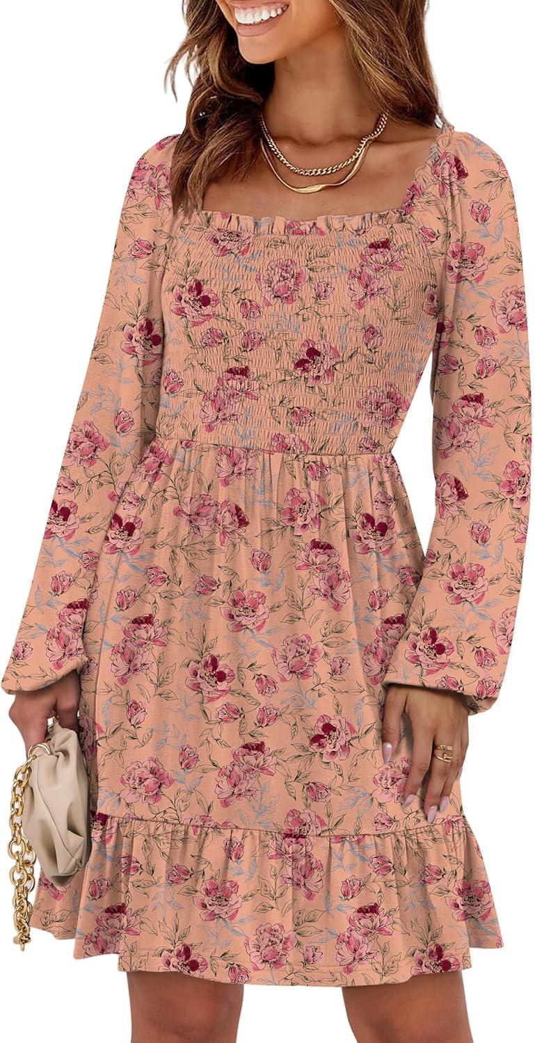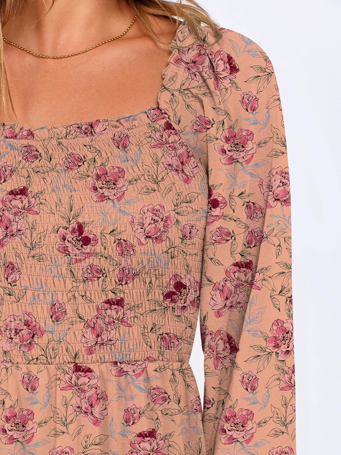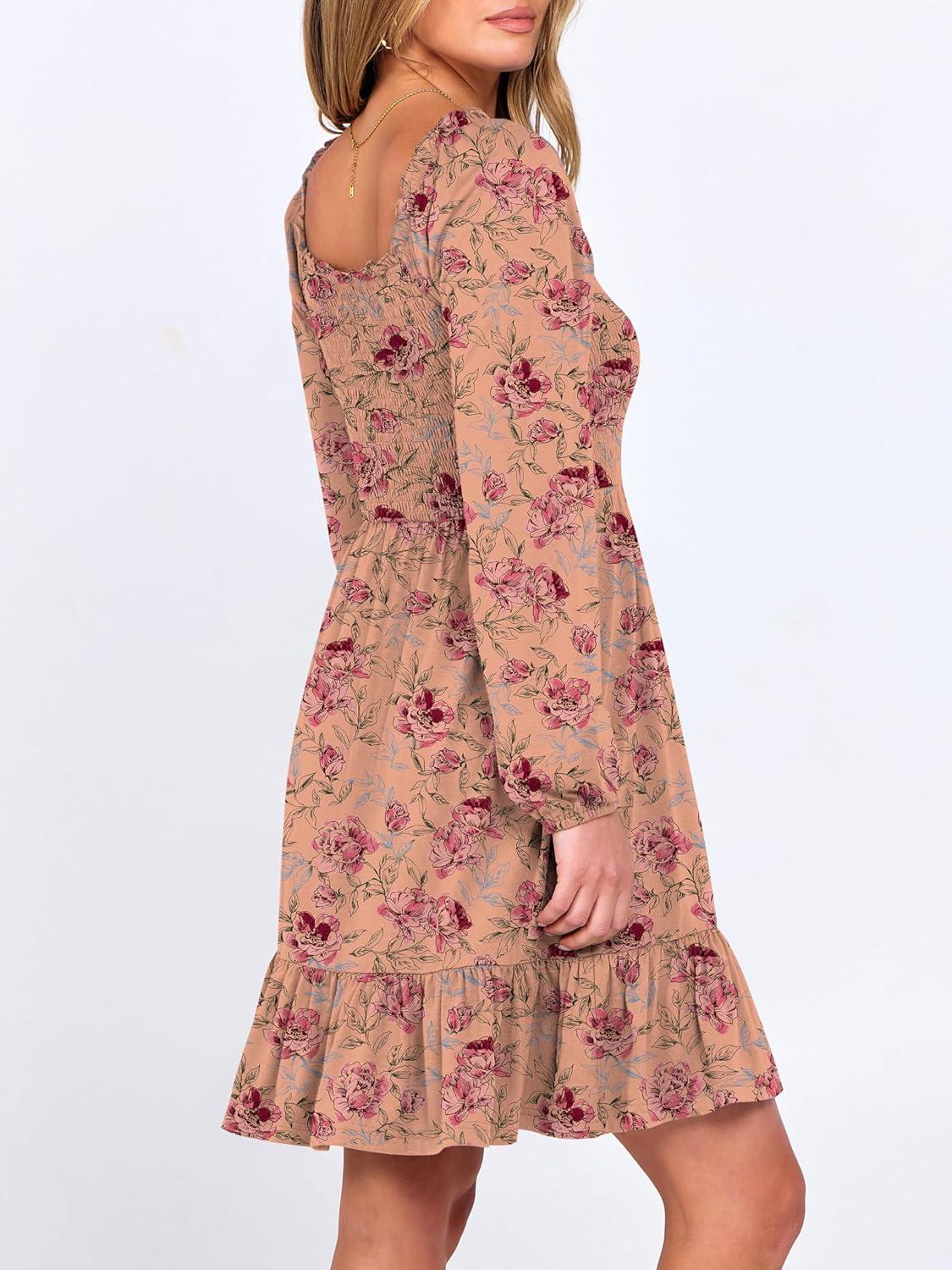 ANRABESS Womens Long Lantern Sleeve Square Neck Dress Smocked Tiered High Waist Ruffle Flowy Swing 2026 Spring Short Dresses(Print Rose Pink)