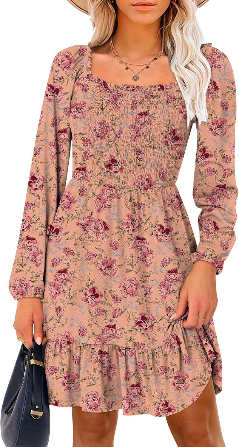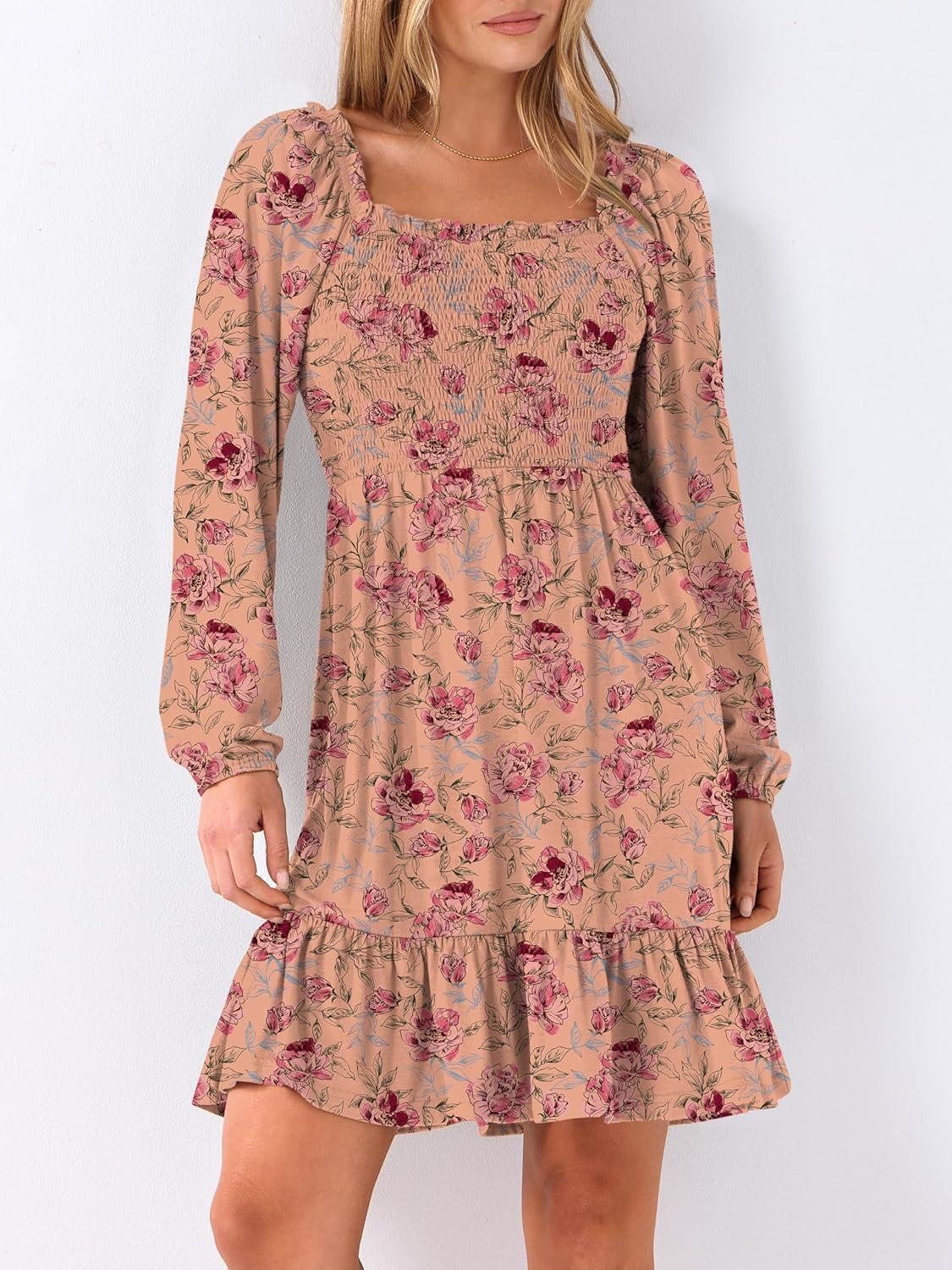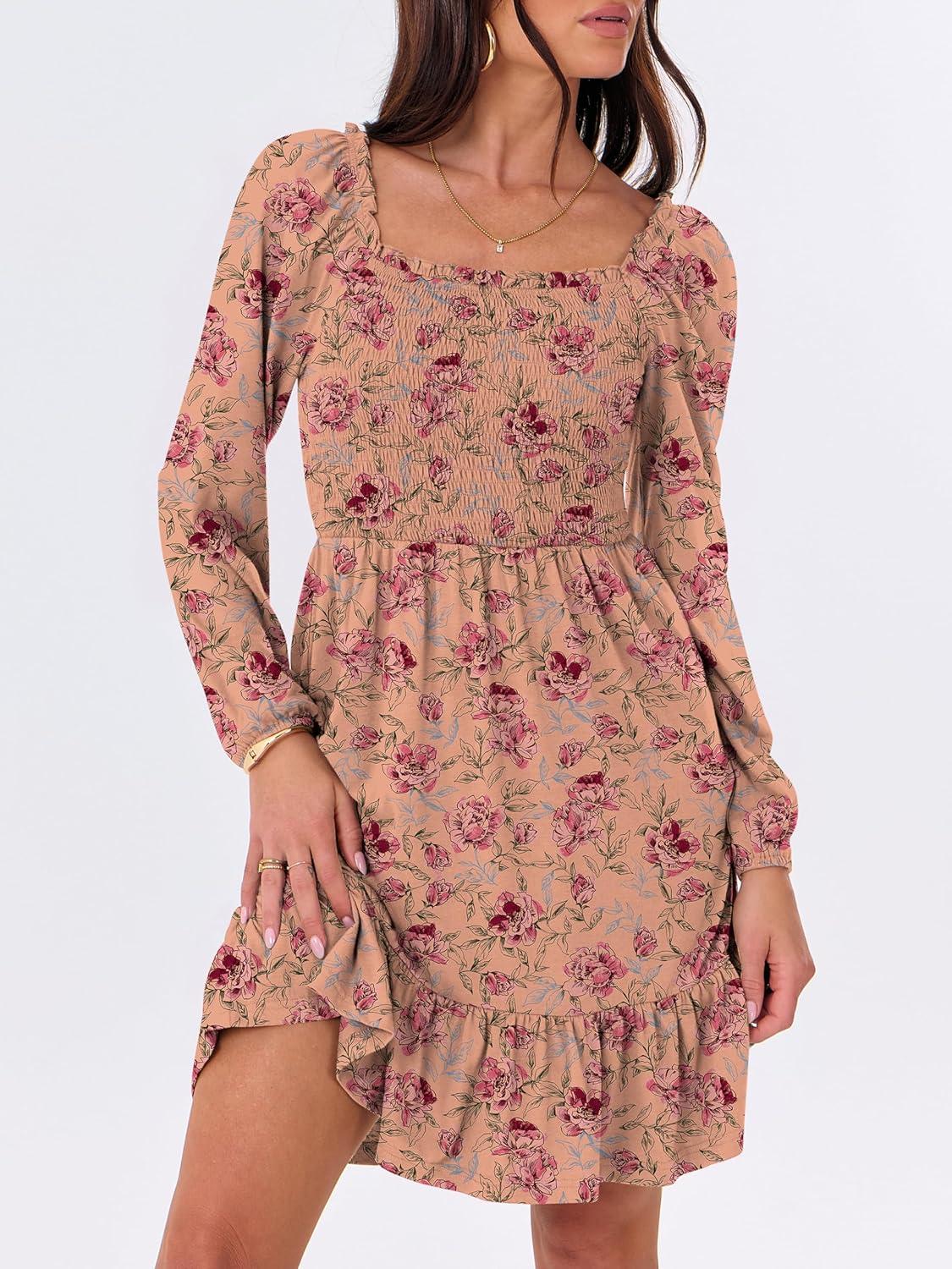 ANRABESS Womens Long Lantern Sleeve Square Neck Dress Smocked Tiered High Waist Ruffle Flowy Swing 2026 Spring Short Dresses(Print Rose Pink)