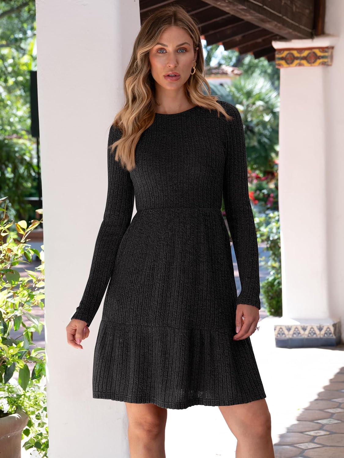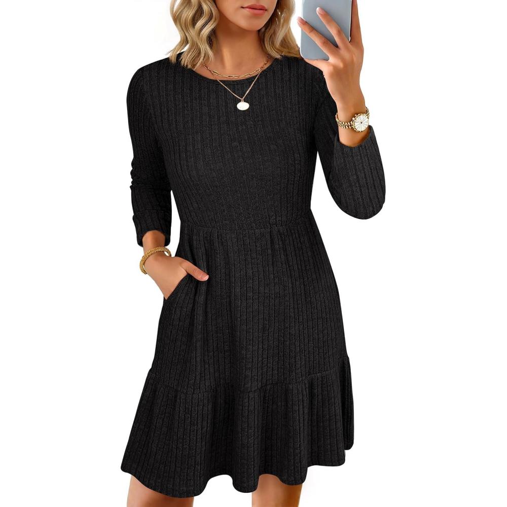 ANRABESS Womens Long Sleeve 2025 Fall Short Dress Casual Ribbed Knit Crewneck Flowy A Line Mini Sweater Dresses with Pockets(Black)