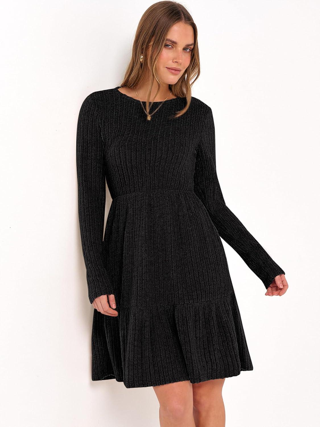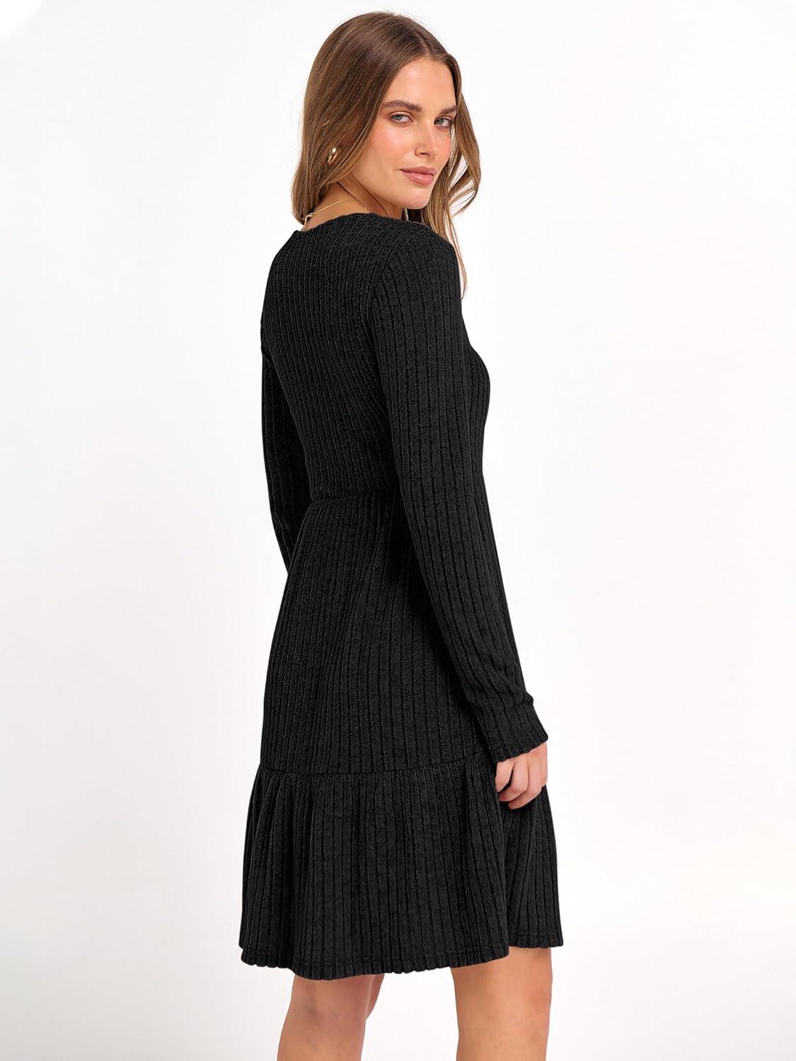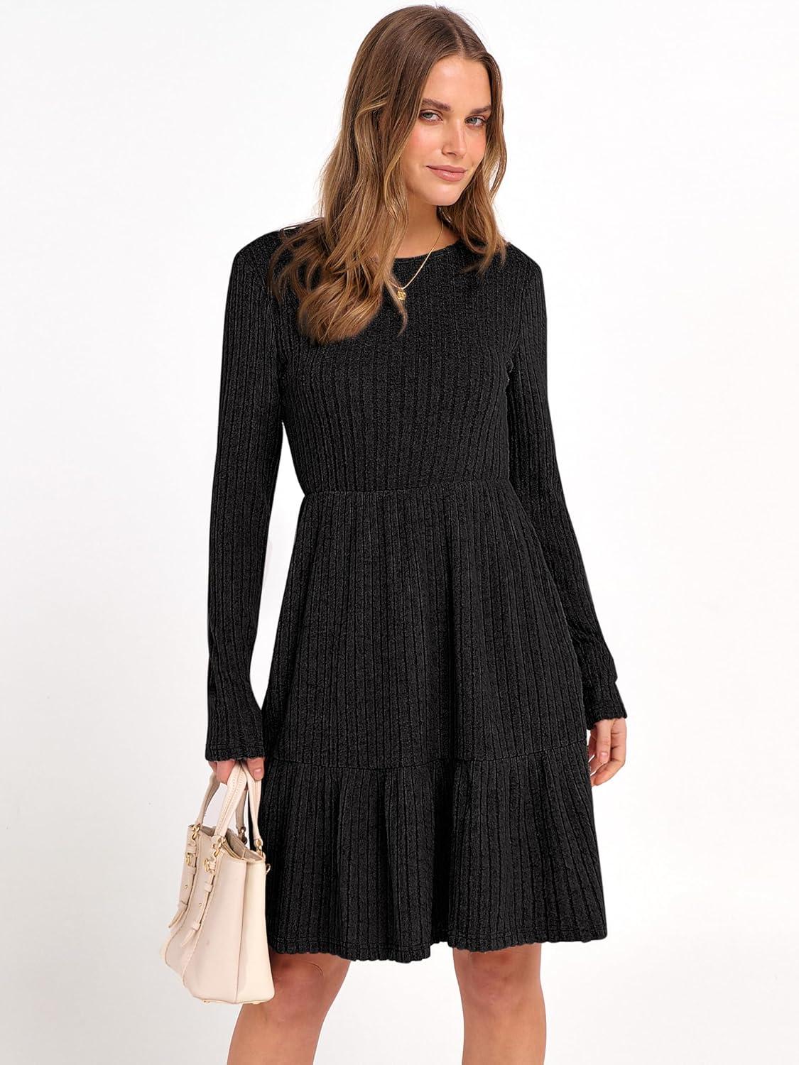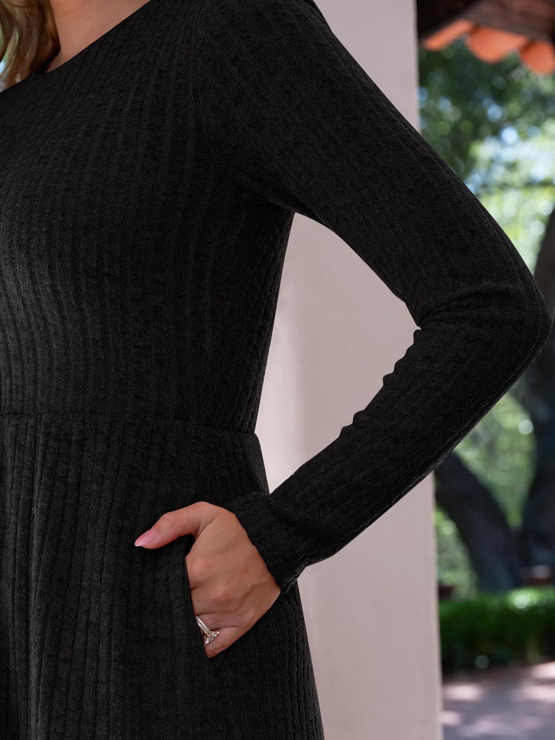 imageANRABESS Womens Long Sleeve 2025 Fall Short Dress Casual Ribbed Knit Crewneck Flowy A Line Mini Sweater Dresses with PocketsBlack