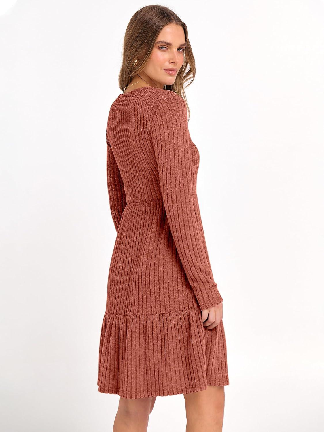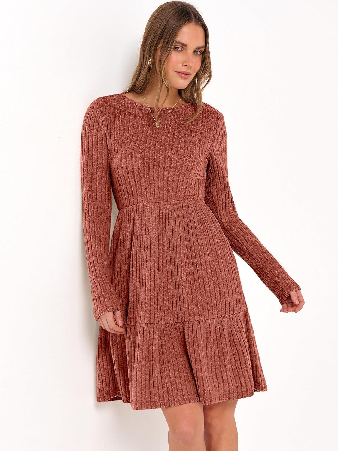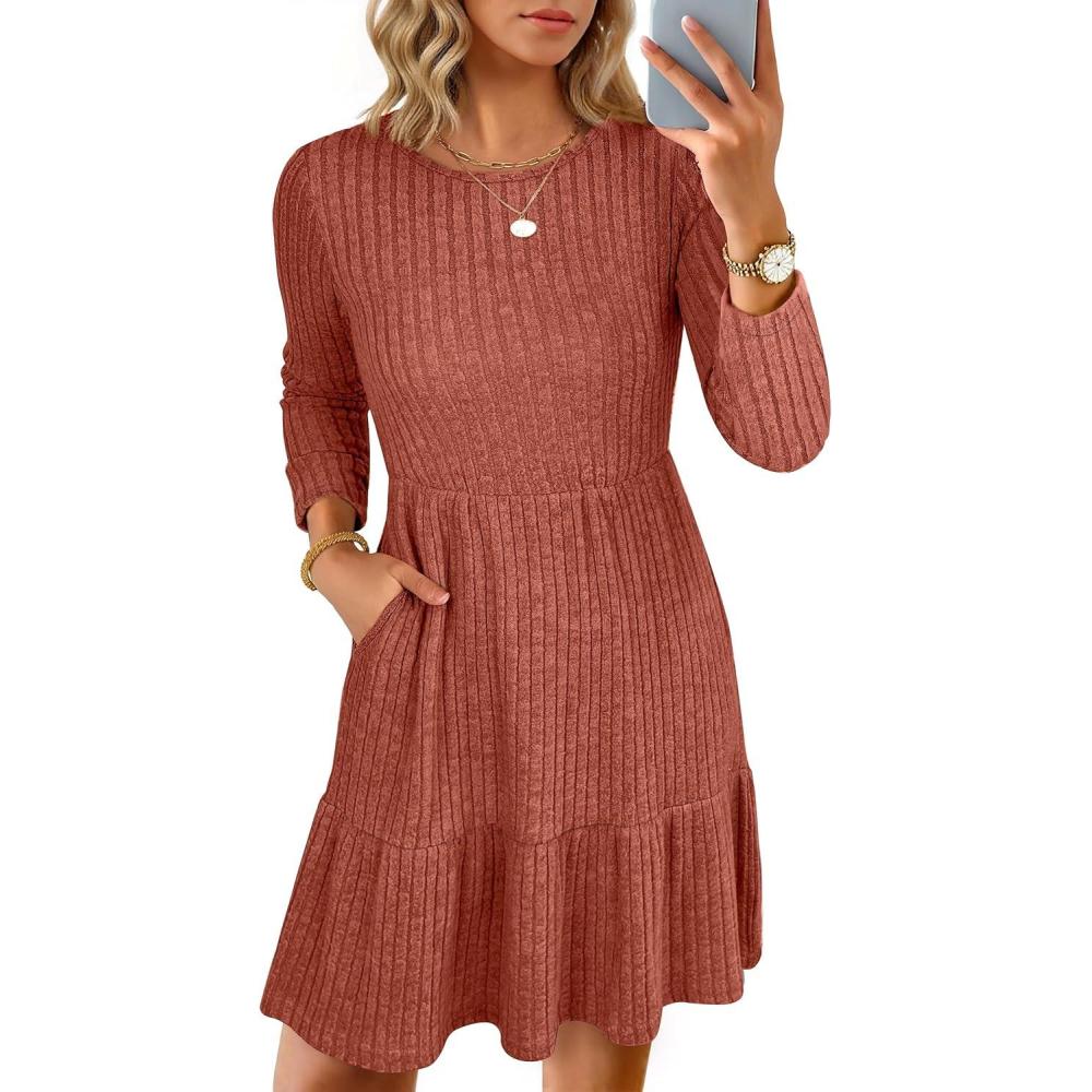 imageANRABESS Womens Long Sleeve 2025 Fall Short Dress Casual Ribbed Knit Crewneck Flowy A Line Mini Sweater Dresses with PocketsBurnt Orange