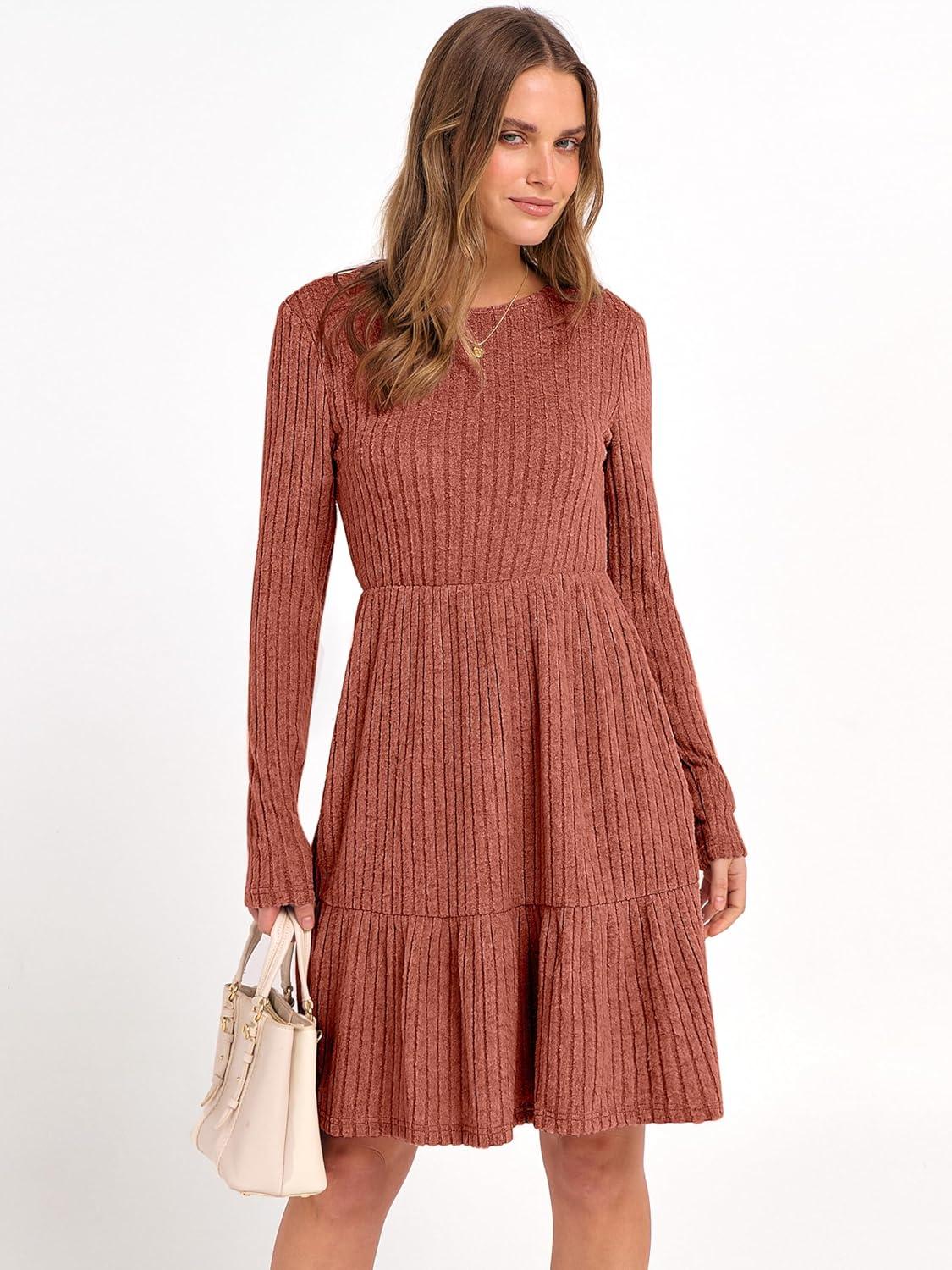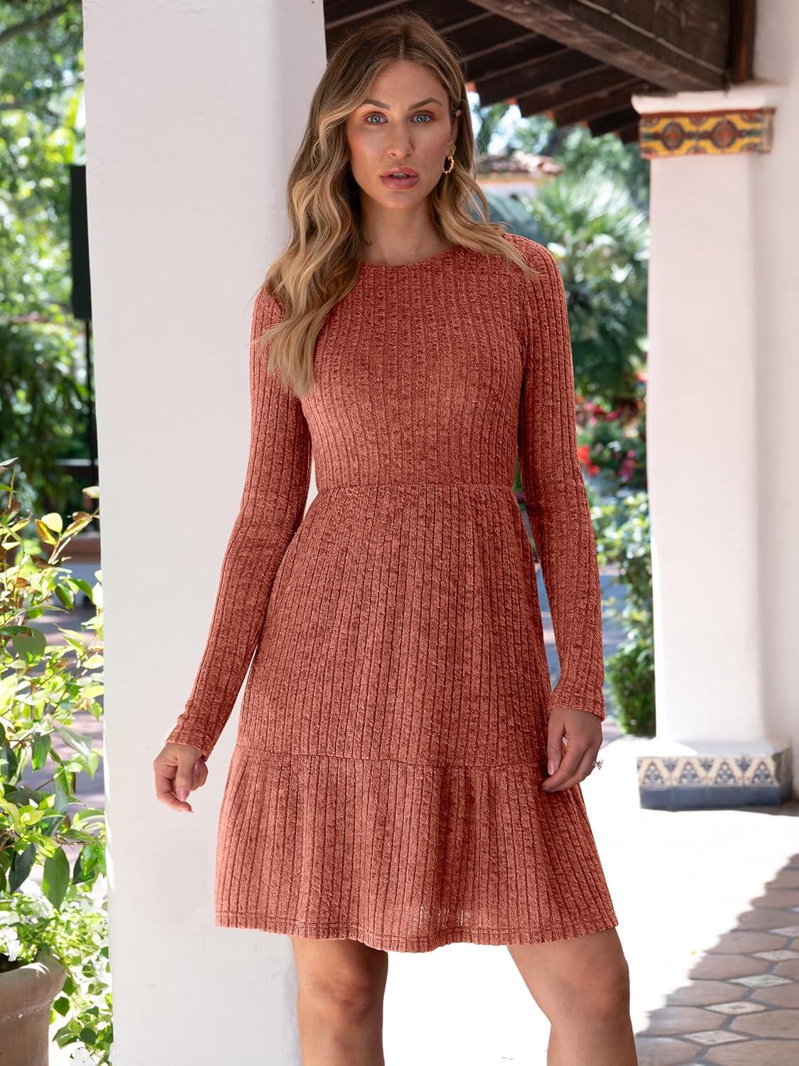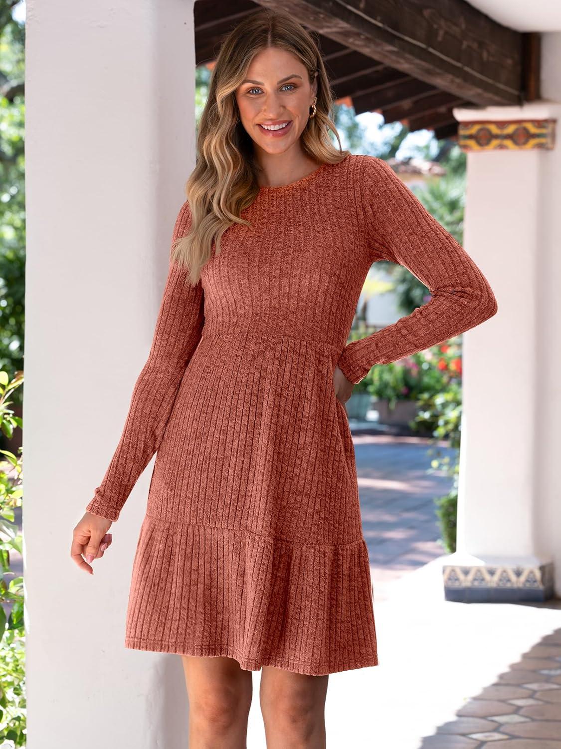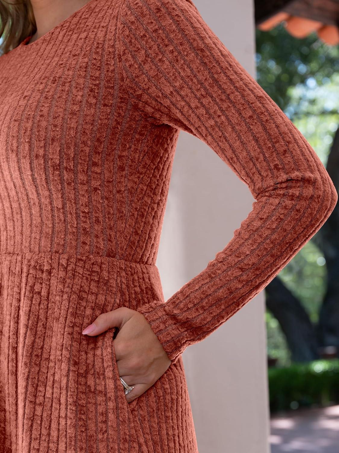 ANRABESS Womens Long Sleeve 2025 Fall Short Dress Casual Ribbed Knit Crewneck Flowy A Line Mini Sweater Dresses with Pockets(Burnt Orange)