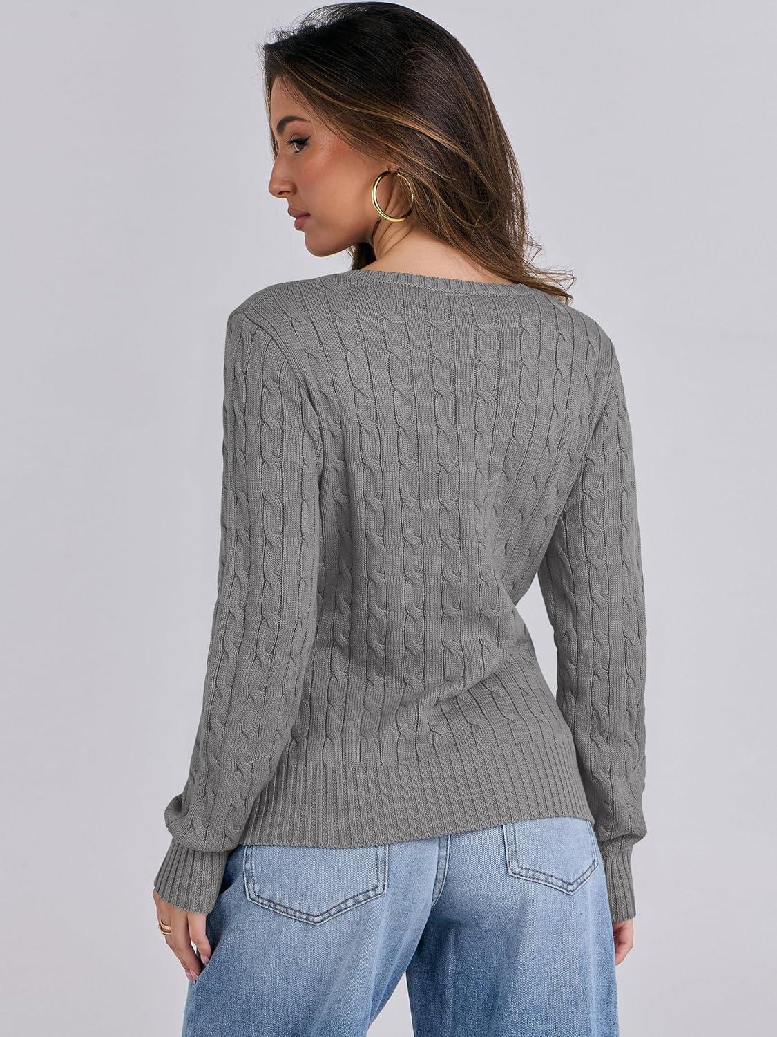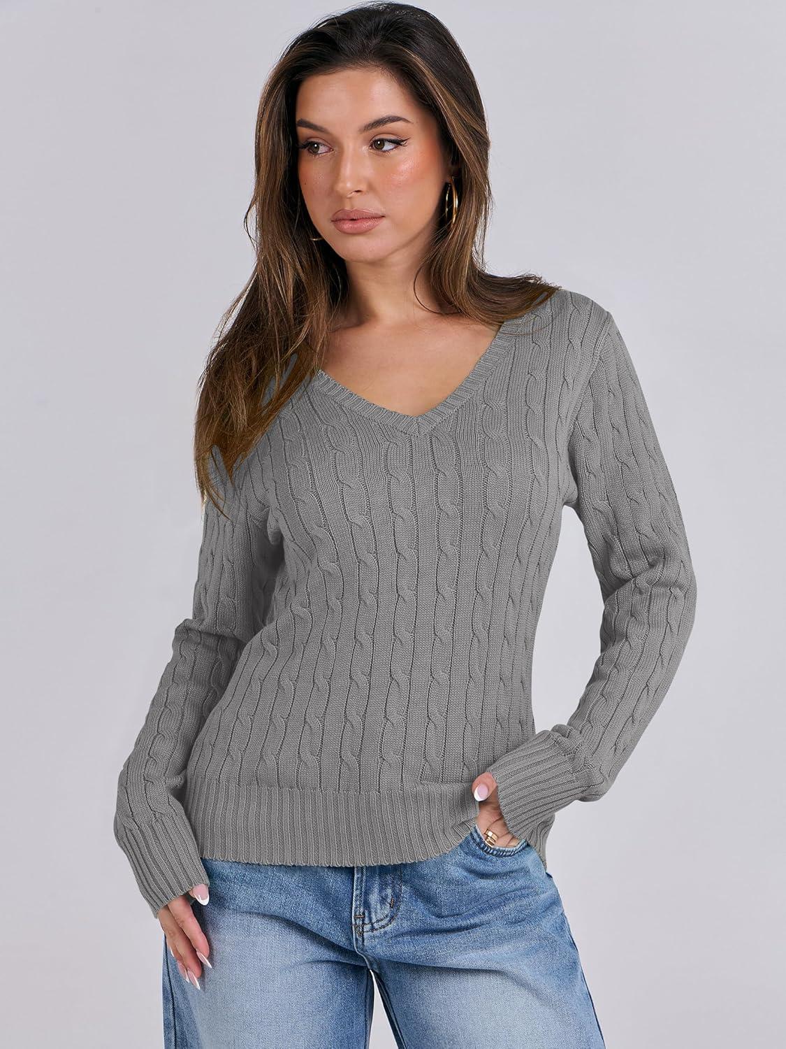 imageANRABESS Womens Long Sleeve Cable Knit Sweater 2025 Fall Fashion V Neck Fitted Pullover Top Business Casual Work Fall OutfitsGrey