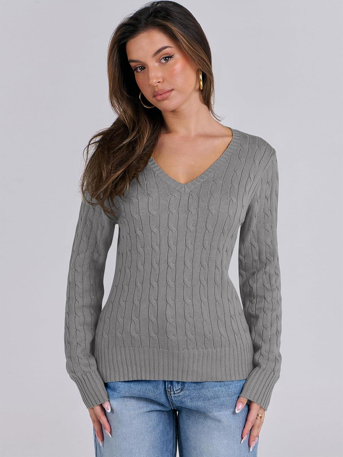 ANRABESS Womens Long Sleeve Cable Knit Sweater 2025 Fall Fashion V Neck Fitted Pullover Top Business Casual Work Fall Outfits(Grey)