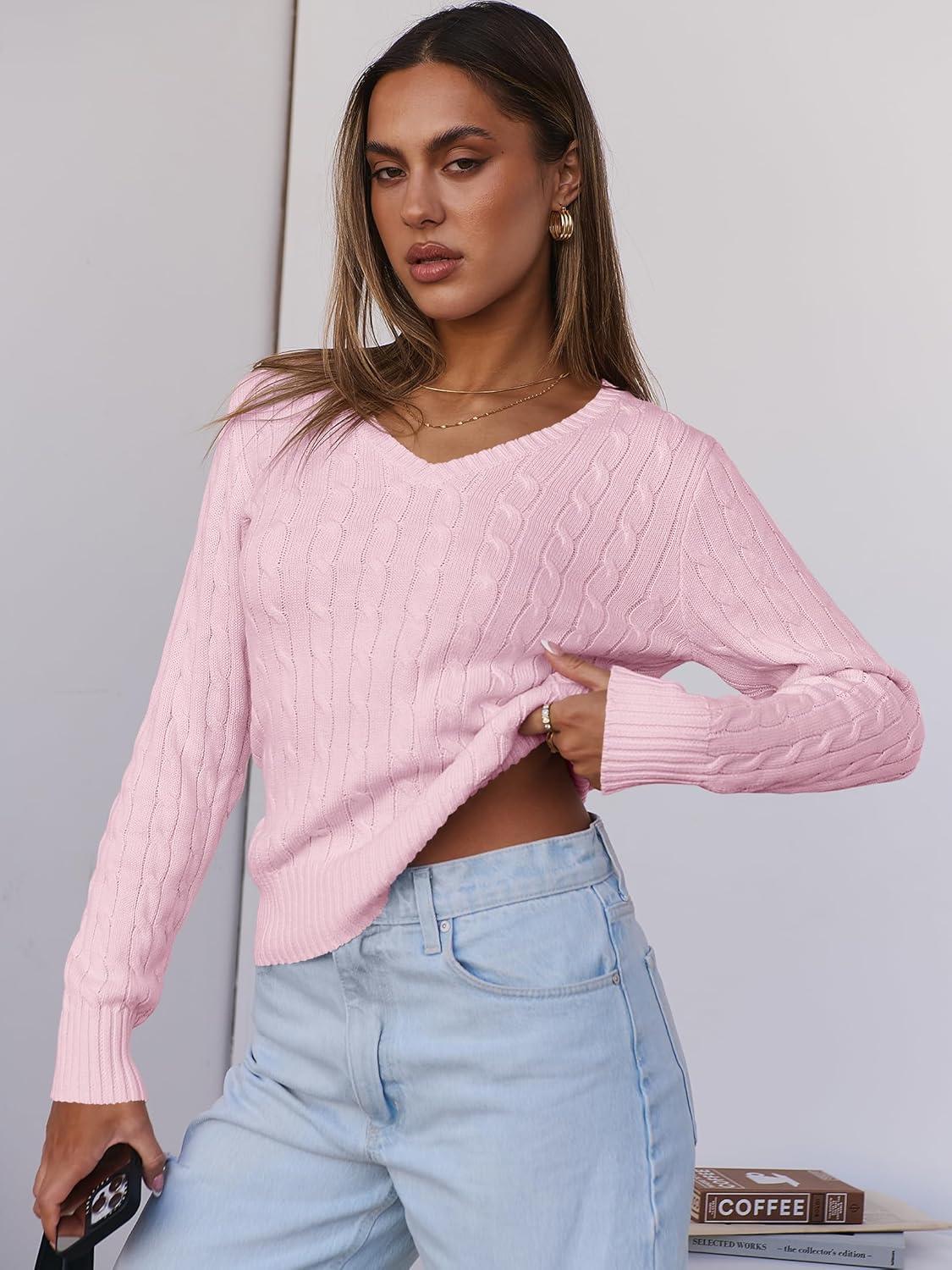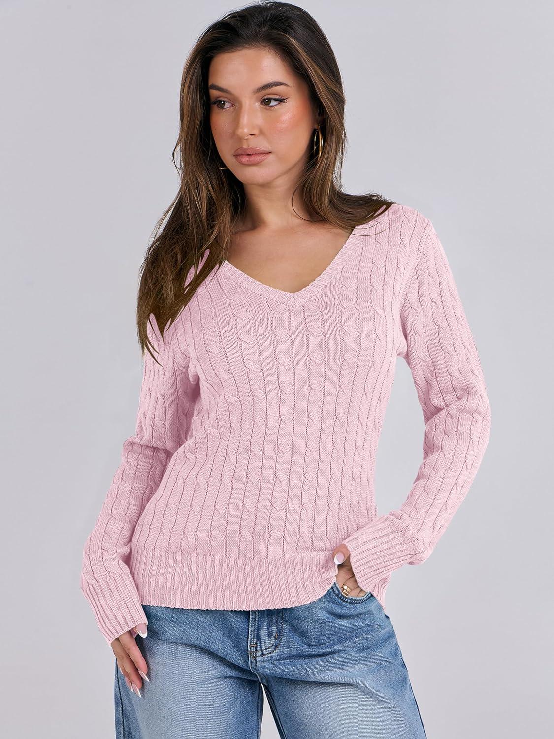 ANRABESS Womens Long Sleeve Cable Knit Sweater 2025 Fall Fashion V Neck Fitted Pullover Top Business Casual Work Fall Outfits(Pink)