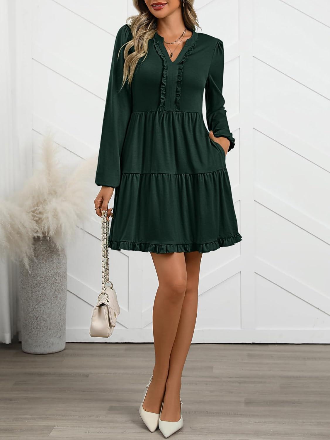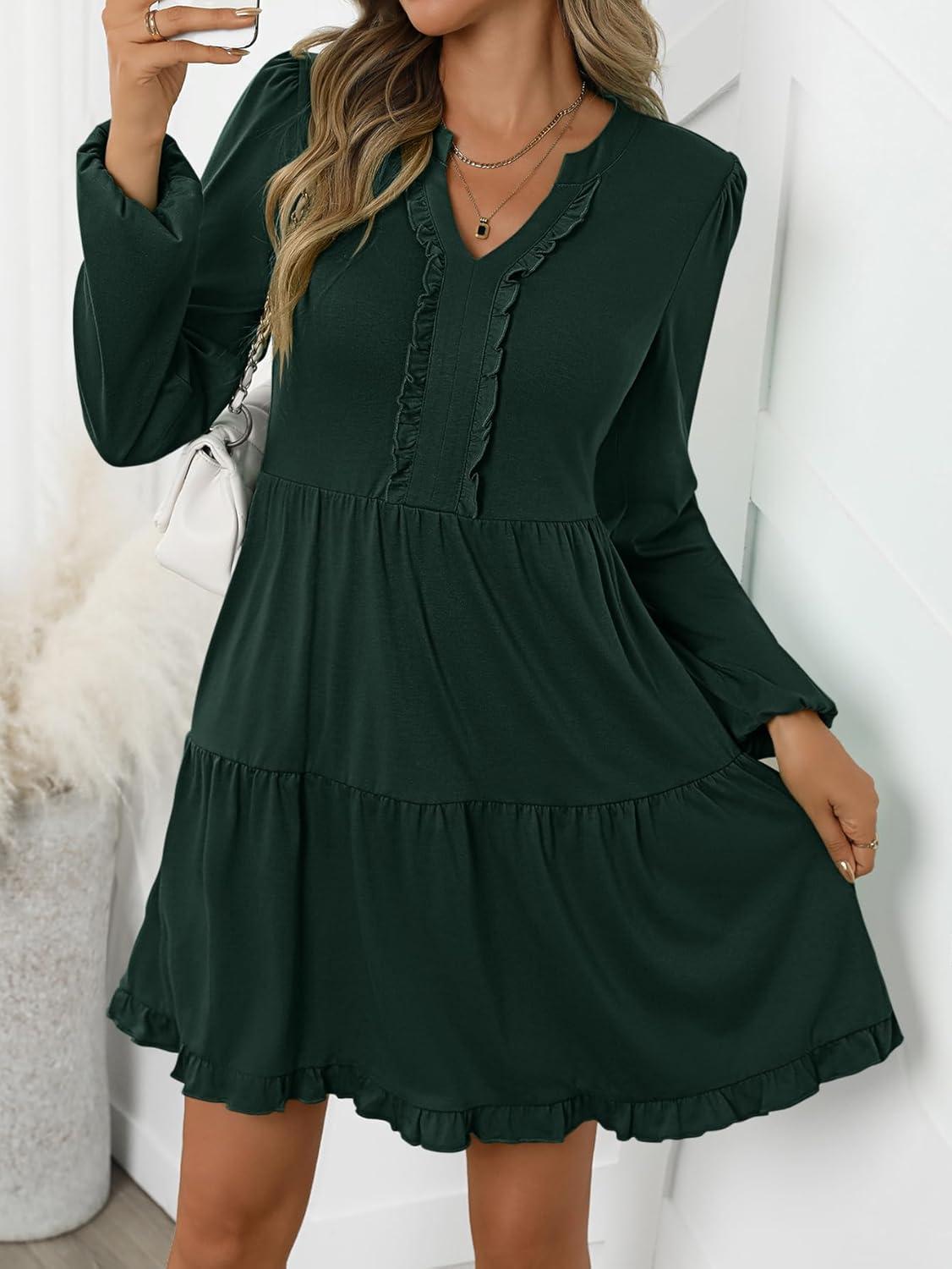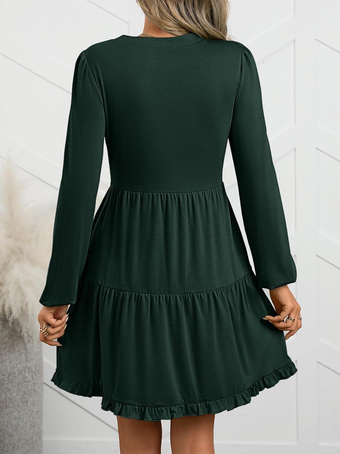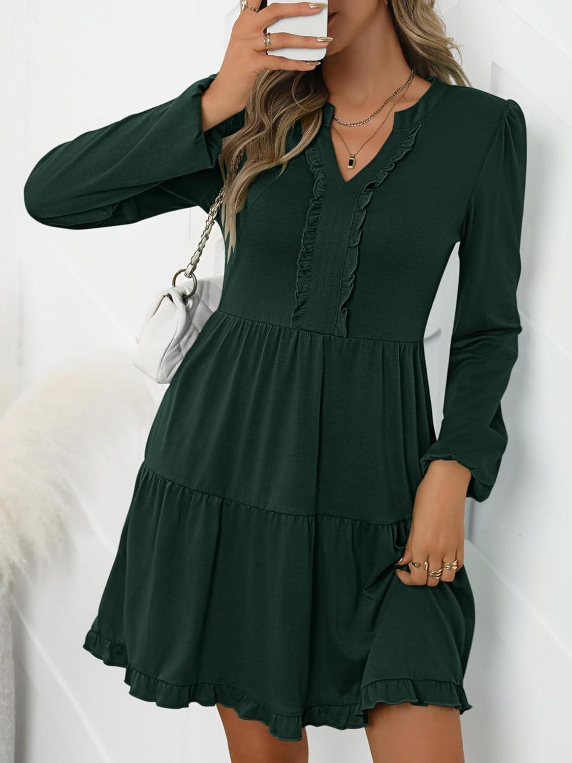 ANRABESS Womens Long Sleeve Dress 2025 Fall Casual V Neck Tiered Flowy Swing Short Mini Dresses Beach Travel Vacation Outfits(Deep Green)